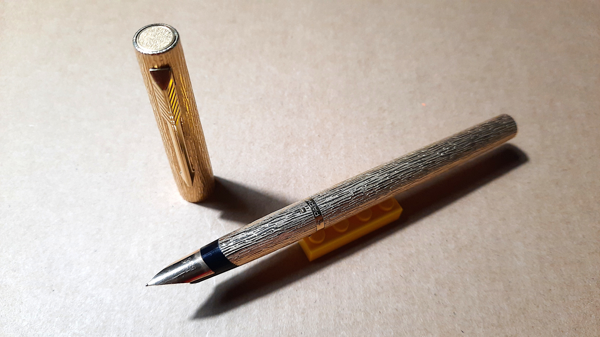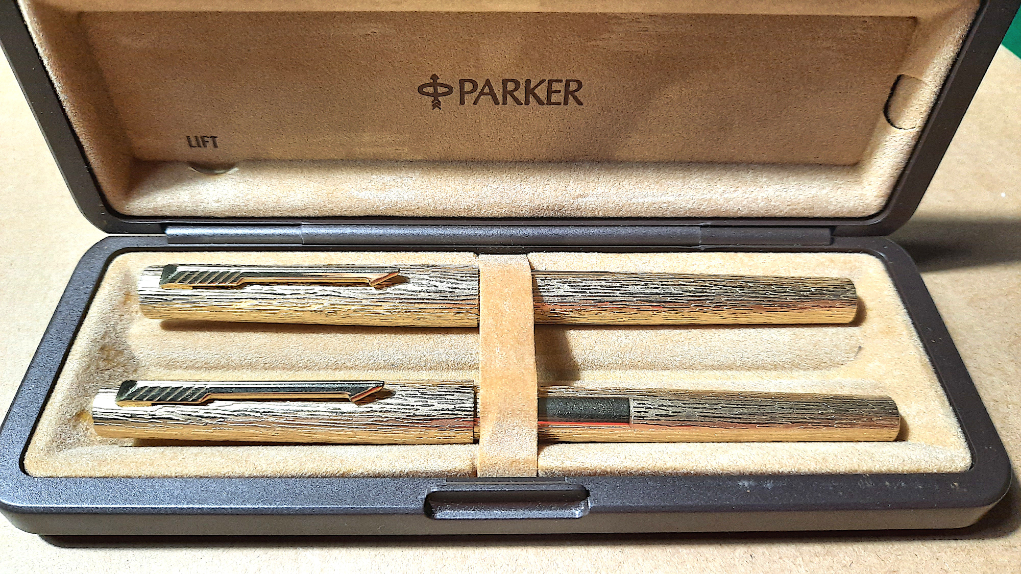 La Parker 105 nasce in Inghilterra nel 1979 (su tutte le penne è riportato "make in England"), è costosa anche per allora ed il modello standard è in laminato oro. Uscirà in seguito una versione più economica in acciaio ed una ancora più ricca in argento di cui non ho mai visto traccia (se le trovate postate delle foto!).