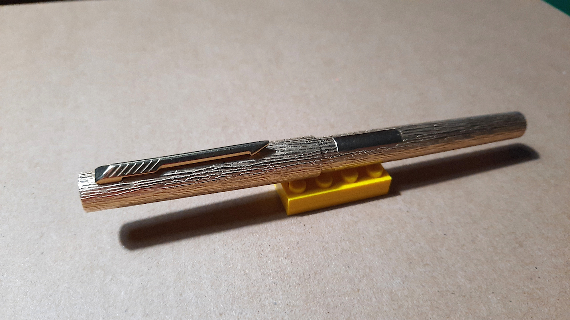 Non saprei come definire la particolare finitura della penna che non ho ritrovato in altri esemplari (vi prego di segnalarmelo) prendo spunto da come la chiamano gli inglesi "bark finish", finitura a corteccia. In questa finitura, che rappresenta la più diffusa, c'è uno spazio liscio per un'incisione.