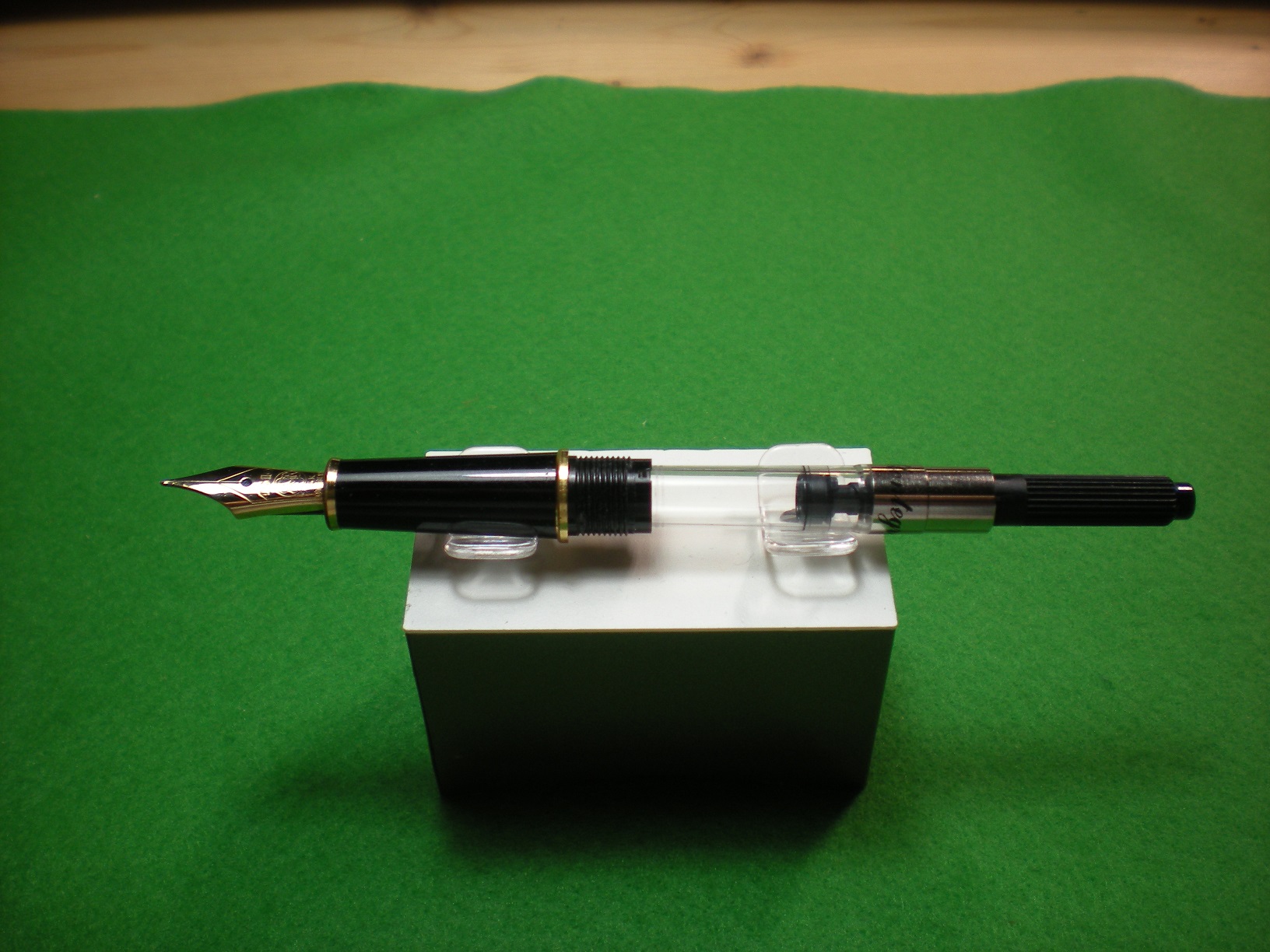 Salve a tutti, esaurite le cartucce che avevo a disposizione e per non dipendere da loro ho dotato questa graziosa MB 144, di recente acquisizione, di un convertitore. L'attuale convertitore di produzione MB non si inserisce e allora ho optato per uno della Faber Castel che, oltre a garantire una buona tenuta sull'accoppiamento, è munito di molla rompi liquido. Questo accessorio facilita lo scorrimento dell'inchiostro verso il pennino.