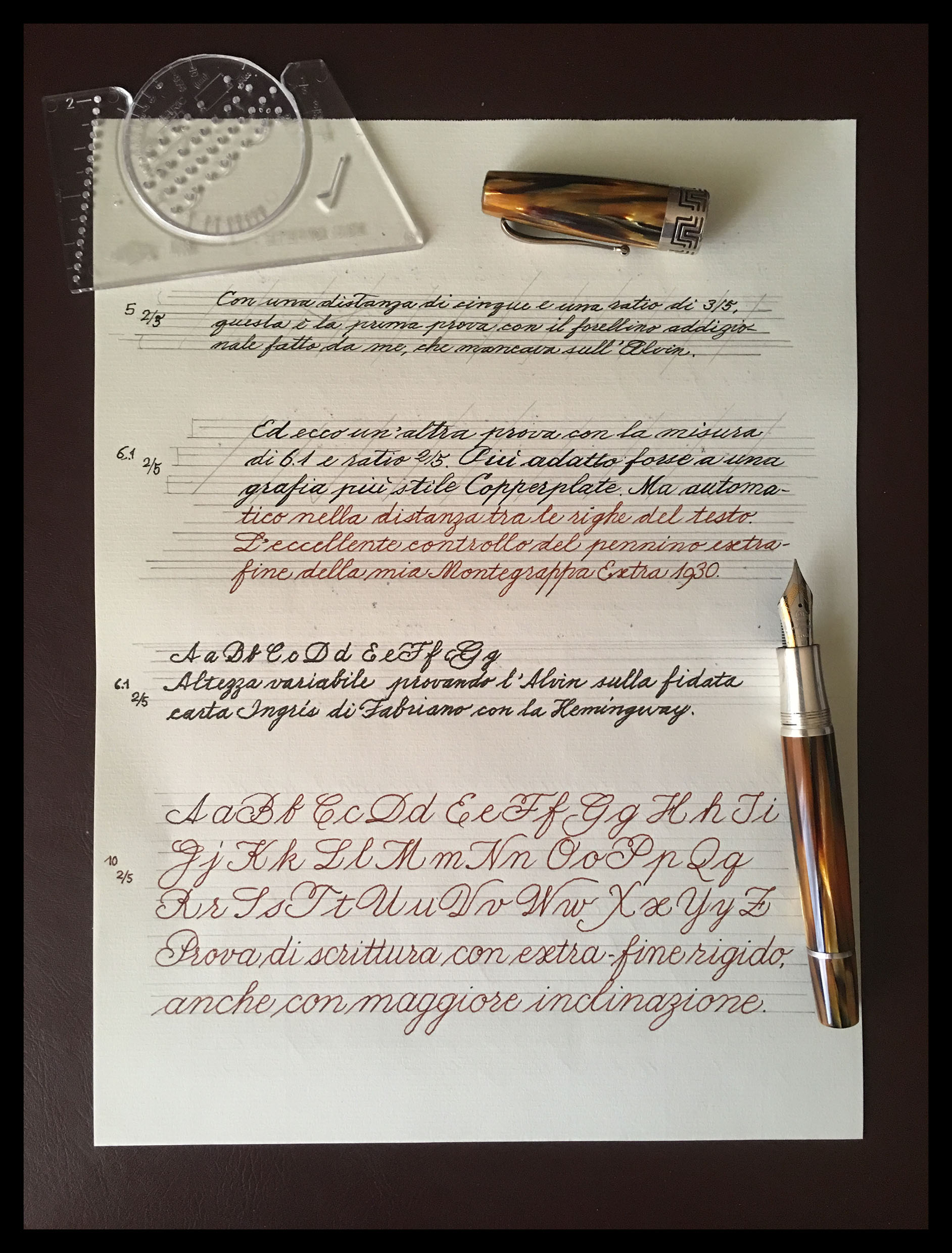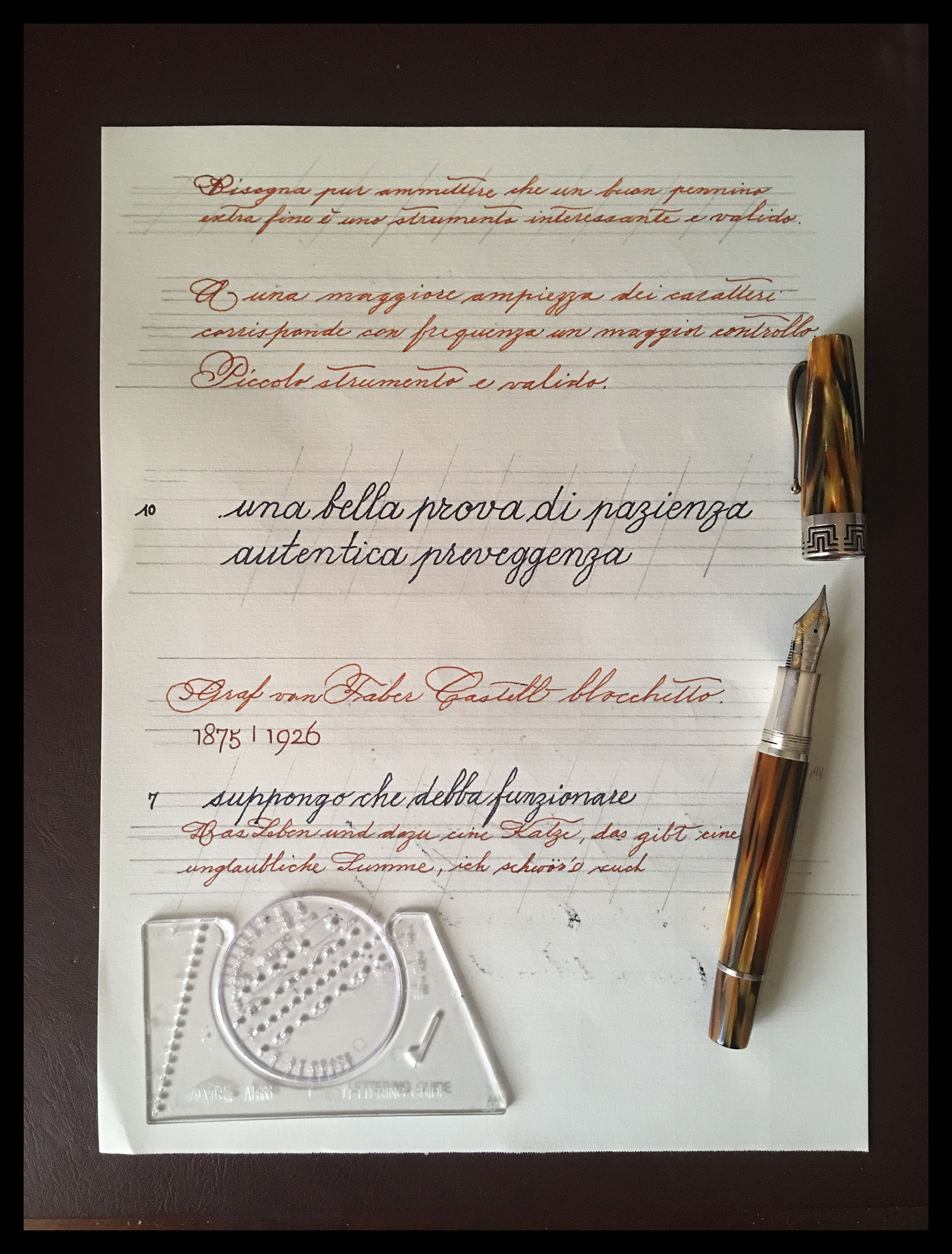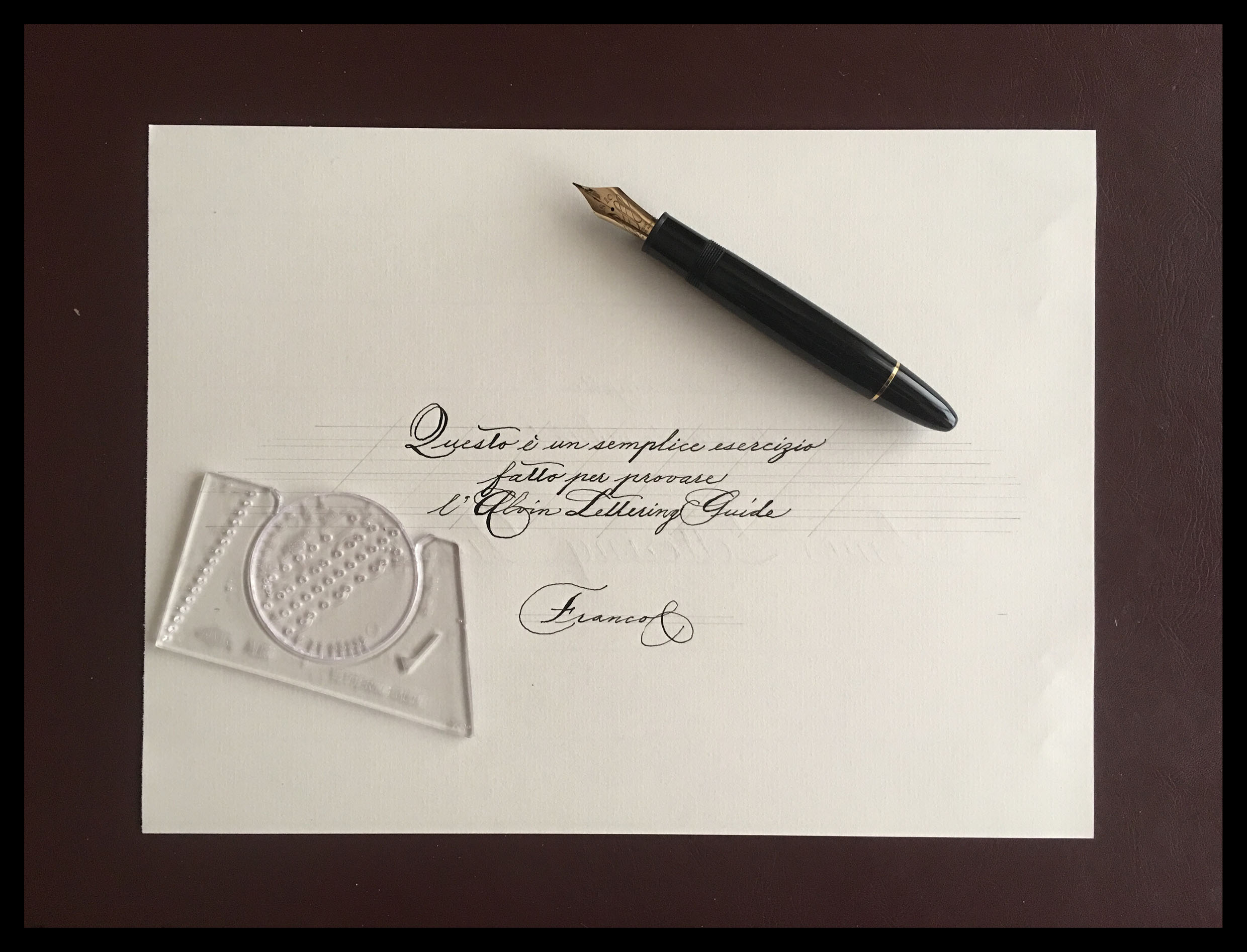 La storia di questo "lettering guide" é iniziata pochi giorni prima che mia moglie ritornasse dalla Germania a fine agosto. Avevo pensato di farmi portare a casa un libro di calligrafia, e lo stavo cercando su Amazon, quando al piede della pagina, tra le finestre dei "consigli automatici", ho notato un oggettino di plastica trasparente, onestamente bruttino, chiamato Lettering Guide e suggerito per i calligrafi... Per cinque Euro, ho pensato... e ho schiacciato il bottone di "Acquista". Poi, mi sono dimenticato dell'oggettino di plastica fino a che Elvira ha disfatto le valige una volta ritornata in Costa Rica.