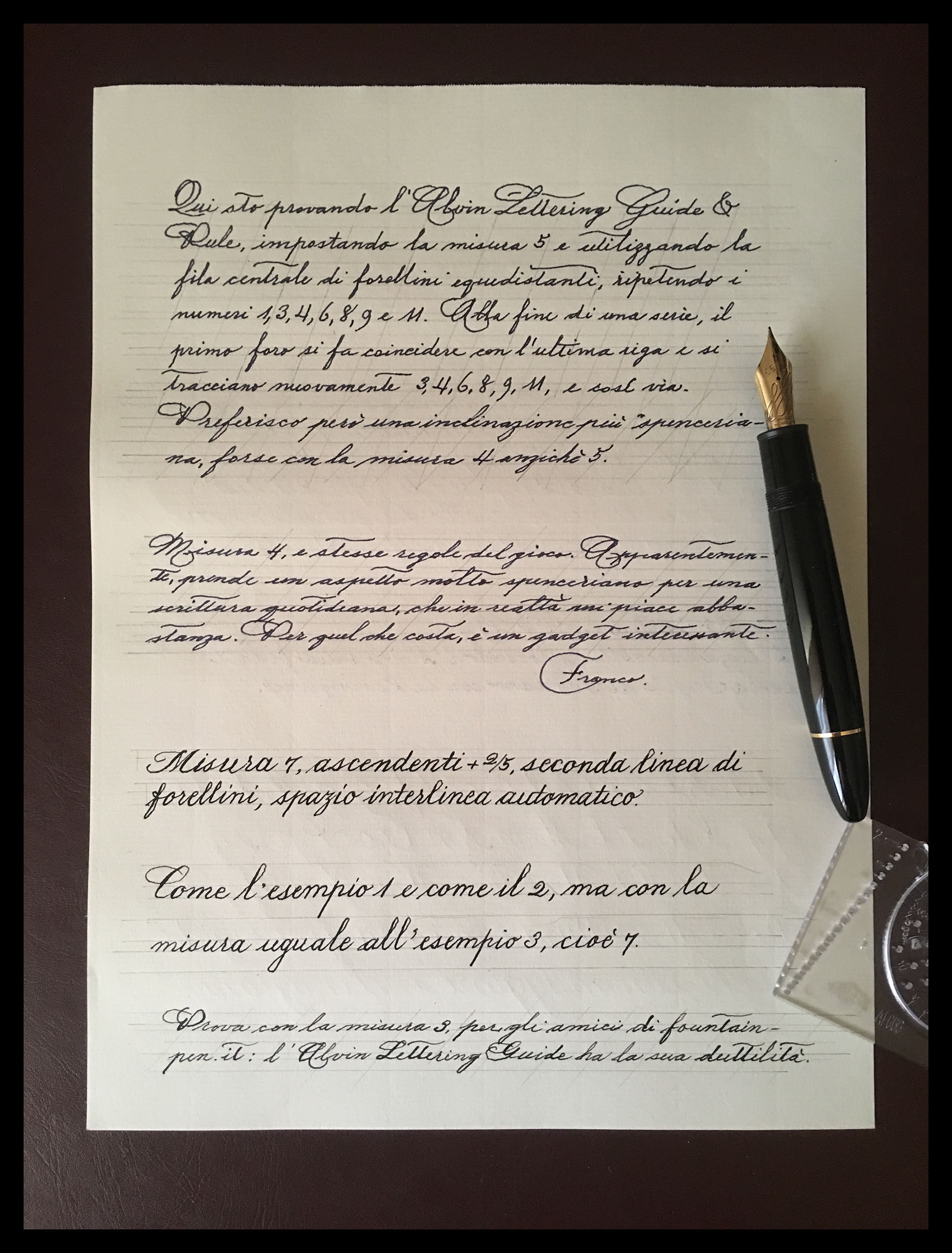 Presenta un sistema graduato, onestamente più difficile da descrivere che da utilizzare, per tracciare linee equidistanti di altezza compresa tra 1,5 mm e 5 cm, con incrementi di 1/32 di pollice (circa 8/10 di millimetro, bah...), oppure con distanze tra le linee studiate per avere le maiuscole 2/5 oppure 1/3 più alte delle minuscole. Io, e suppongo la maggior parte degli amanti della calligrafia, non facciamo uso di queste scale "ragionate", ma i forellini equidistanti davvero semplificano la vita!