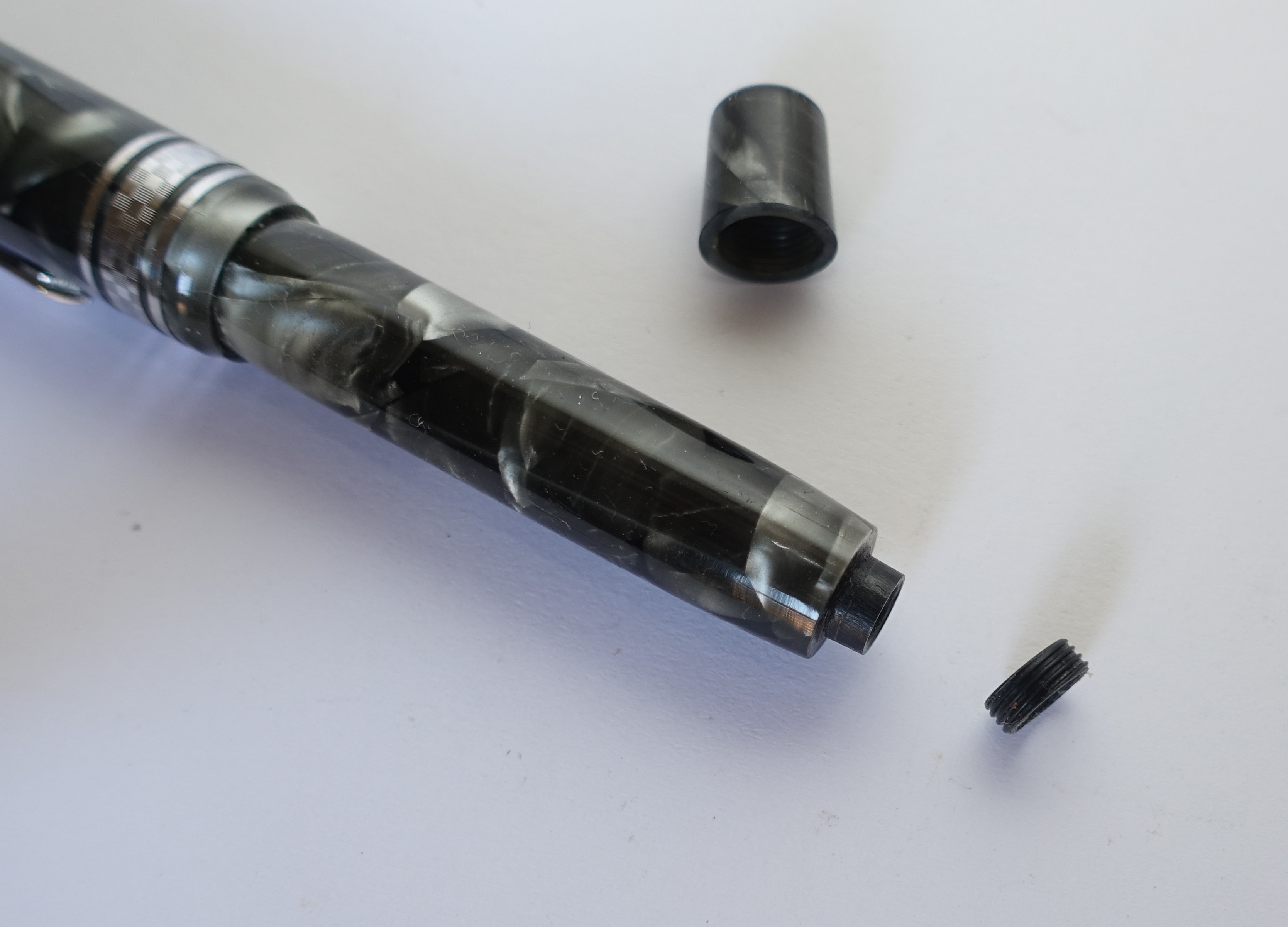 Ho trovato un'altra Zemax Atala con la filettatura posteriore rovinata, ho pensato di fare un innesto ricavando la boccola da un puntale rotto di una Waterman, dopo vari tentativi con la cianoacrilica e poi con la gommalacca mi sono arreso per la scarsa tenuta meccanica.