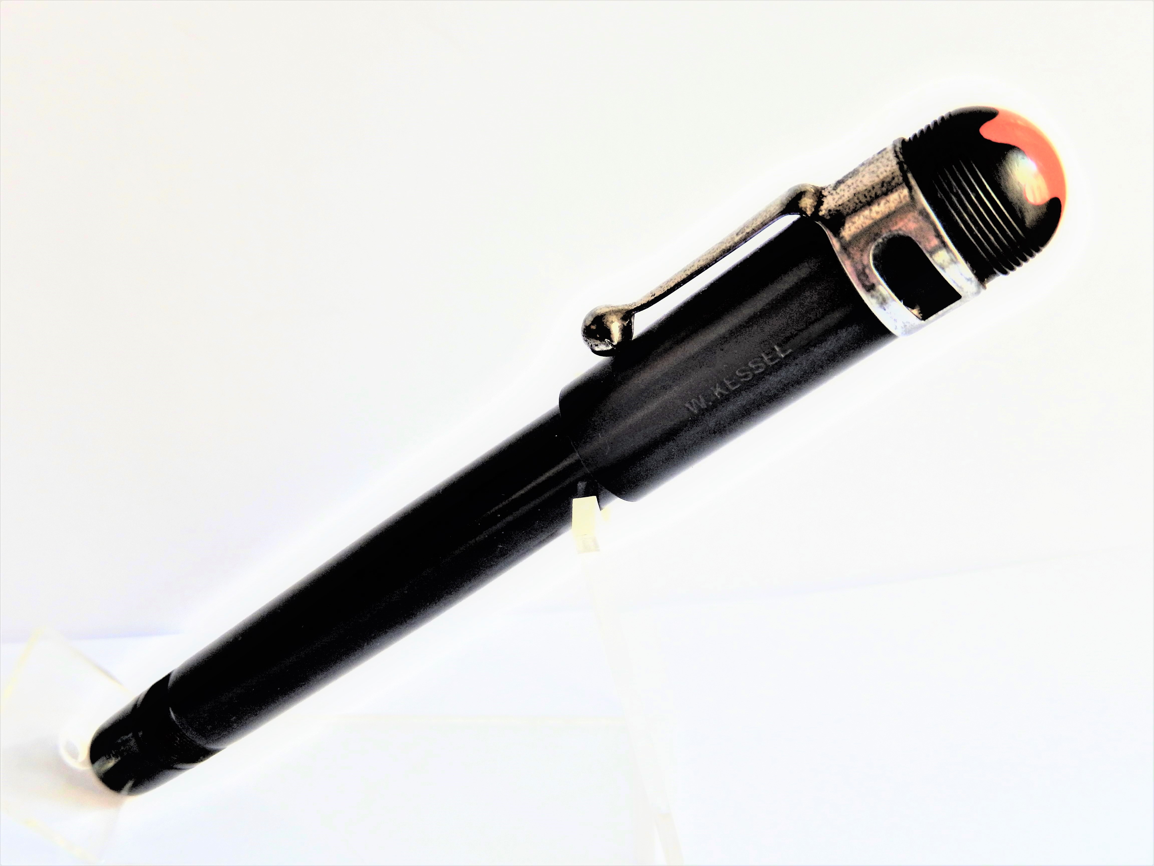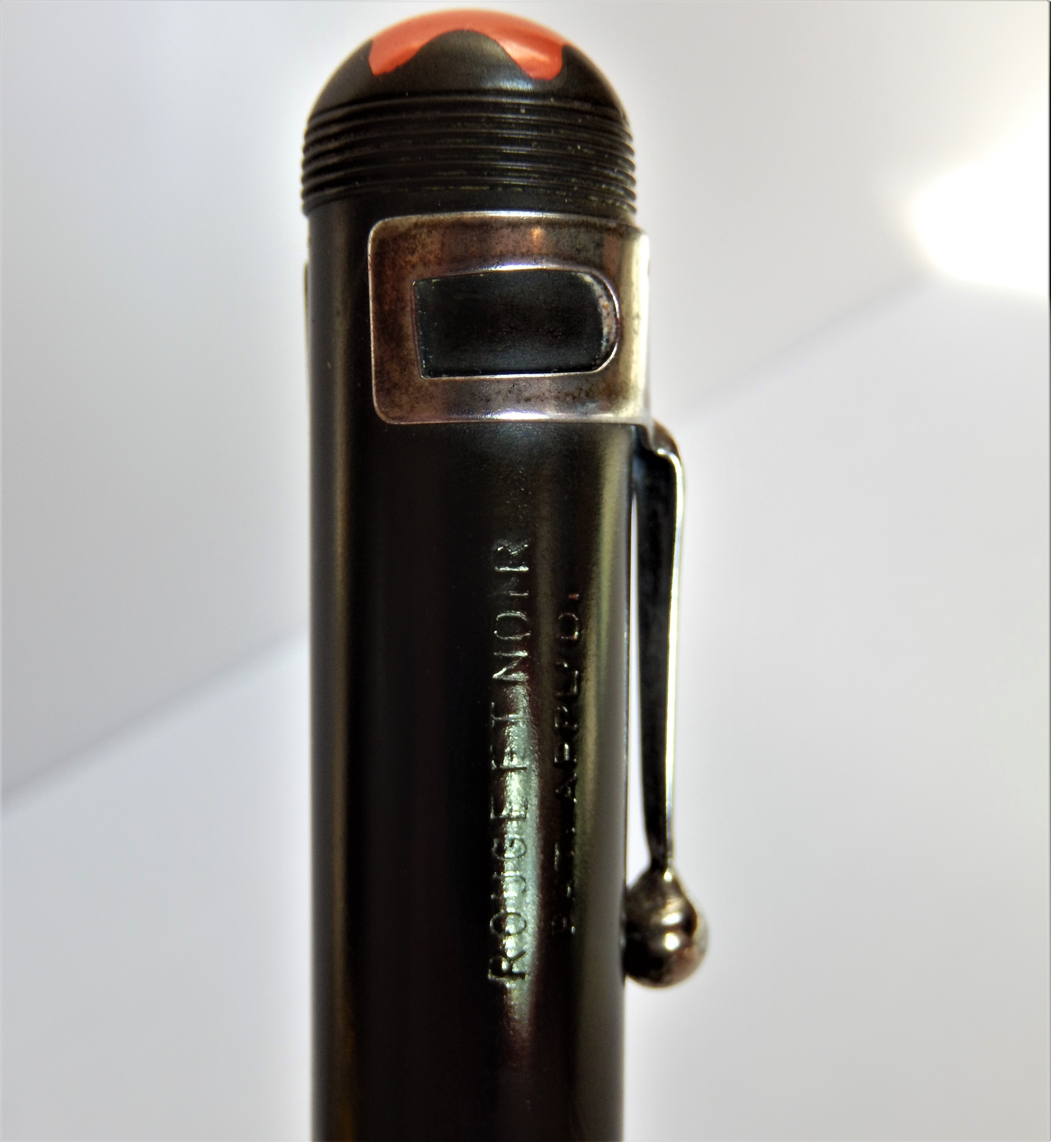 Purtroppo il cappuccio è stato, probabilmente a seguito di qualche frattura sul labbro, " accorciato" di 5 o 6 millimetri, ma , malgrado questa menomazione, mantiene ai miei occhi il pregio di evidenziare su un fianco una probabile antica appartenenza a Walter Kessel, proprio colui che nel 1913 registrò in Italia il marchio Rouge et Noir, di cui fu verosimilmente anche concessionario per l'Italia ( vedi foto in alto ). Ricordo anche, e ne parlai presentando la" penna del Re di Maggio " che Kessel, a conferma di suoi stretti rapporti con la Montblanc, aveva nel 1912 registrato il marchio "Monterosa", che qualche anno dopo entrò nella galassia Montblanc.