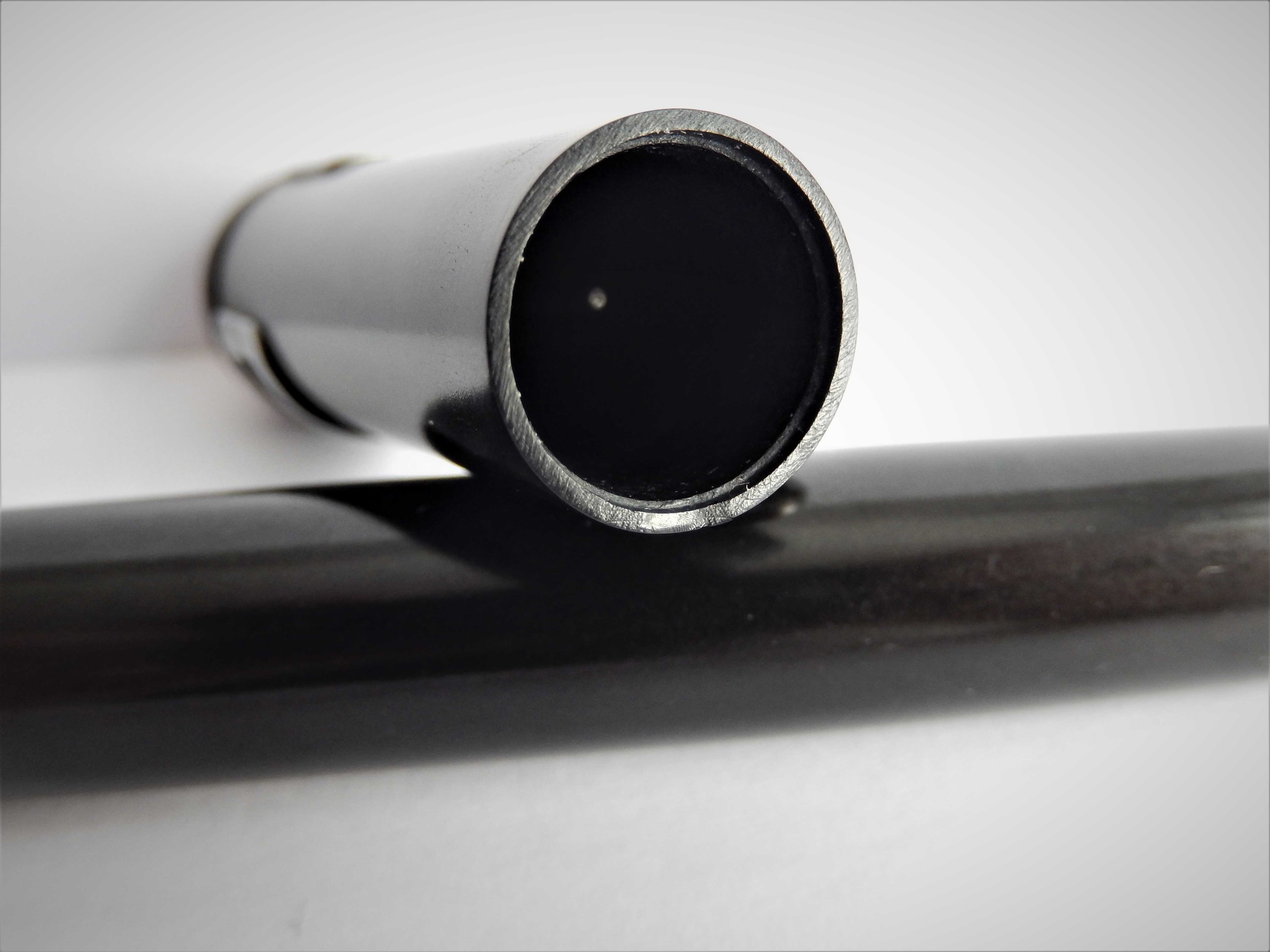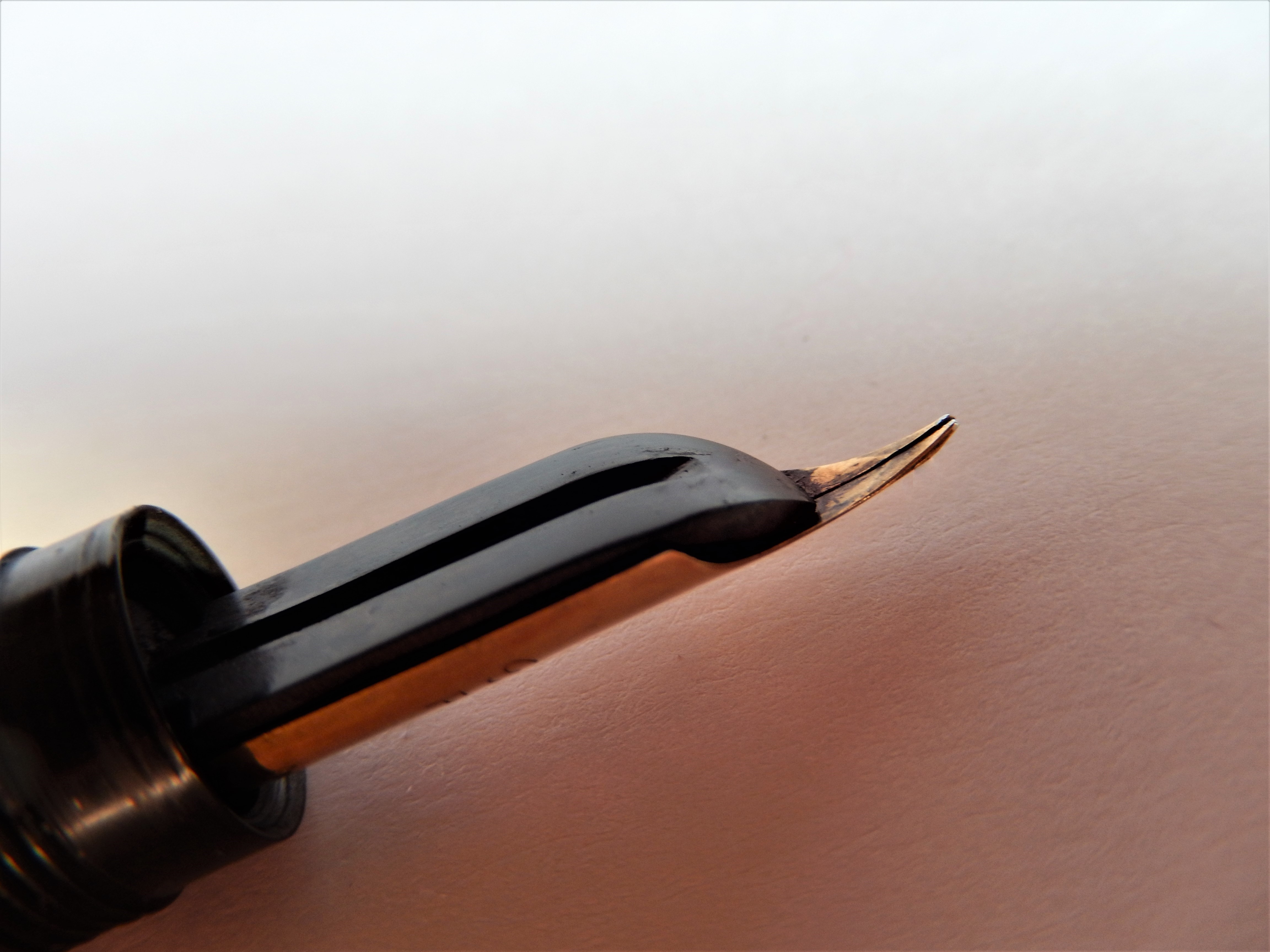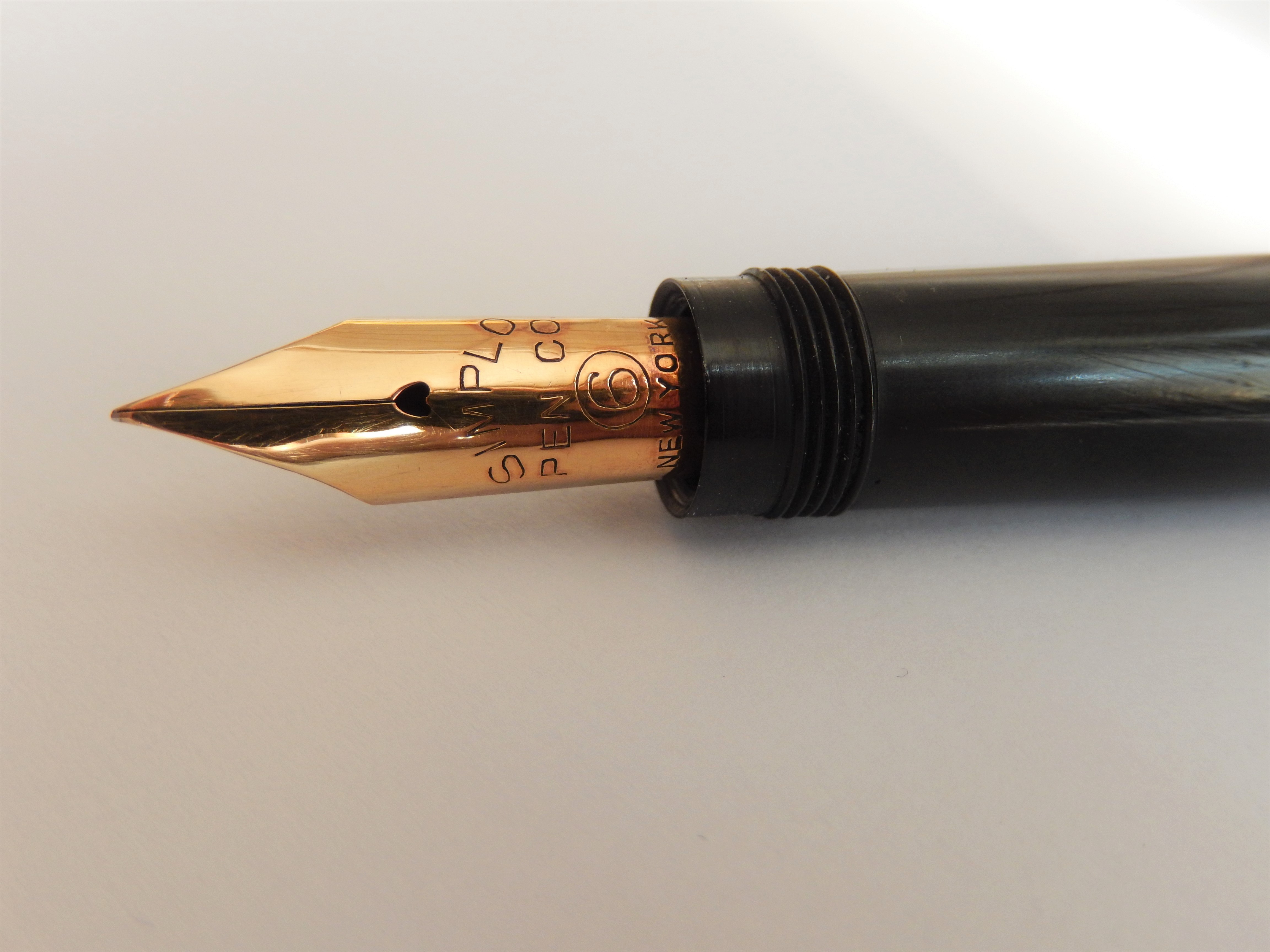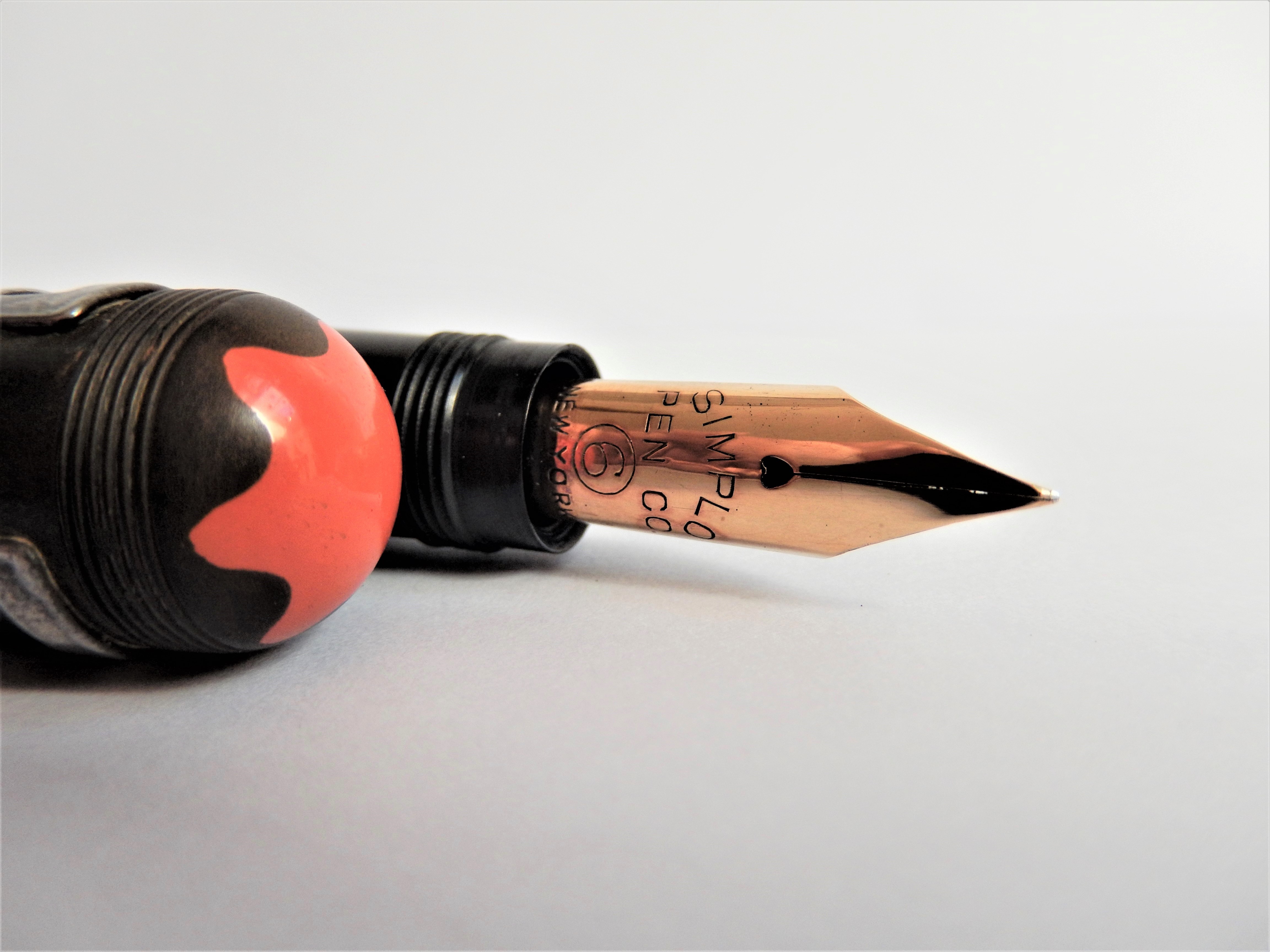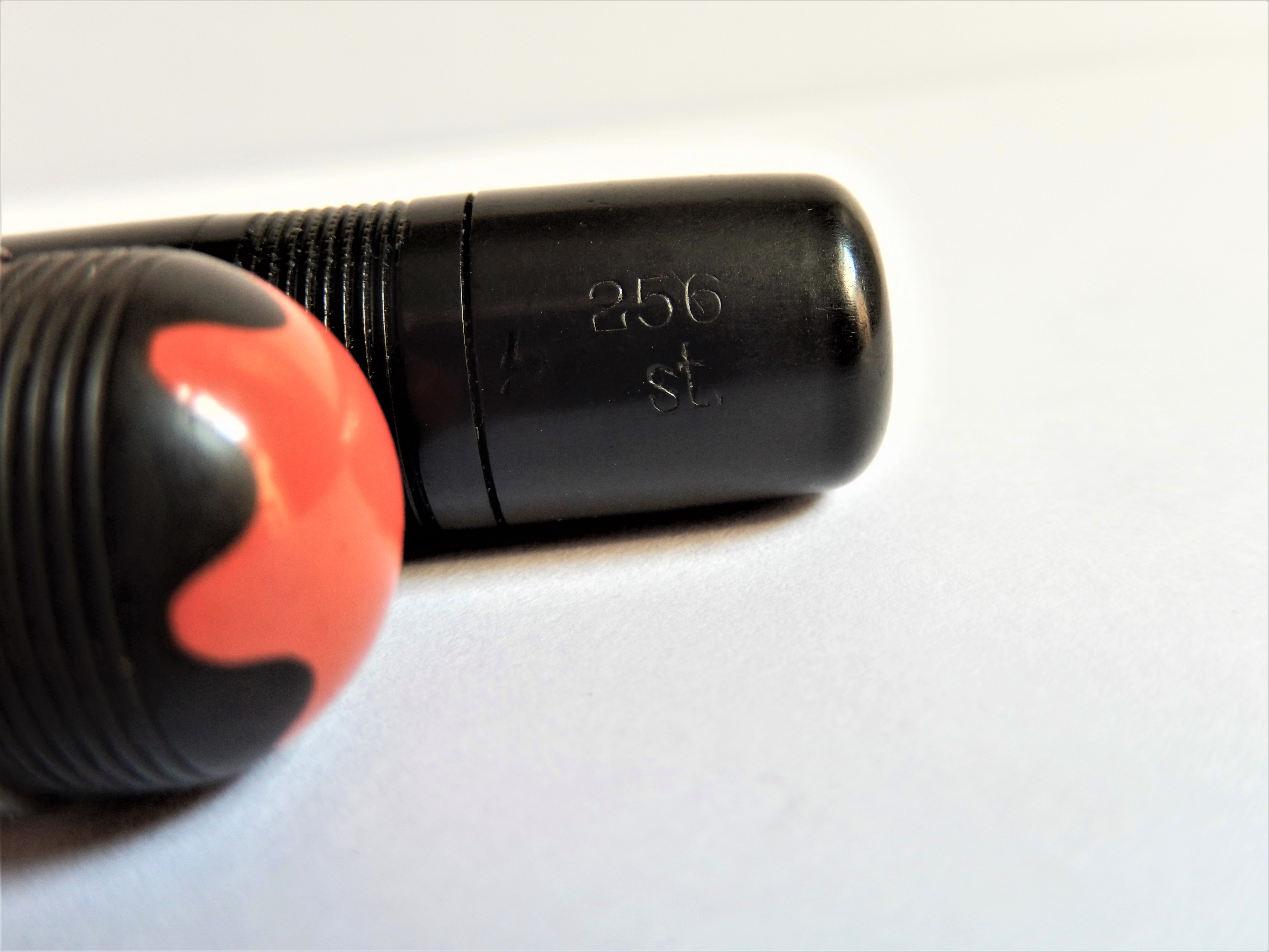 Sul fondello della penna troviamo la primissima numerazione dei modelli dell'epoca, su tre cifre seguite da st ( stück forse ?). Qui la numerazione è 256 dove il numero 6 attribuirei senz'altro alla misura del pennino, mentre se qualcuno potesse fornirmi elementi sugli altri due numeri ne sarò felice. Questo tipo di numerazione, per quel che ho potuto vedere, scomparirà già a cavallo della prima guerra mondiale. Ma la vera star di questa penna è senz'altro il raro pennino marcato su quattro livelli " Simplo/ Pen Co/6 chiuso in un cerchio/New York ", ricordando che nei primissimi anni, fra il 1909 ed il 1913/1914 la casa fece produrre i suoi pennini in America dalla Collins e in parte in Inghilterra da Perry. Fu con l'arrivo della prima guerra mondiale ( luglio 1914) che la Montblanc dovette diventare autonoma e prodursi i pennini in casa, cessando di acquistarli da paesi nemici. Oltre e al di là del valore storico il pennino è giunto a noi in grandi condizioni, con una abbondante dose di iridio e una notevole flessibilità, che possono garantire totalmente il pieno piacere dello scrivere.
