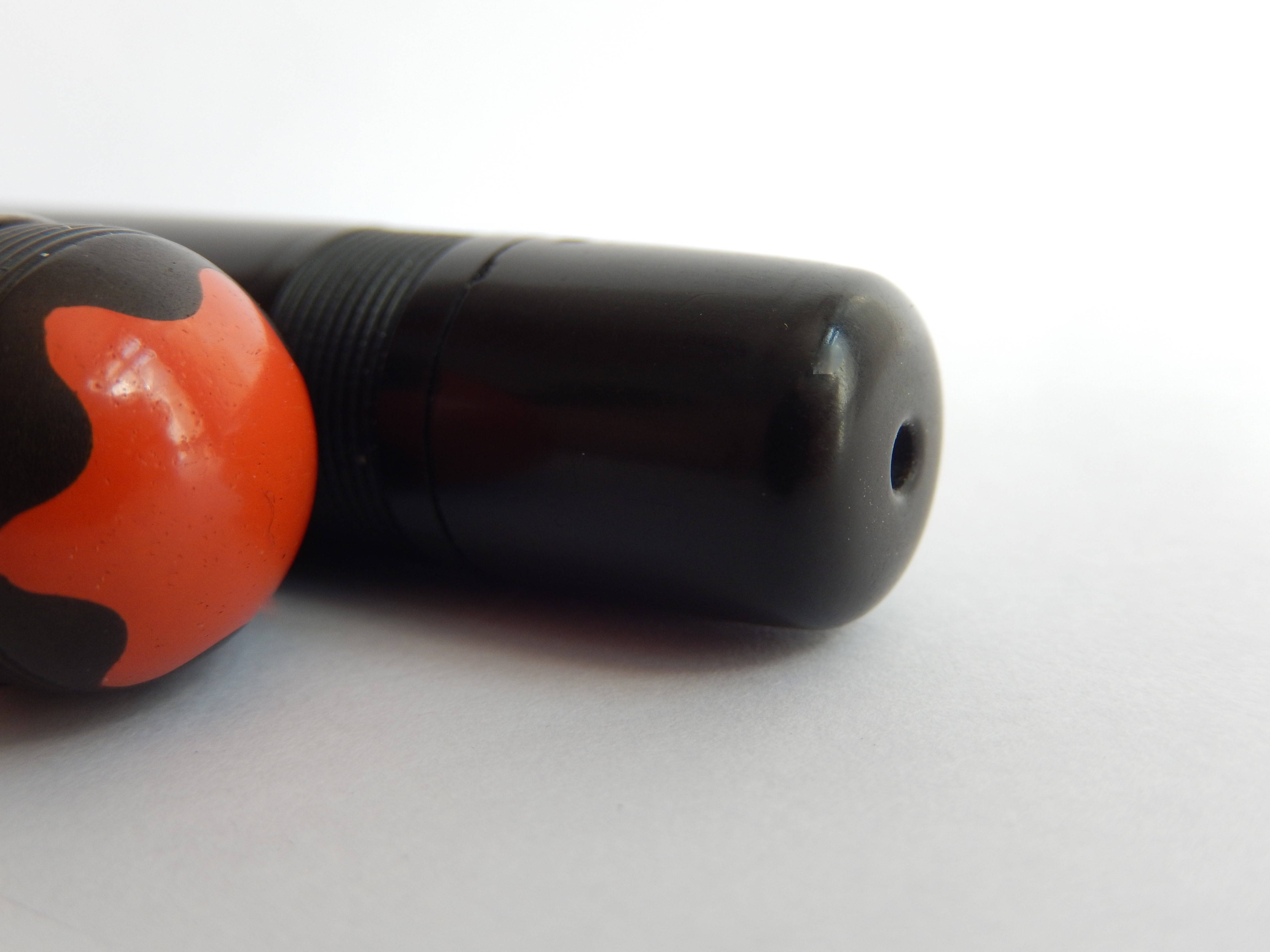 Sull'altro lato del cappuccio appare invece il marchio " Rouge et Noir Pat Appl'D. " Il cappuccio contiene al suo interno un perno metallico che ha la funzione di proteggere il pennino in caso di involontaria uscita dello stesso a cappuccio chiuso, andandosi a poggiare in una fessura presente nell'alimentatore e , a penna calzata, dentro un foro nel fondello. Si tratta di evidenti reminiscenze, e non furono le sole, dell'esperienza lavorativa dell'Ing. Eberstein presso la Moore, che tale sistema, con qualche variante, aveva adottato già nel 1905 circa.
