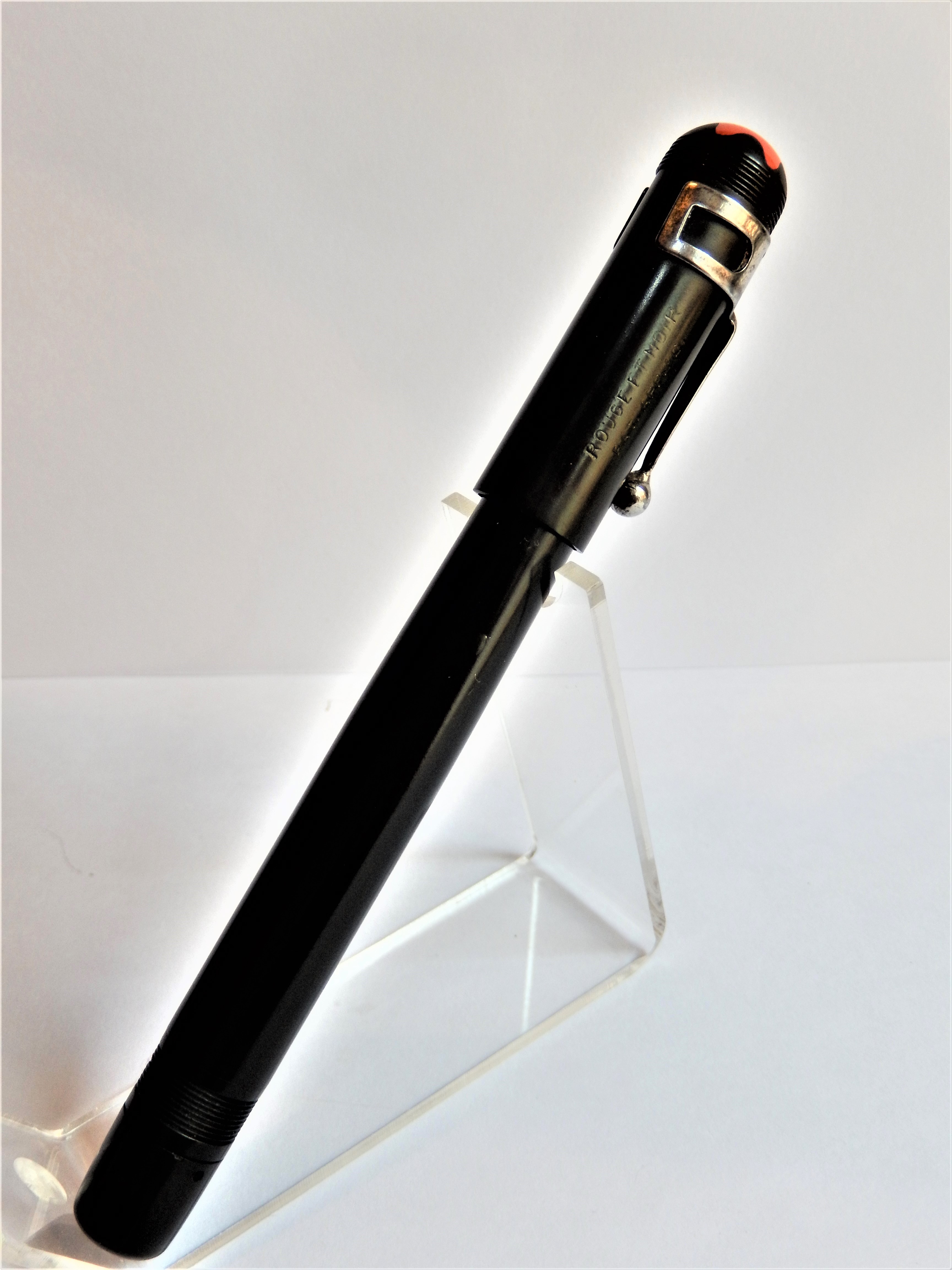 Questa Rouge et Noir risale ai primissimi anni della storia della Montblanc, come rivelano le rigature decorative che sia sul cappuccio che sul corpo sono ancora del tipo orizzontale ( diverranno verticali intorno al 1915 circa), la presenza sul fondello ancora della prima numerazione ( in questo caso 256 st) e inoltre un raro pennino ancora del periodo " americano" , riportante l'incisione Simplo Pen Co New York.