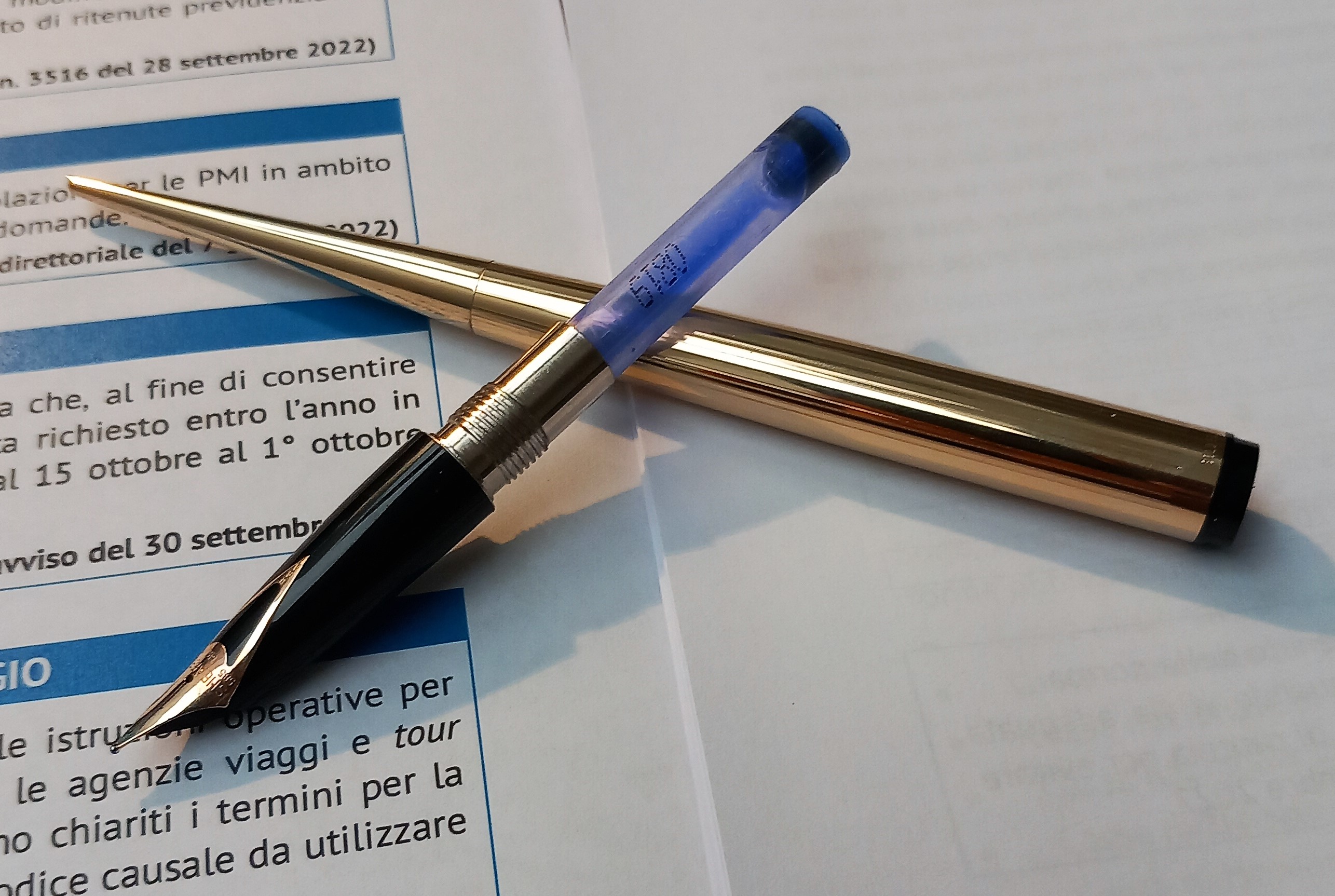 Sono sempre stato "innamorato" di questo pennino fino alla conseguenza di avere sei penne compresa la PFM. Sono tutte cariche e giorno dopo giorno, a rotazione, le uso. Con quelle più recenti sto consumando la riserva di cartucce poi utilizzerò il convertitore che mi permetterà di alternare gli inchiostri.