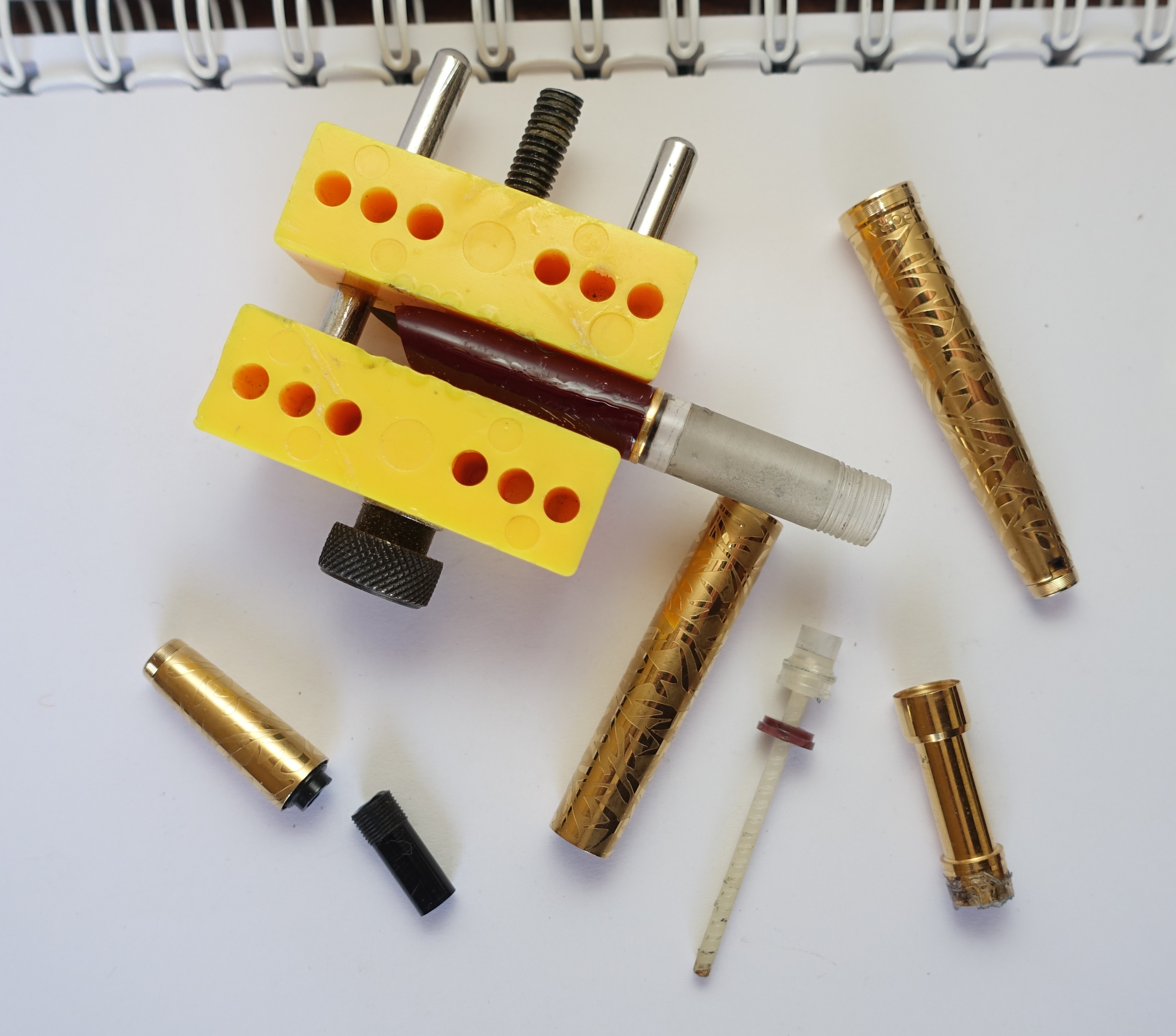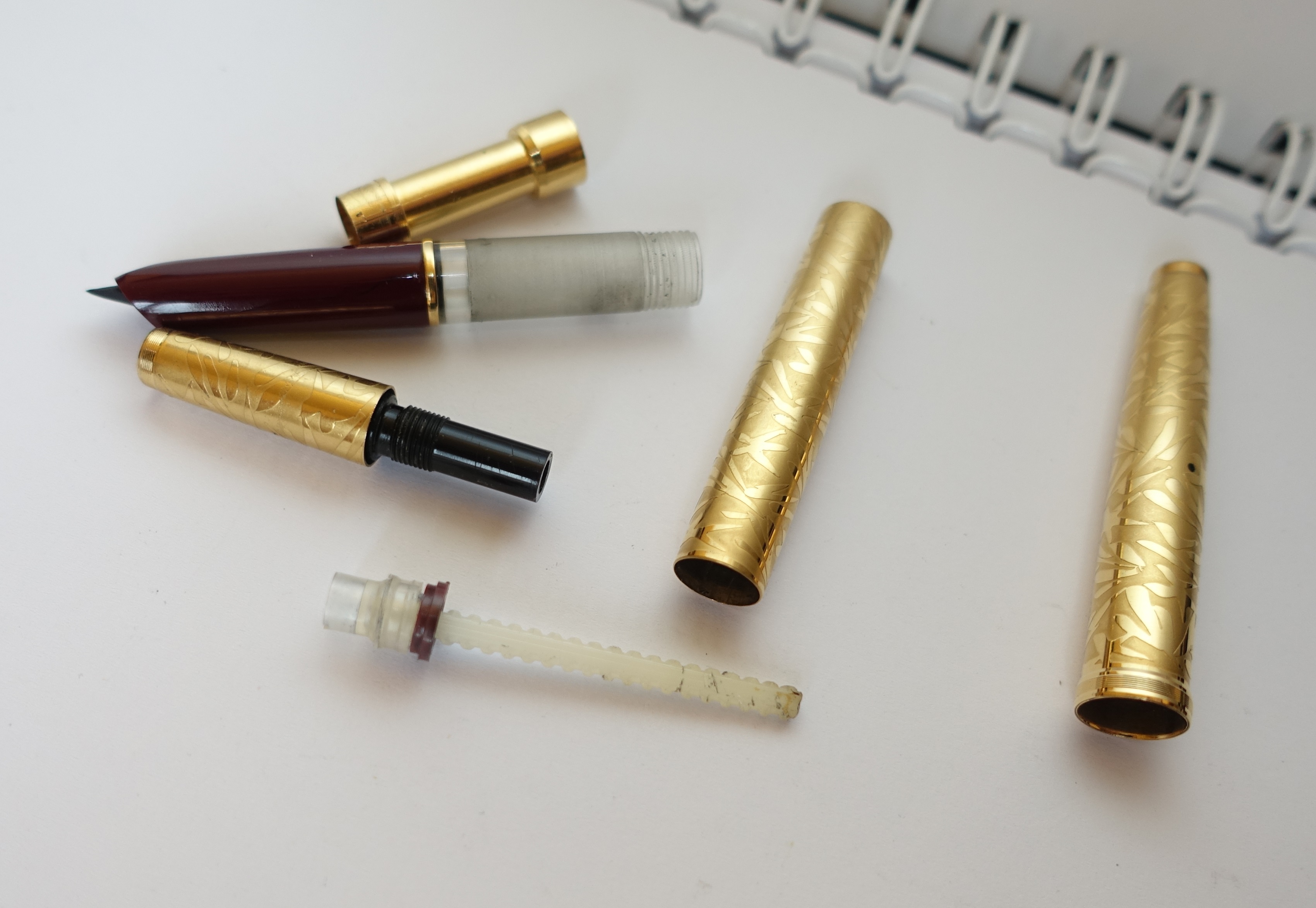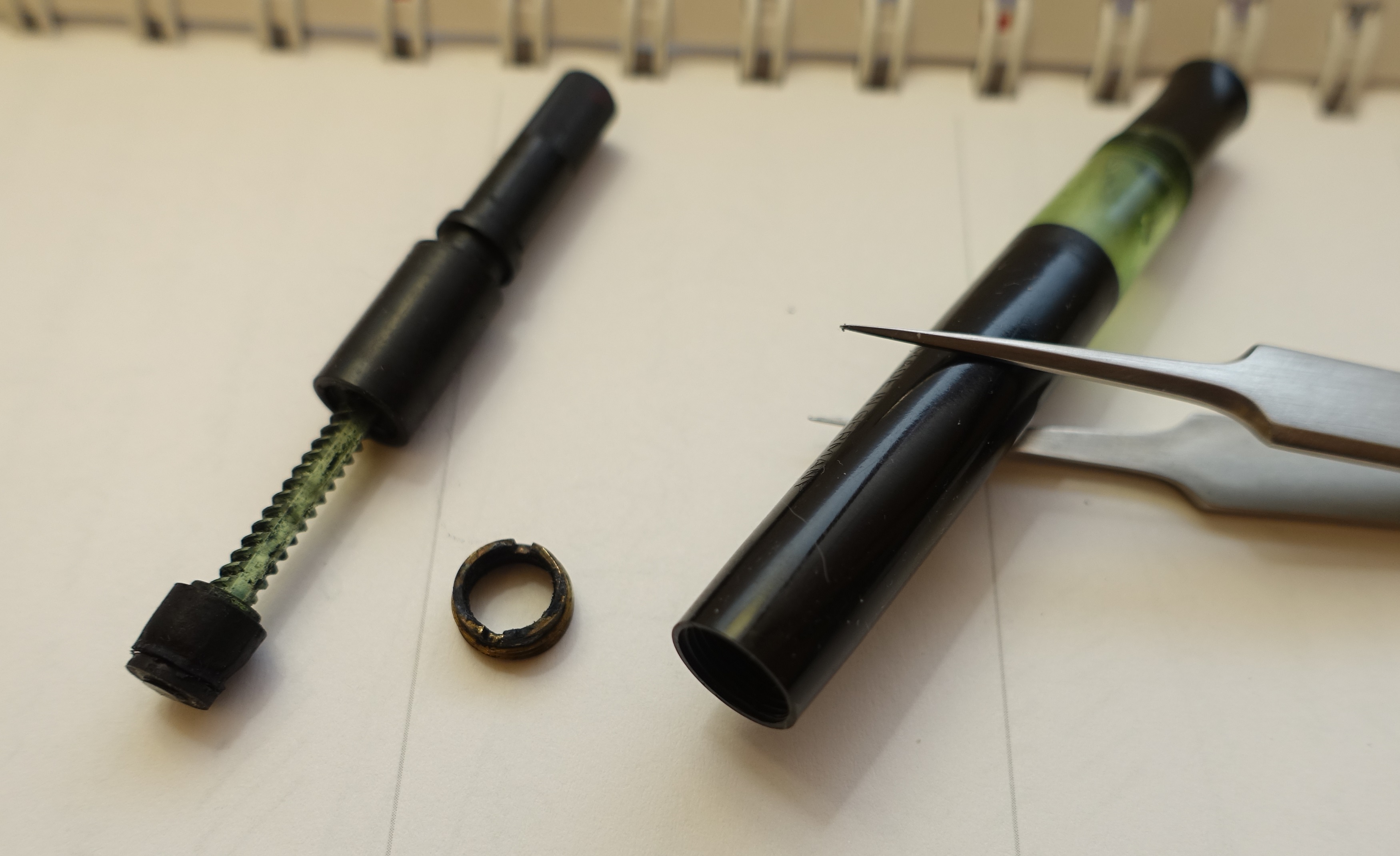 Devo smontare il pistone a questa Artus e non capisco come si smonta, la sezione non si muove, deve essere incollata tipo Pelikan, sul retro non c'è niente che si possa svitare, la manopola a vite funziona regolarmente e quando arriva a fine corsa sui due estremi gira a vuoto, sapete come si smonta?