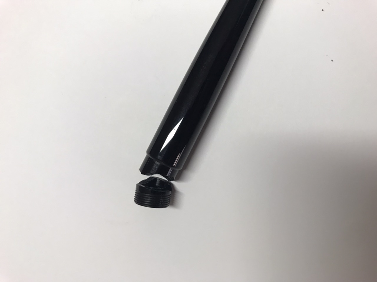 Cadendo si è spezzata all’altezza dell’impanatura del corpo, cappuccio , pennino e sezione non hanno avuto conseguenze. Per fortuna sono riuscito a svitarla perché la rottura non è dritta e quindi faceva presa, sembra che la parte filettata sia a posto e la rottura sia poco sopra.