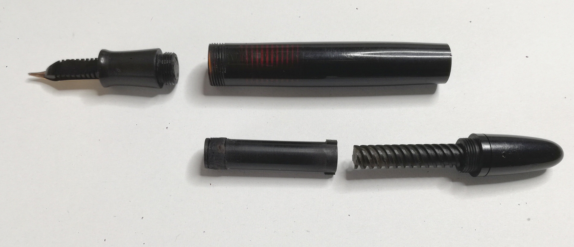 Per quanto riguarda il pistone ha evidentemente la guarnizione in sughero che non fa più tenuta. Andrebbe aperta, rimosso l’alberino su cui si trova la guarnizione e rifatta con del sughero. Alternativamente puoi provare a sostituirla con degli o-ring di misura adatta. Purtroppo ogni penna è fatto a modo suo, bisogna capire come smontarla. Se però metti delle foto magari qualcuno dei nostri tecnici la riconosce e ti può guidare.