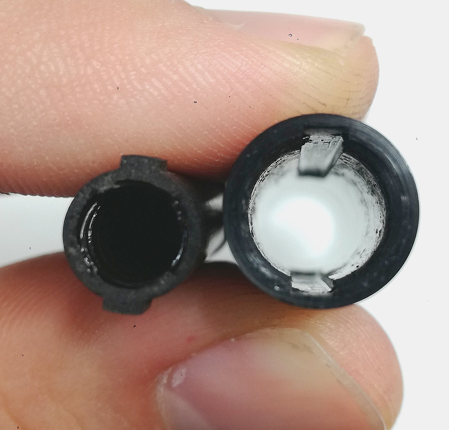 - manca la porzione superiore del tappo, dove appare esposta una filettatura interna; questo ha lasciato libero l'alloggiamento della clip che evidentemente veniva bloccata dalla parte superiore mancante che veniva avvitata.