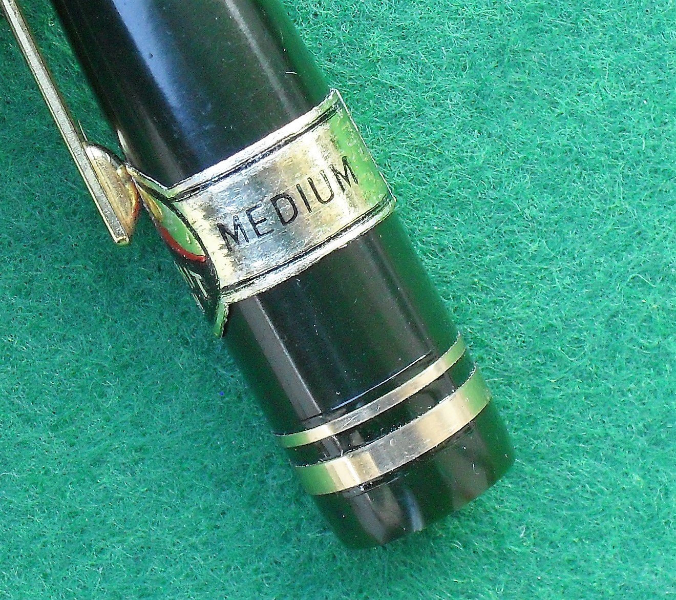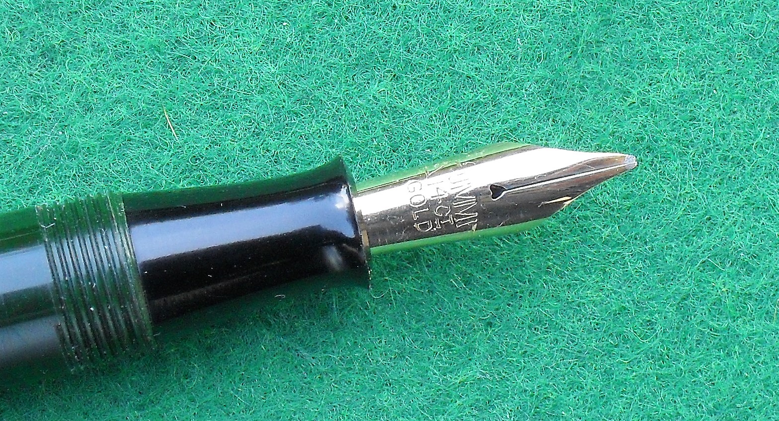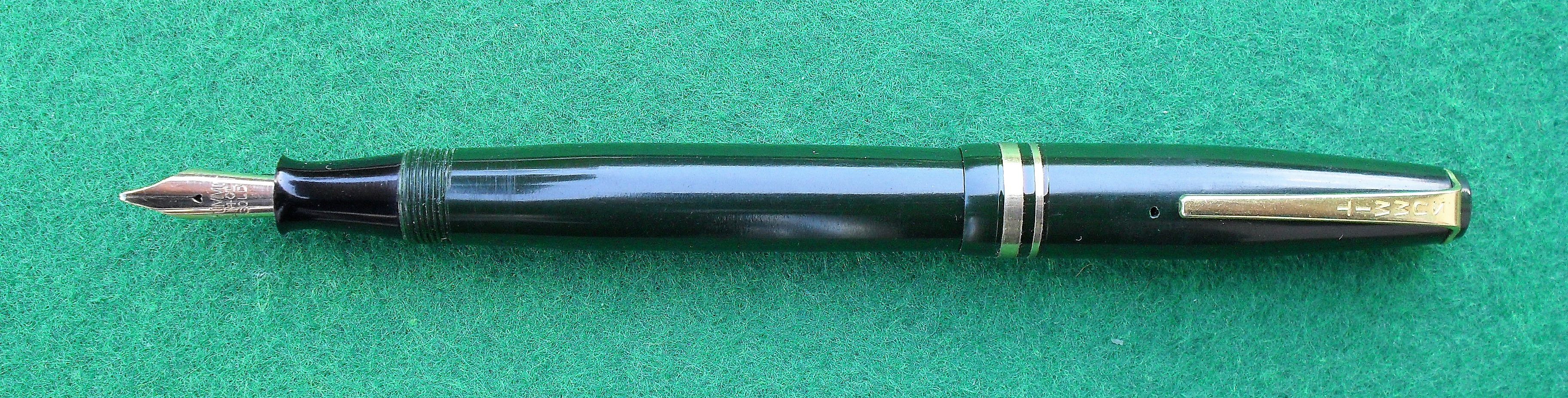 Il pulsante di fondo e la ghiera filettata che accoglie il fondello sono in alluminio e, a distanza di tanti anni, sono ancora bellissimi. Il pennino d’oro a 14 carati, del tipo n. 221, è a punta media, scorrevole e piacevole, anche grazie al molleggio. La stilografica è molto ben bilanciata, anche con il cappuccio calzato. Quest’ultimo s’inserisce saldamente sul corpo. La clip è robusta e dona una buona presa, pur non essendo eccessivamente dura nell’azionamento. Il cappuccio s’avvita in 1 giro e mezzo ed è dotato di due fori d’areazione simmetrici.