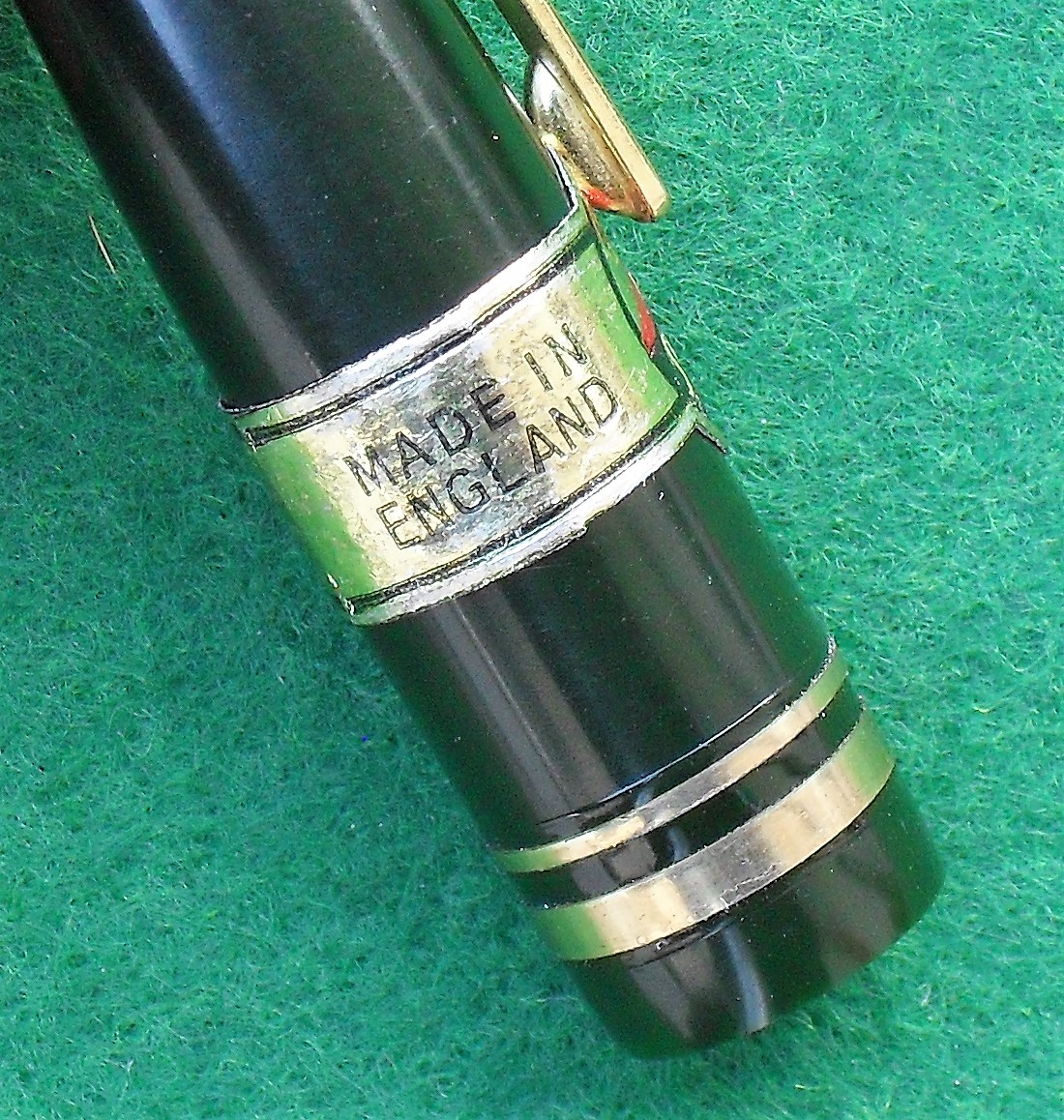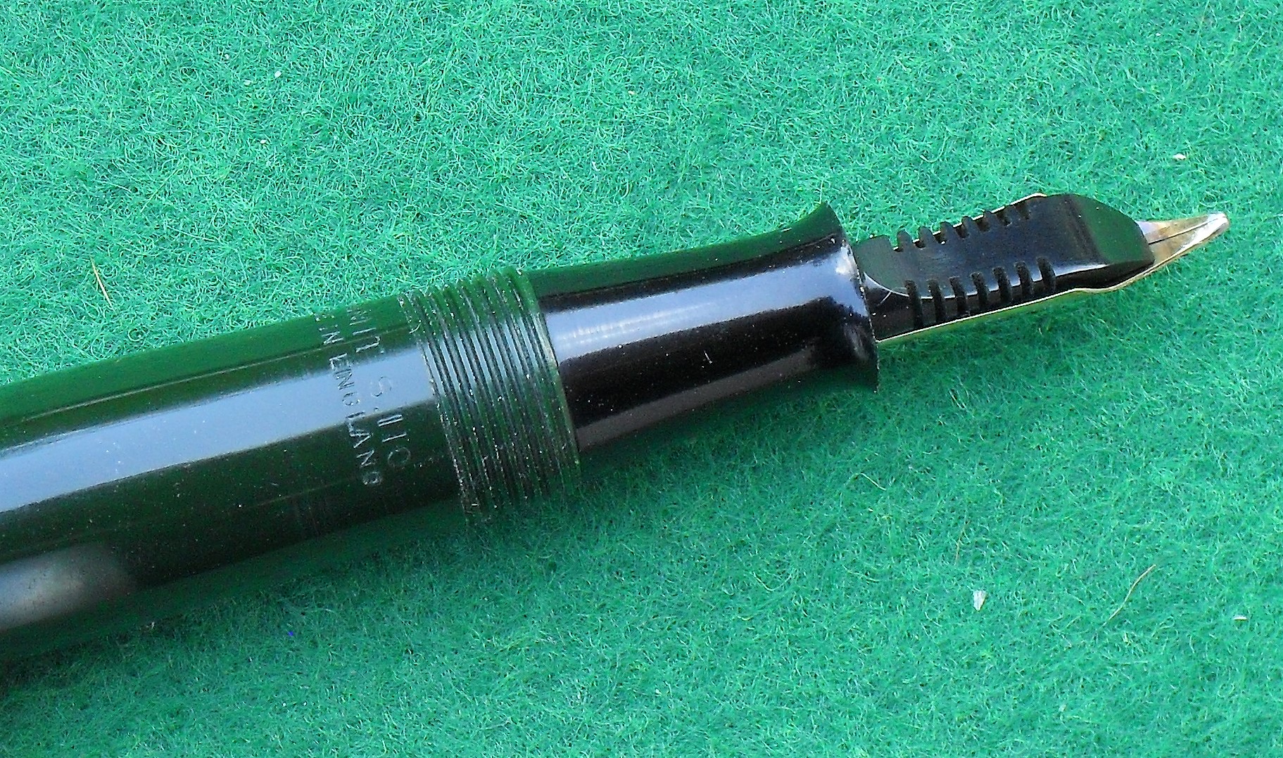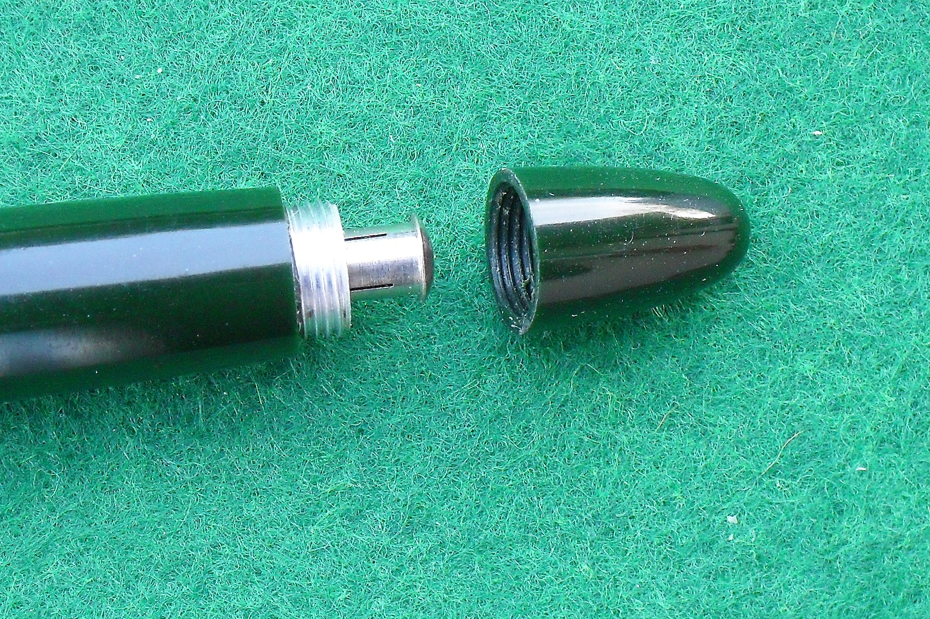 Smontando la stilografica ci si rende conto di due particolari: il sacchetto è a collo d’oca, con pareti abbastanza sottili, e la barra di compressione è incollata al serbatoio di gomma in due punti, mediante gommalacca, in modo tale da migliorare la regolarità di funzionamento. Il che significa che il montaggio avveniva inserendo nel corpo il complesso sezione – sacchetto – barra.
