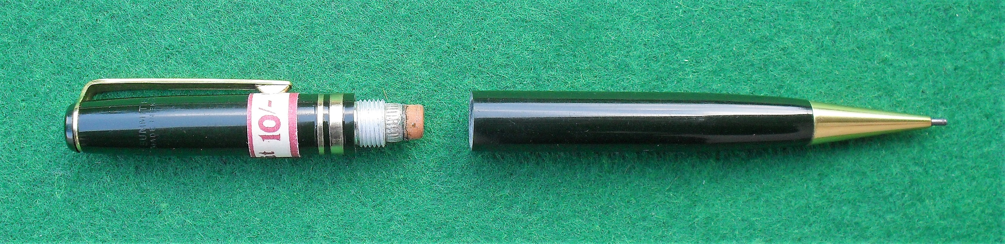 Interessante il fatto che l’alimentazione della stilografica sia a pulsante di fondo: un sistema di caricamento certamente non privilegiato dal produttore, ma che, pur introdotto sporadicamente nelle Summit degli anni Trenta, venne scelto per diversi modelli offerti dopo la Seconda Guerra Mondiale, come S. 90, S. 170 e S. 200 ad esempio.