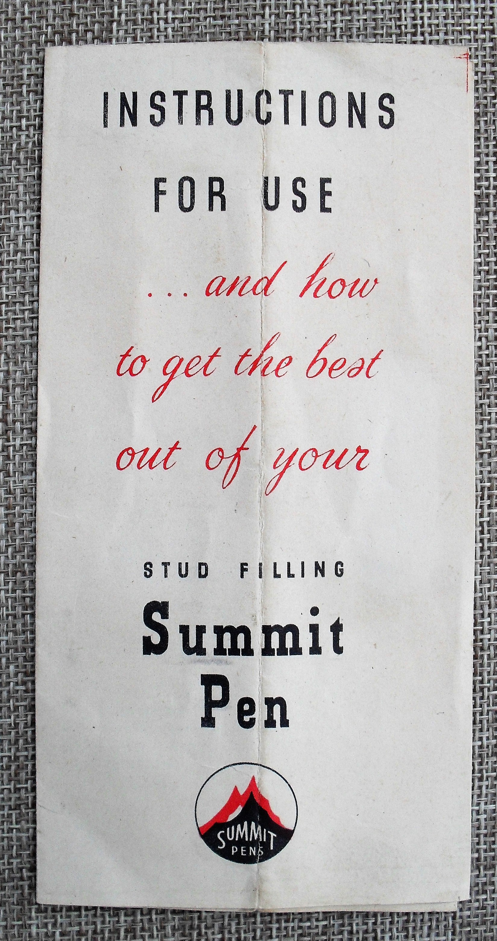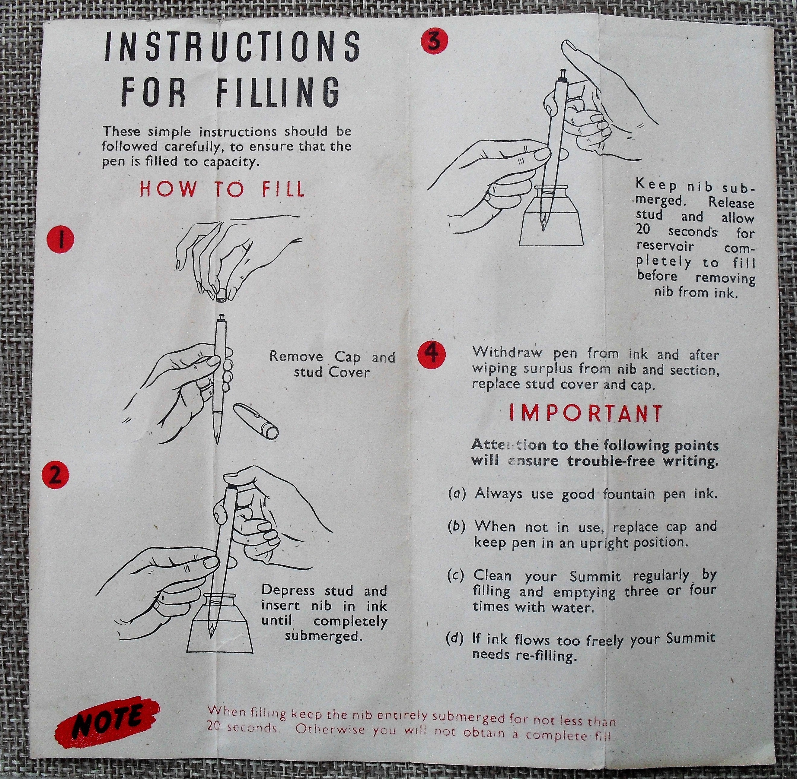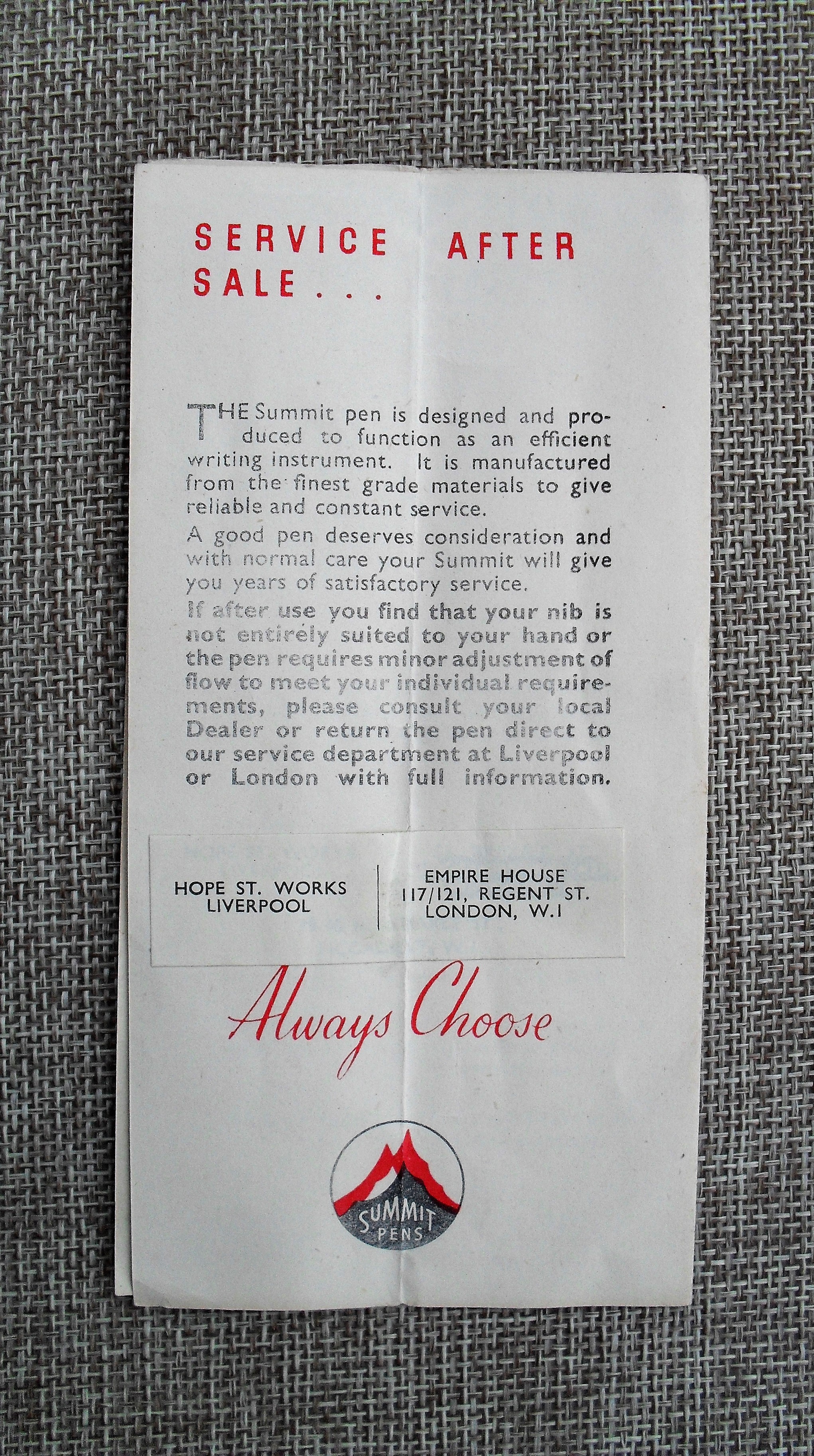 Il foglietto d’istruzioni è interessante per almeno tre motivi; il disegno della stilografica non corrisponde esattamente ad alcun modello Summit: che fosse relativo ad un prototipo che non entrò in produzione?
