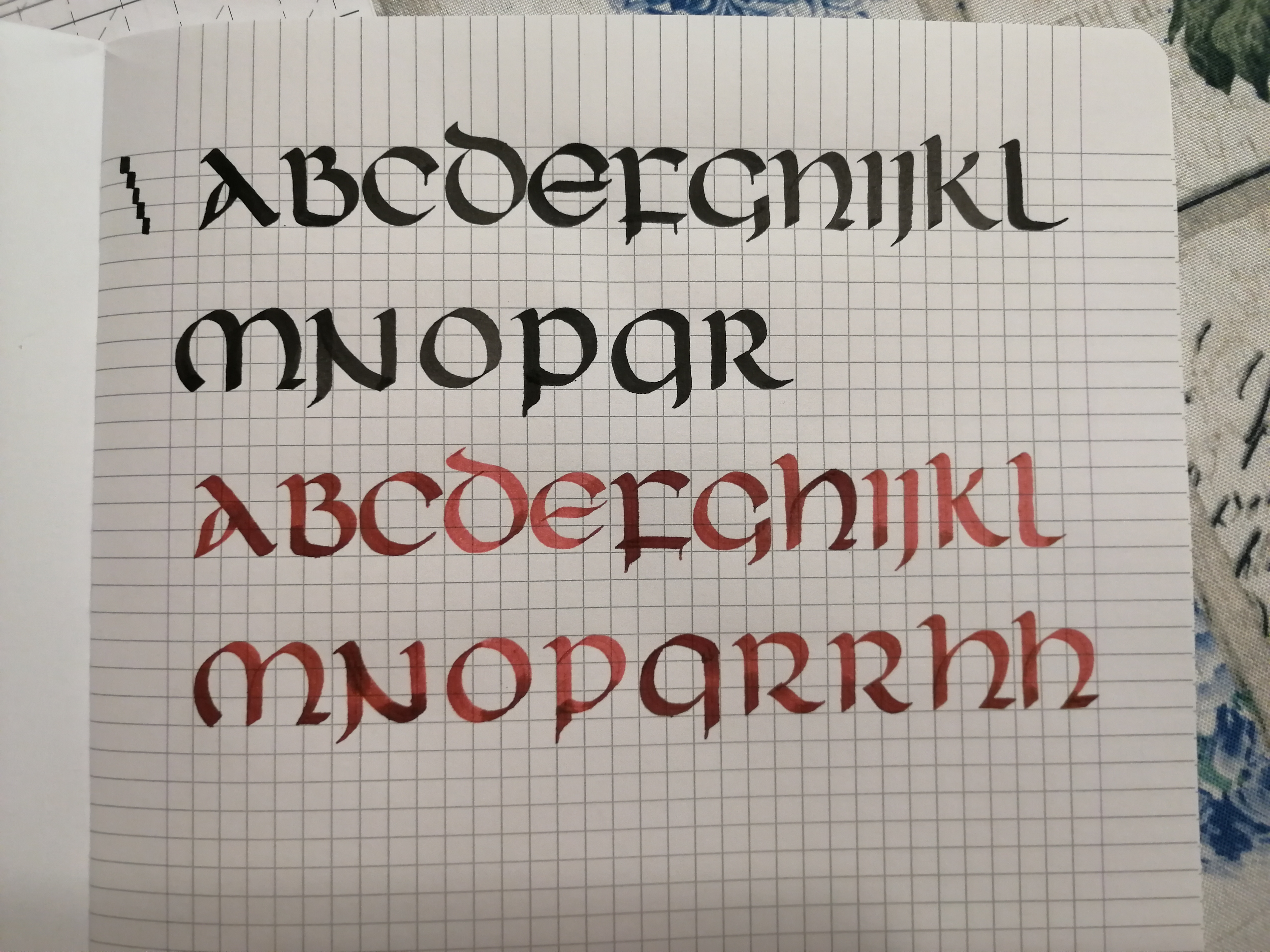 Alfabeto finito! Essendo solo maiuscole é abbastanza veloce. Ho usato inchiostro Koh-i-noor nero document che si é comportato bene e mi piace...peró non é nero ma un grigio con una forte componente blu (quando pulisco il pennino l'acqua nel barattolo diventa azzurra)