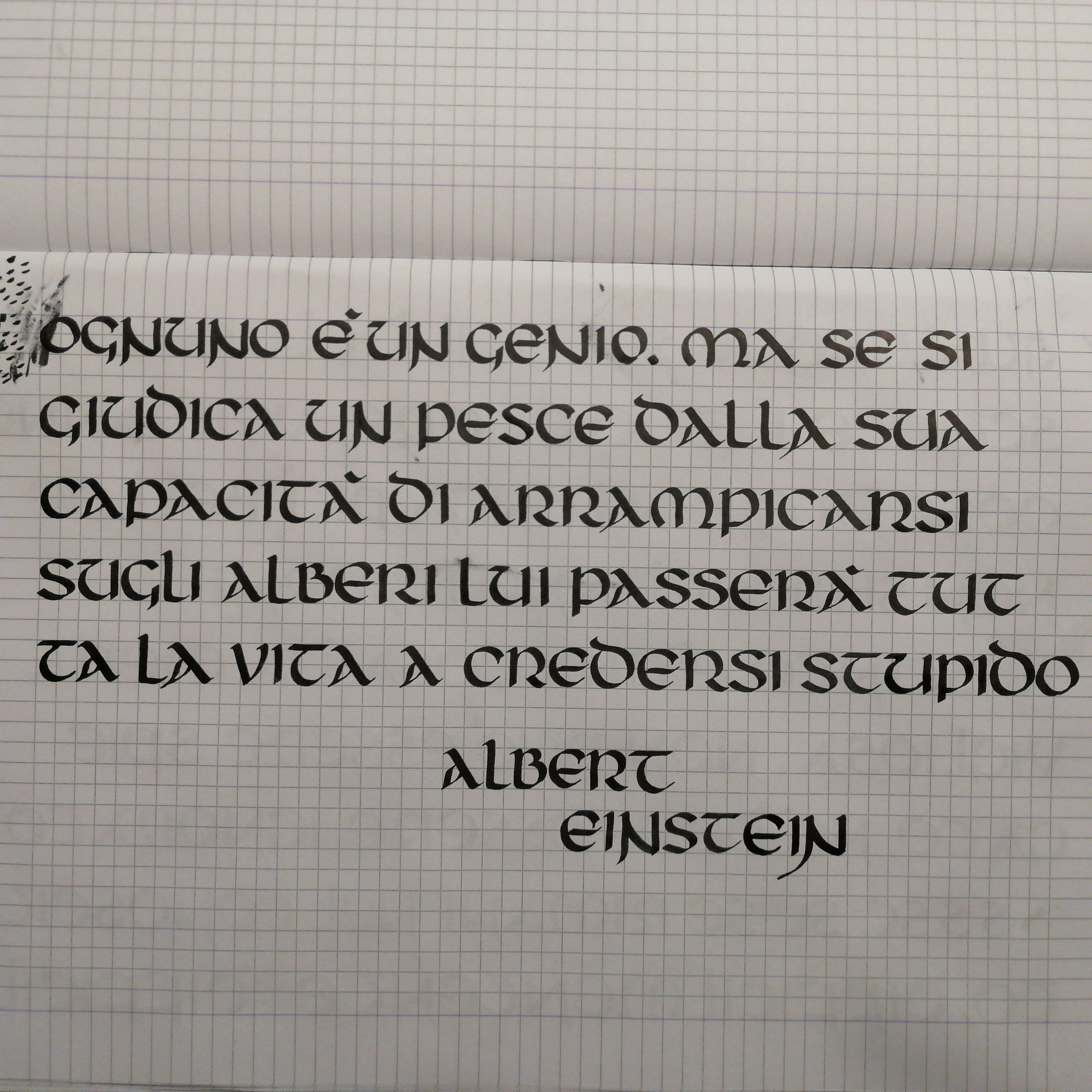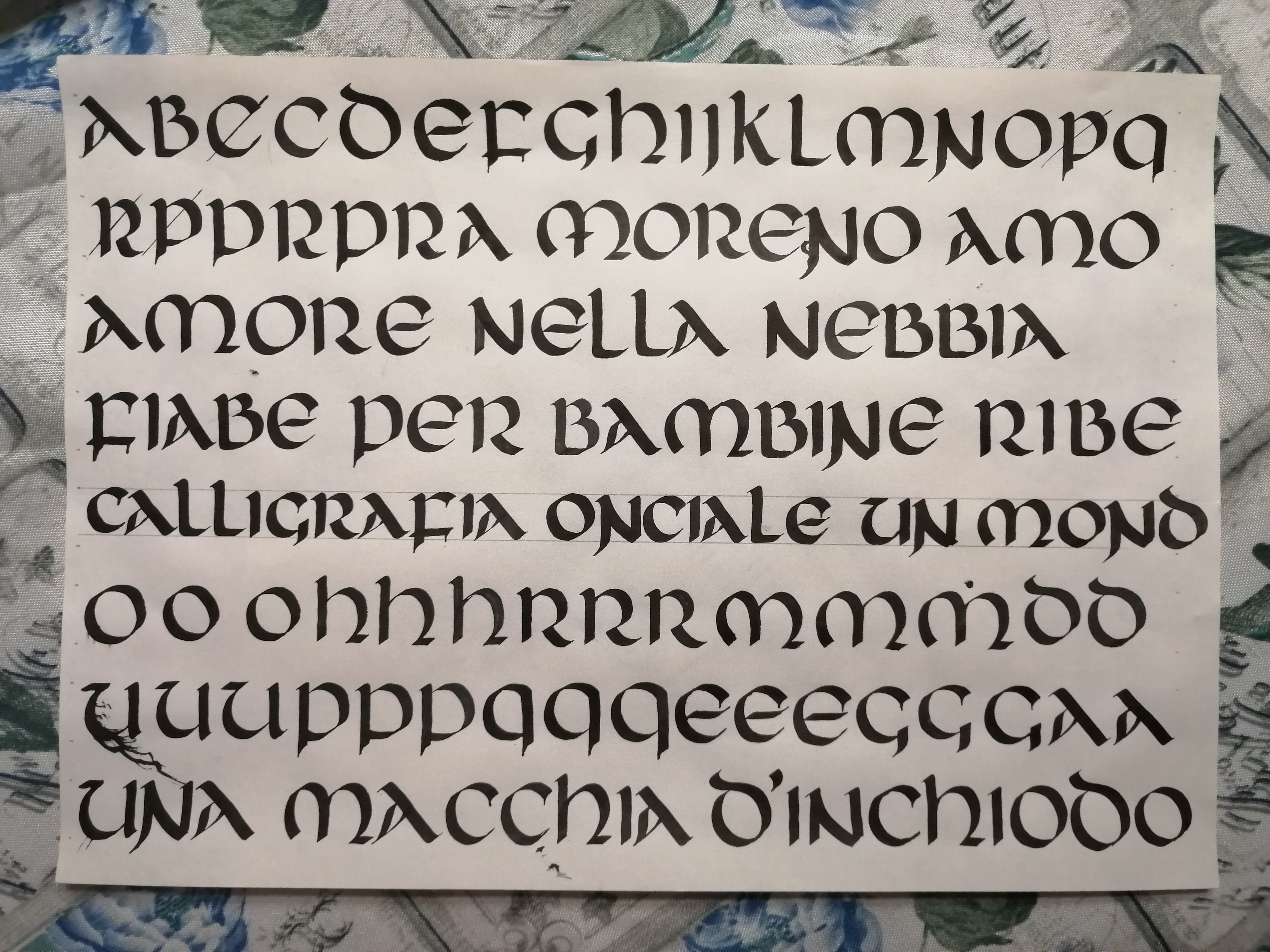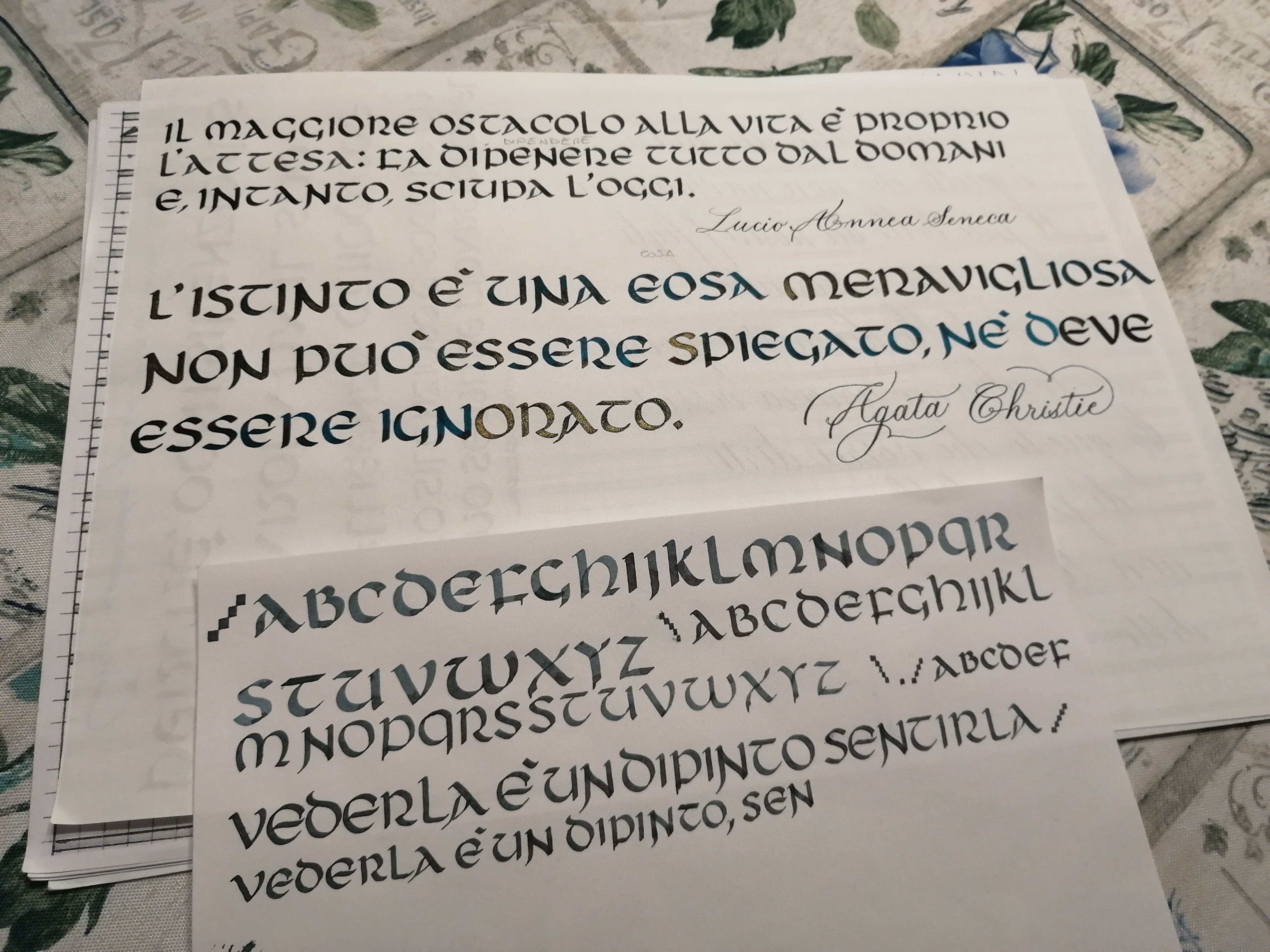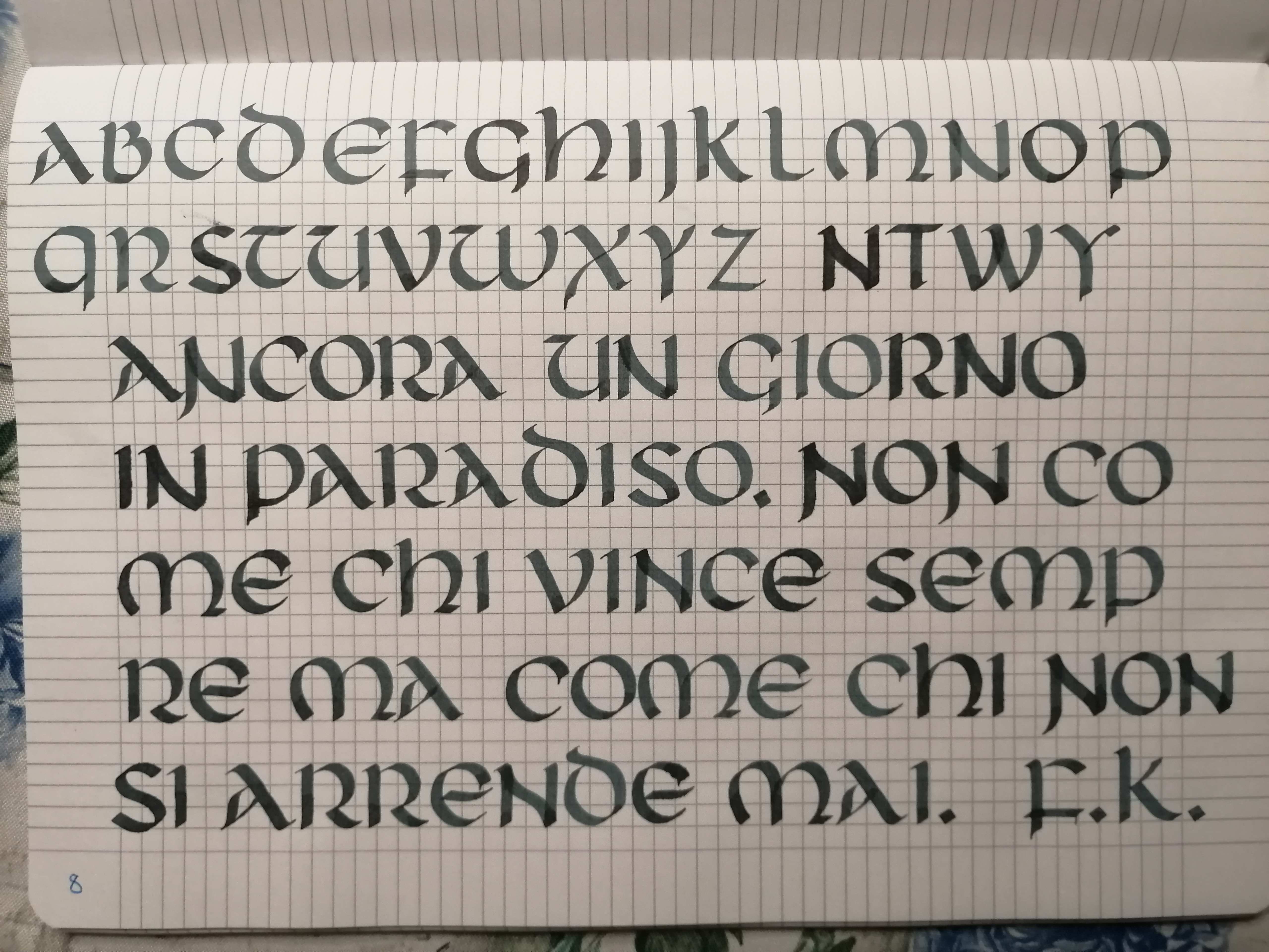 Sto provando l'onciale con pennini più piccoli (2 e 1,5) e, al contrario di altri stili, trovo che rimpicciolire le lettere sia più difficile che scrivere grande. Mantenere la forma tonda é un tormento! Ma non demordo.