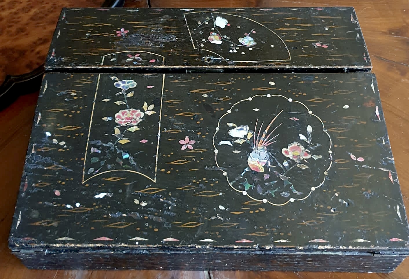 Ottocentesco scrittoio giapponese con tarsie in madreperla, decorazioni dipinte a mano. Completo di calamaio, sandracchiera in vetro (coperchi in argento) e serratura con chiave. Set in avorio. Lo uso altresì come... contenitore delle stilografiche in galalite della "F.lli Rossi" di Ancignano (VI), molto rare per la loro facile degradabilità soprattutto all'umidità.