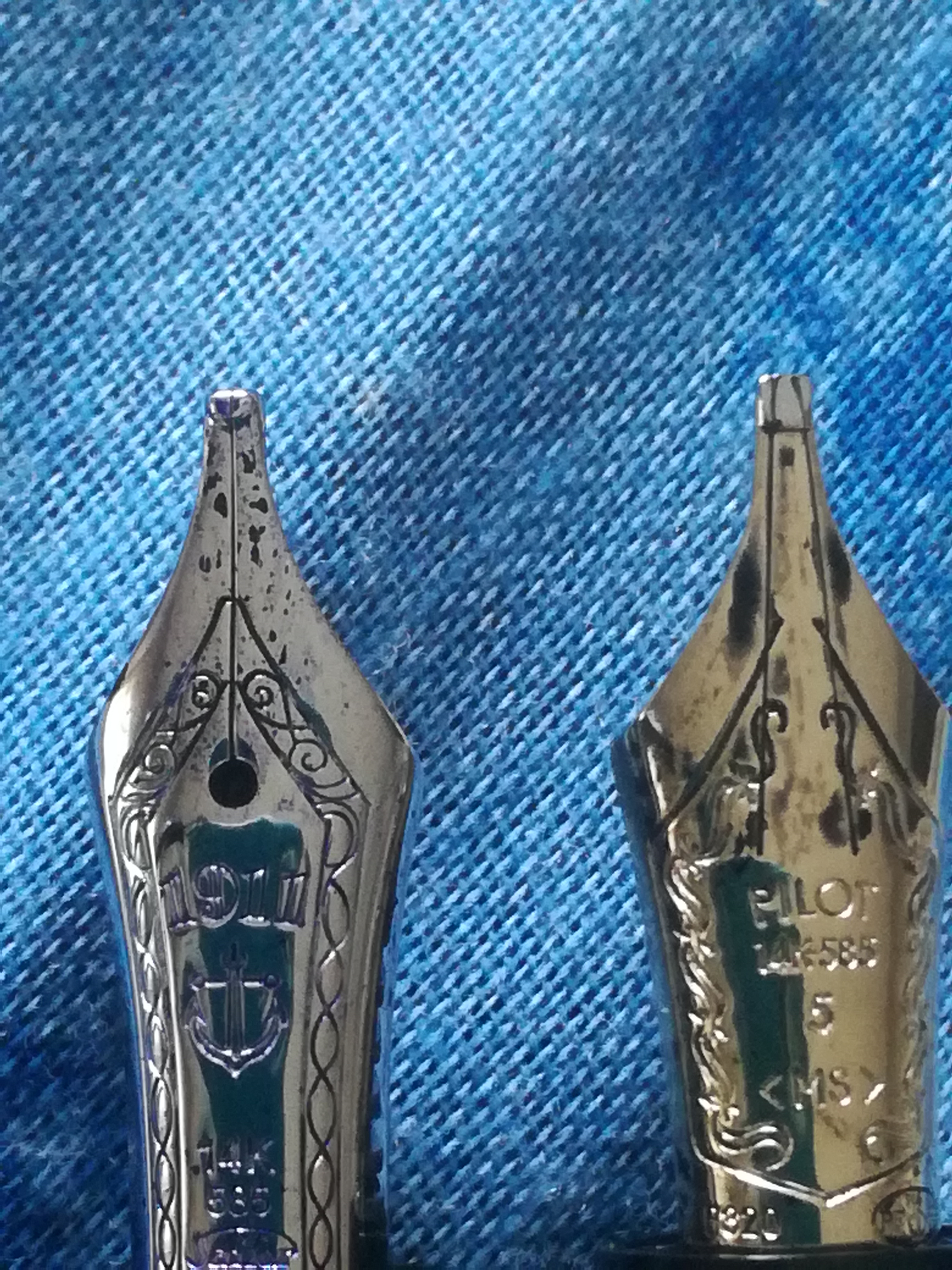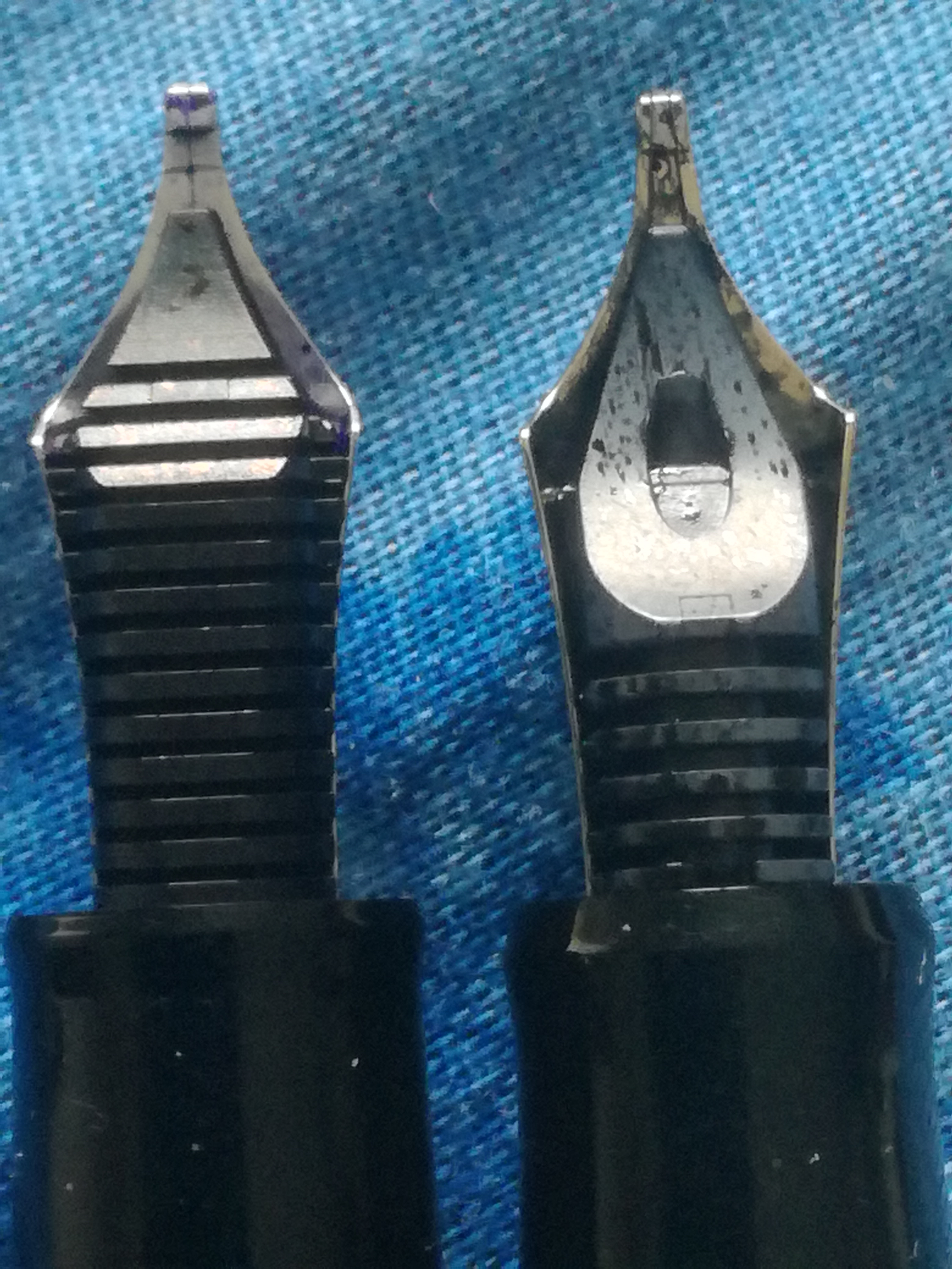 Allora, come potete vedere dalle foto che ho fatto, i due pennini sono molto diversi. Due rebbi belli smussati, il Sailor, più vicino a uno stub. I tre rebbi del Pilot invece lo fanno quasi avvicinare a un semirigido per quanto beve inchiostro, si bagna e si flette in confronto al Sailor.