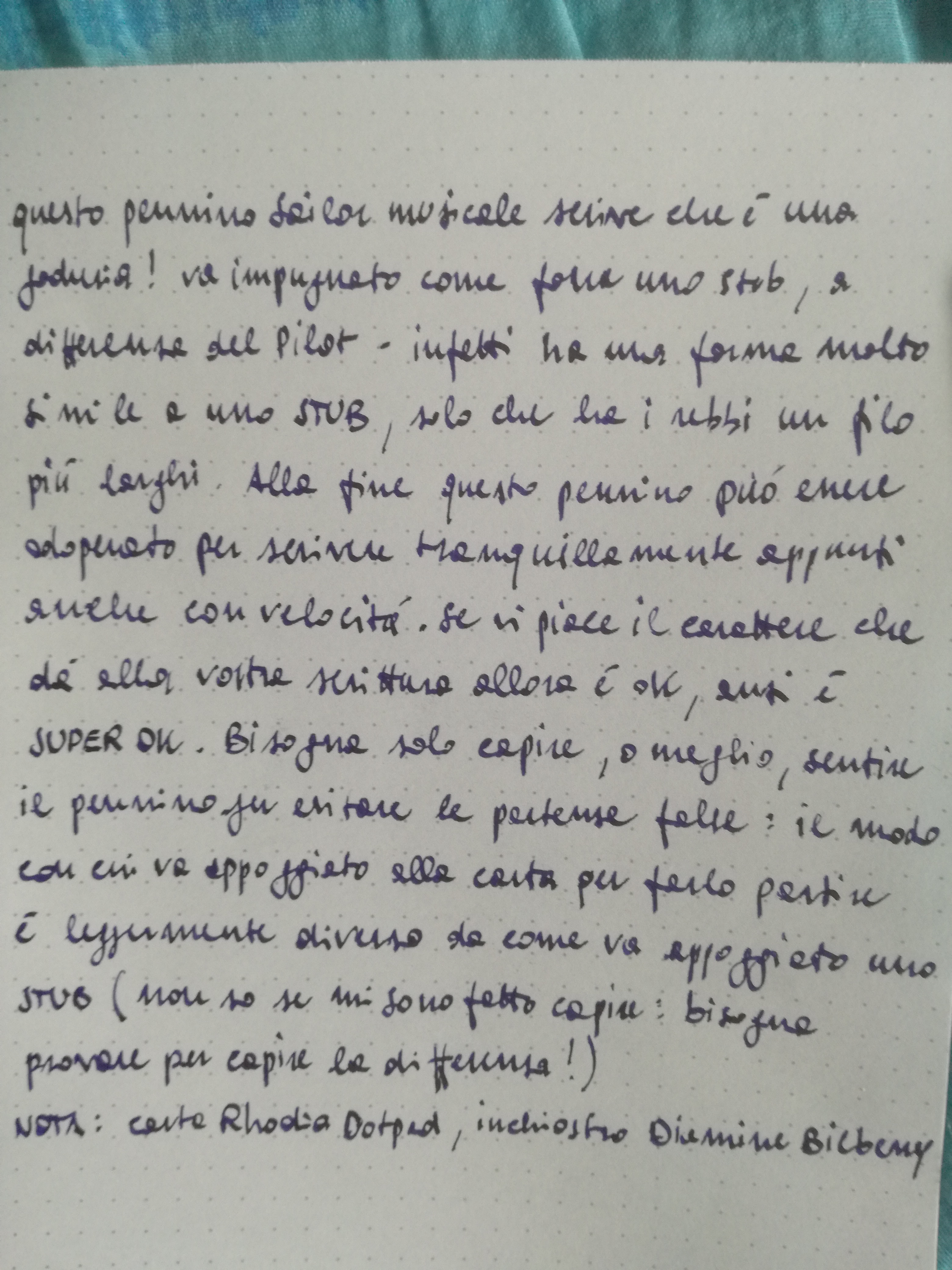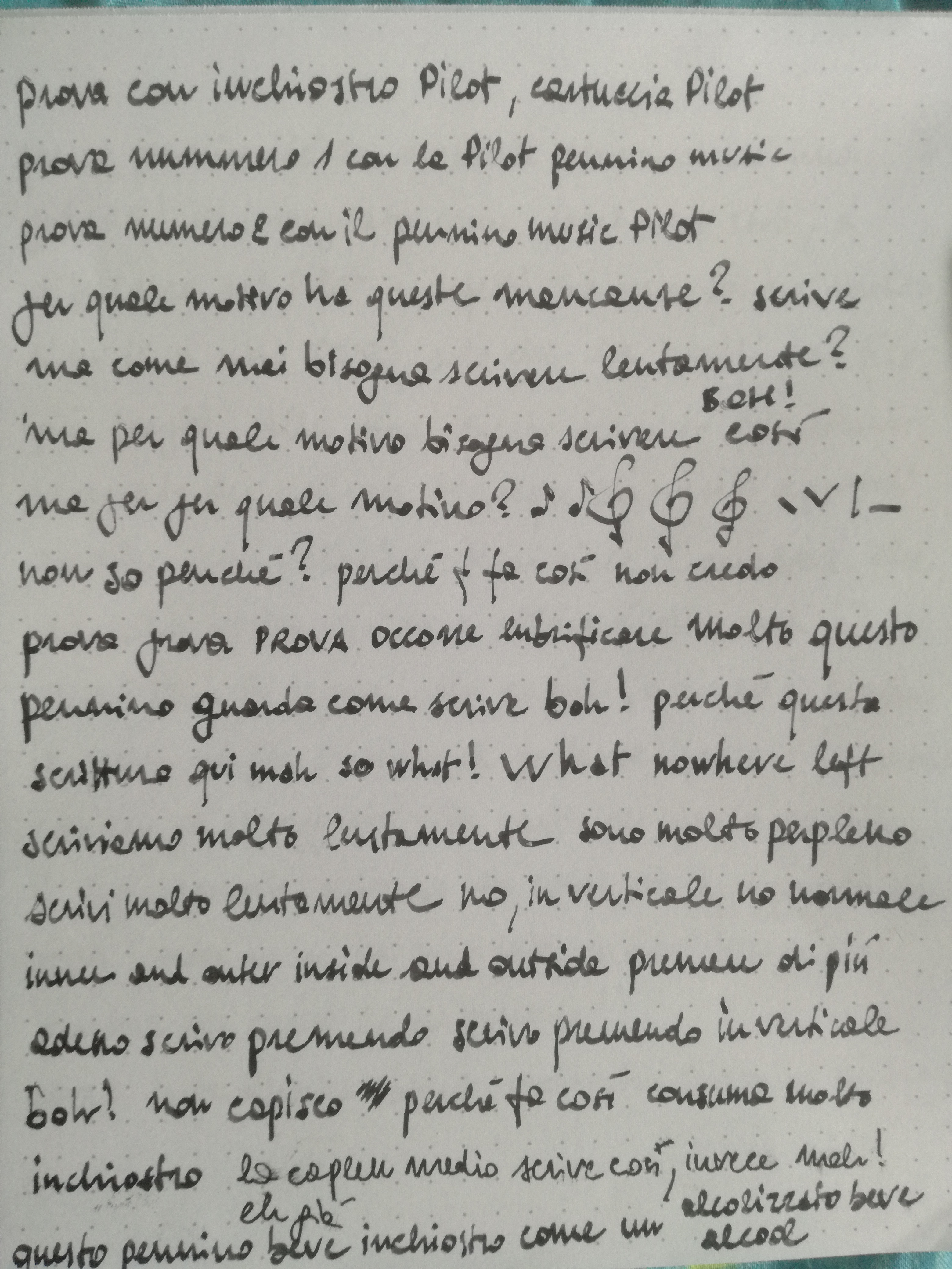 Inoltre il Pilot idealmente nei frangenti in cui lo si adopera per scrivere musica andrebbe tenuto in verticale con il pennino ruotato di 90° in modo da scrivere largo in verticale e sottile in orizzontale. Non comodissimo, diciamo.