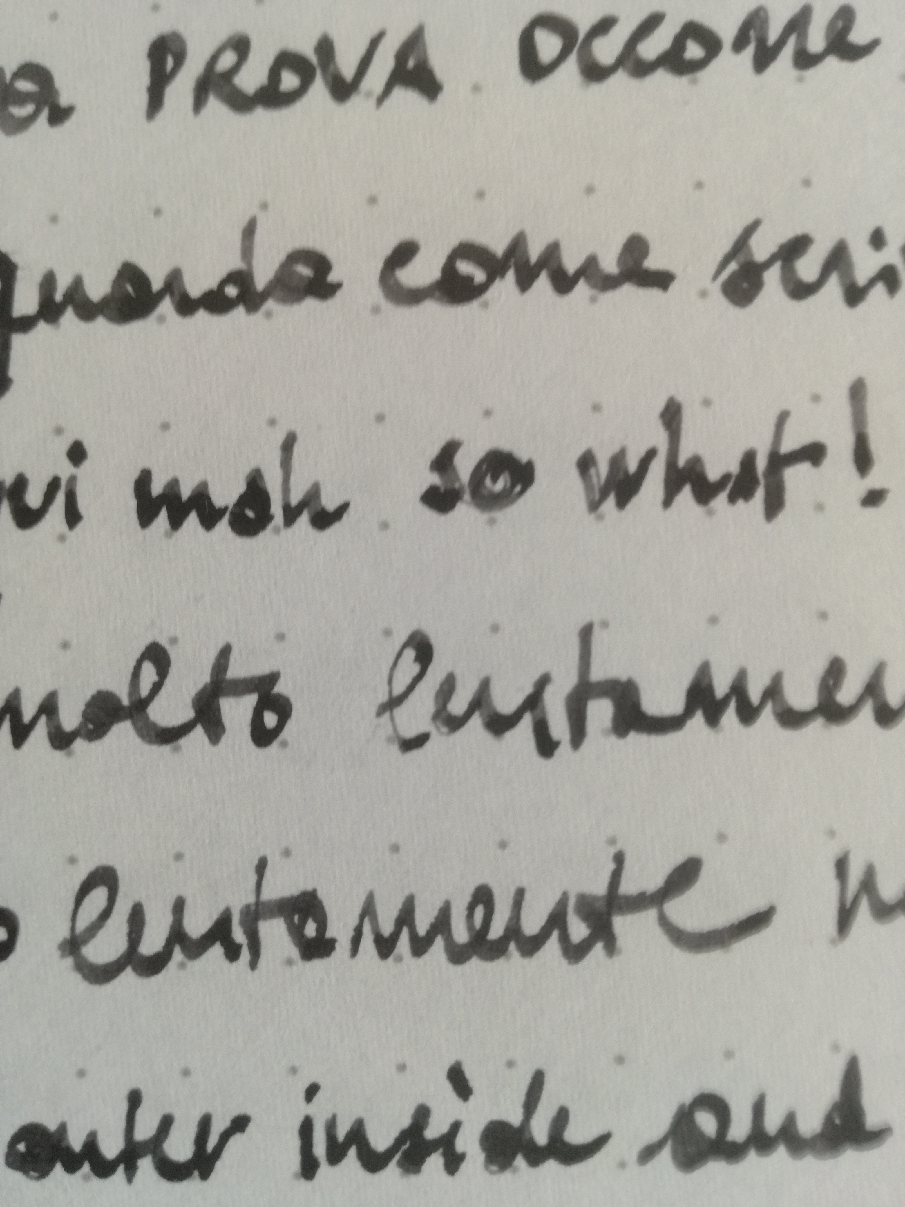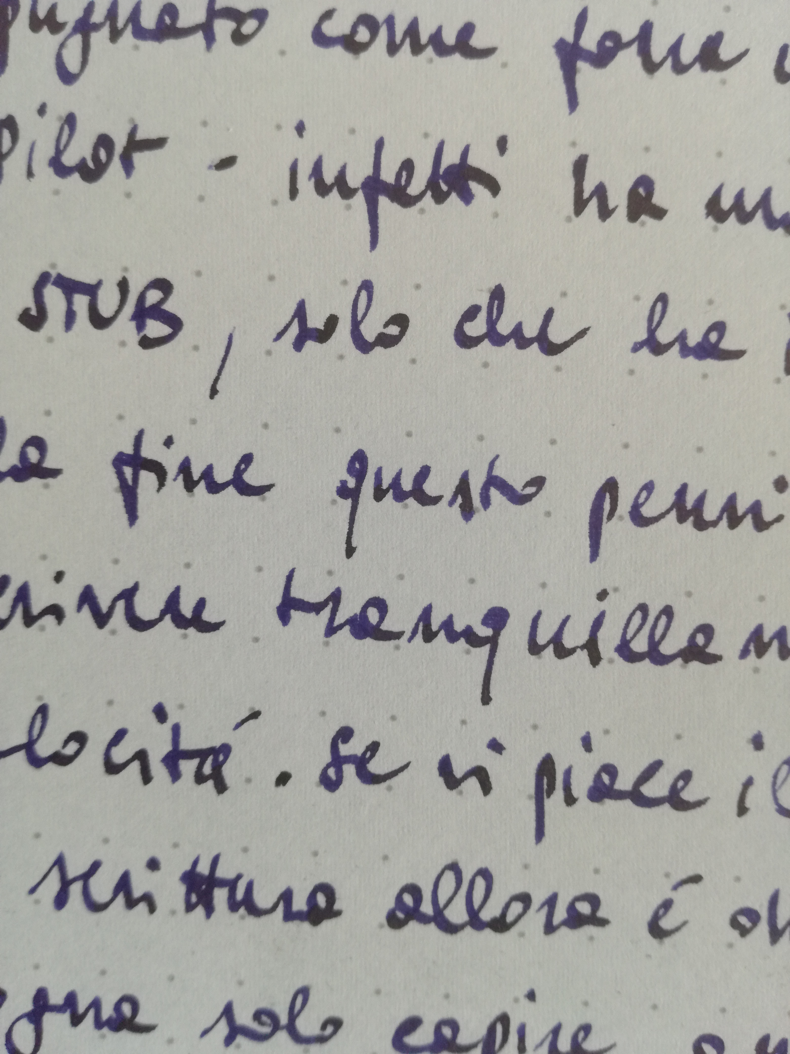 Avevo detto e vi avevo mostrato i problemi che avevo avuto scrivendo con il Pilot. Ebbene, scrivendo su altri tipi di carta di pregio inferiore al Rhodia questi problemi scompaiono: scrivendo sulla Schizza & Strappa Favini e su una normalissima carta da ufficio per stampante con grammatura 80 il pennino scrive e si comporta decisamente meglio.