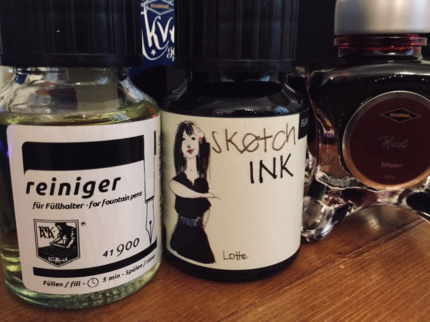 Allego una foto della boccetta di inchiostro (ritratta insieme a quella di liquido per la pulizia del suddetto, che a quanto pare tende a lungo andare ad intasare leggermente la penna, e ad una boccetta di Diamine "Noel" per dare un'idea delle dimensioni).