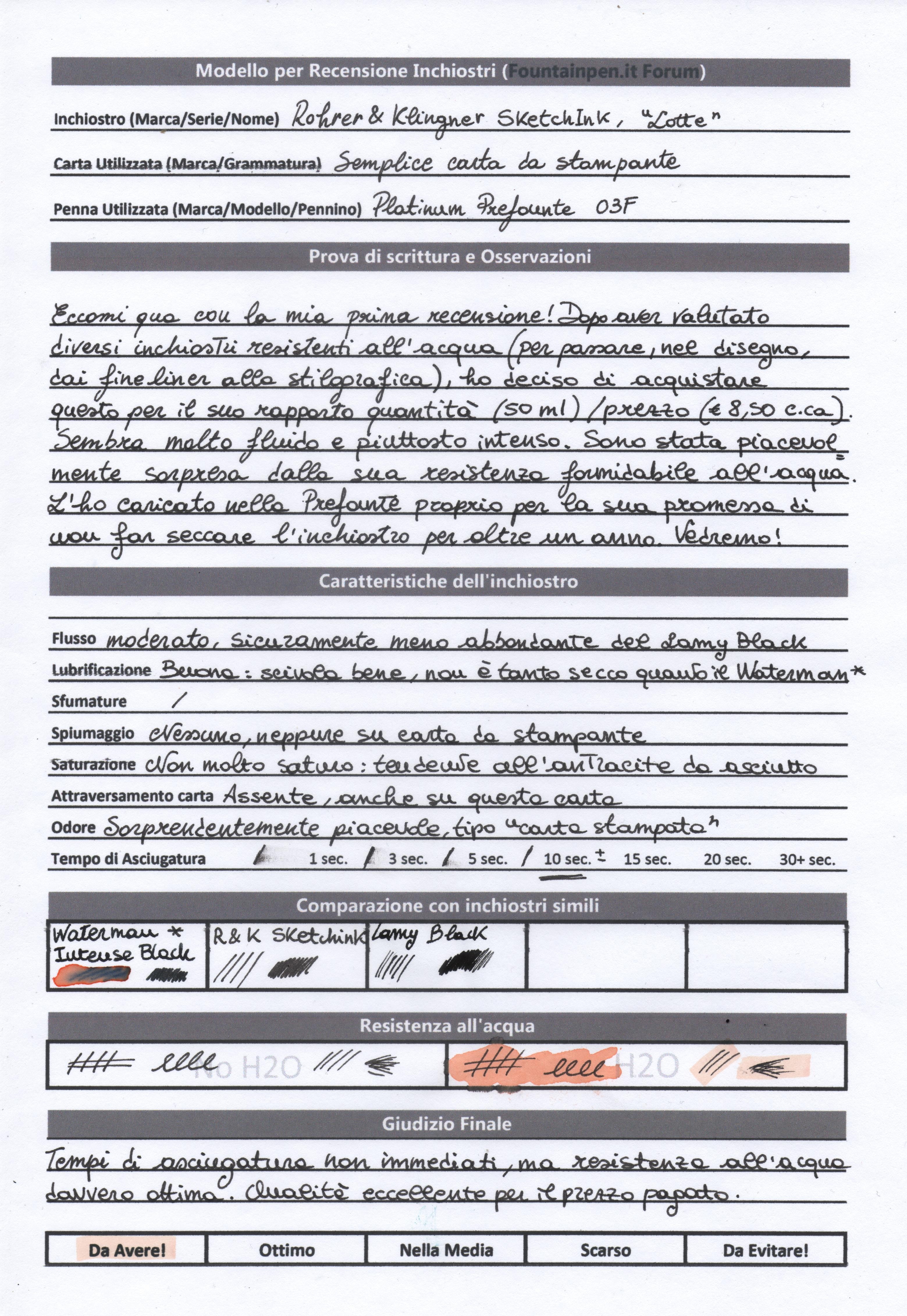 Ottimo, nuove recensioni fanno sempre piacere. Come temevo, non è "nerissimo", però offre ottima resistenza all'acqua. Si attendono impressioni dopo un po' di tempo allora, come si comporta alla lunga nella penna, se è facile da pulie o meno... Grazie per la recensione