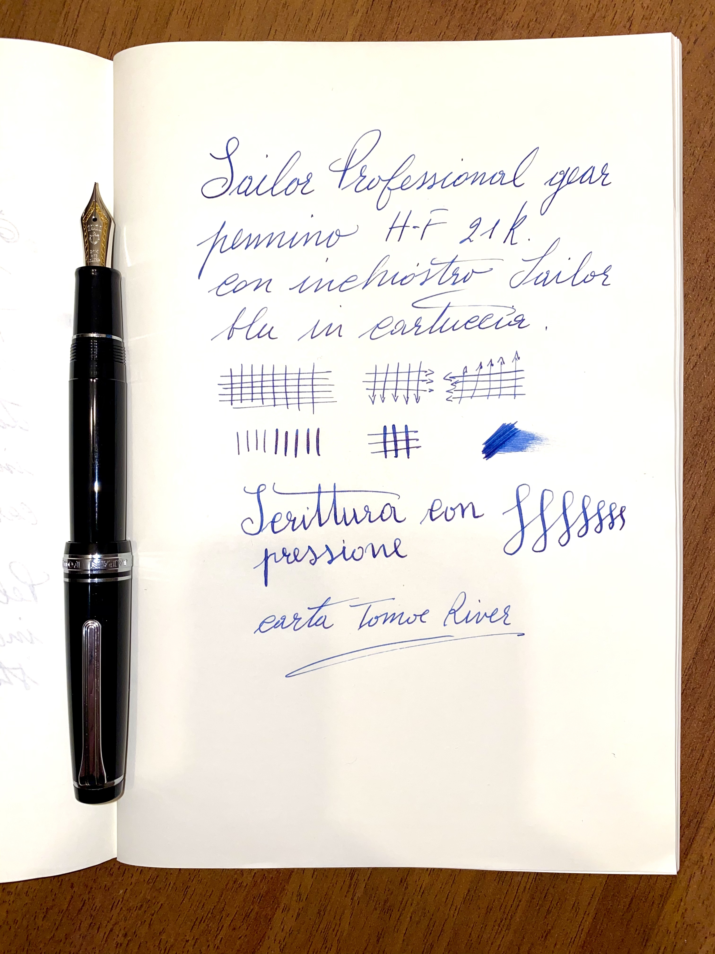 Ciao, qualche giorno addietro ho ricevuto una Sailor professional gear con pennino H-F 21k. La H penso indichi un pennino hard, duro, ma invece è morbido e docile. Uno spillo, questo va detto, ma assolutamente non un chiodo. Esperienza di scrittura piacevolissima anche andando veloce. Non perdo tempo a descriverla, tutti la conoscono bene o male. Siccome nell'annuncio di vendita c'era una foto in cui veniva descritta la diversa morbidezza dei pennini Sailor, in acciao, 14K e 21K, e quest' ultimo veniva indicato come il più morbido, ho voluto constatare e condividere con voi questa mia piccola curiosità soddisfatta. Allego qualche foto. La grafia, quando tento di scrivere con pressione sembra quella di un bambino delle elementari