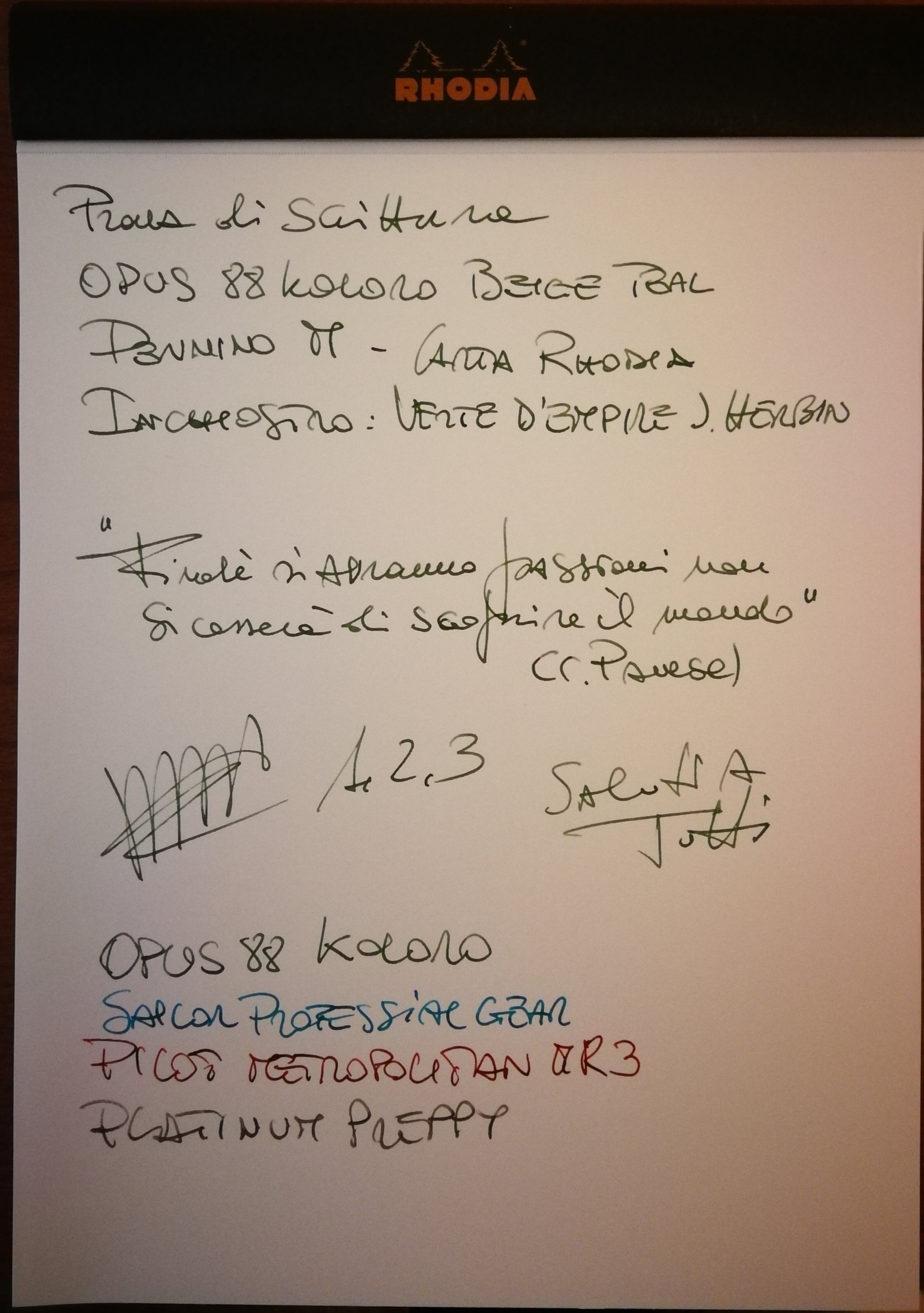 Il tratto più spesso è risultato quello della Preppy (inchiostrata con il Sepia R&K) seguito da quello della Sailor Professional Gear (Pelikan 4001 turchese). Praticamente un filo più sottile quello della Koloro e infine, sembra quasi un F europeo e si sente quando si scrive, quello della Pilot MR3 (Diamine Matador)