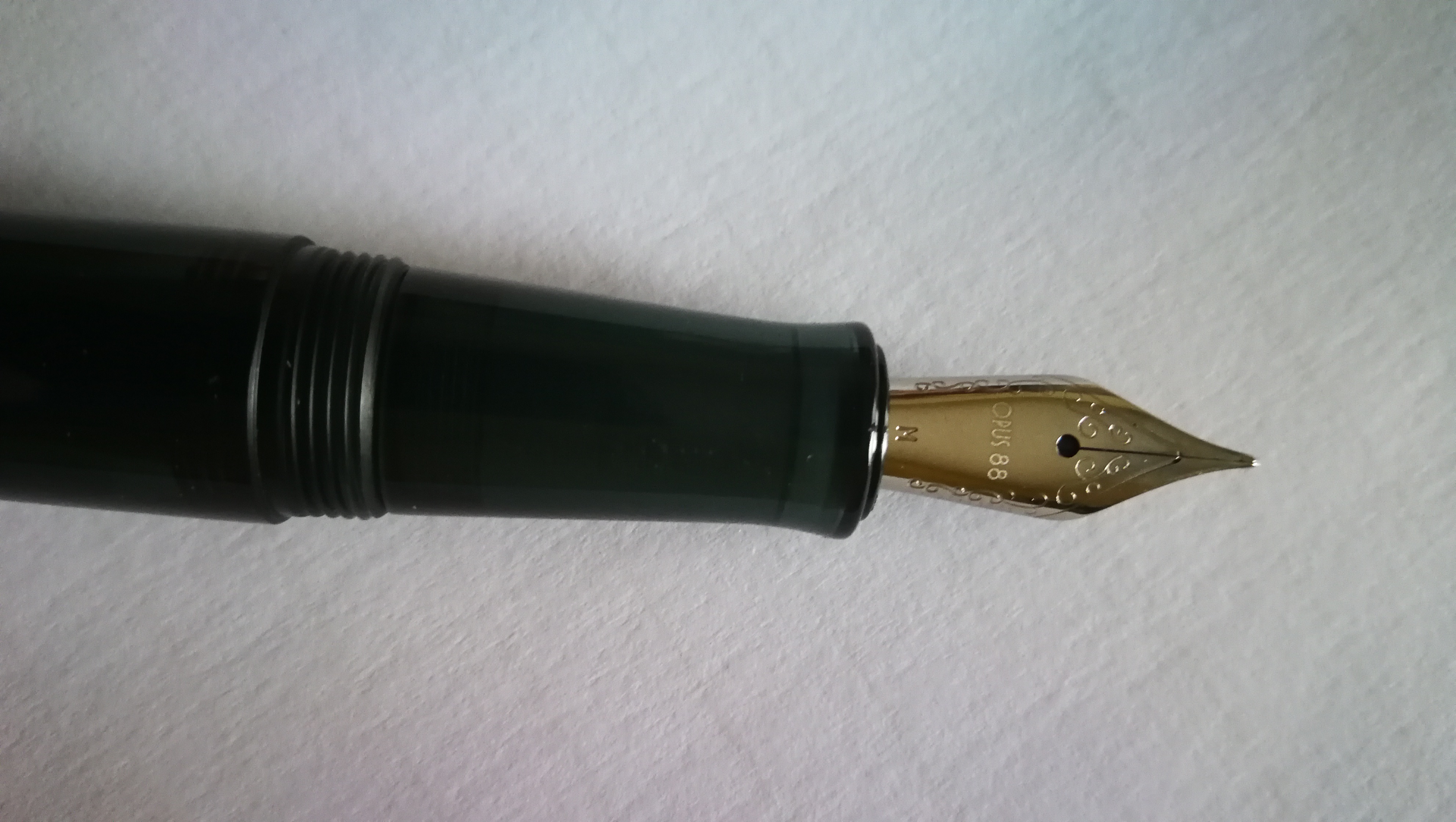 Malgrado non sia una penna piccola la trovo maneggevole, sostanzialmente leggera e comoda da impugnare. Non stanca affatto. Il serbatoio è molto capiente anche se le istruzioni suggeriscono di non riempirlo tutto perchè potrebbe causare delle fuoriuscite. Per evitare ciò, comunque, quando non si usa c'è il suggerimento di avvitare del tutto il fondello (e di aprirlo leggermente quando la si usa). Il pennino è veramente scorrevole, il tratto sembra un medio tendente al fine. La prova di scrittura è stata fatta su carta Rhodia. Anche su carta più ordinaria il comportamento è lo stesso. L'inchiostro usato è il Verte Empire J.Herbin.