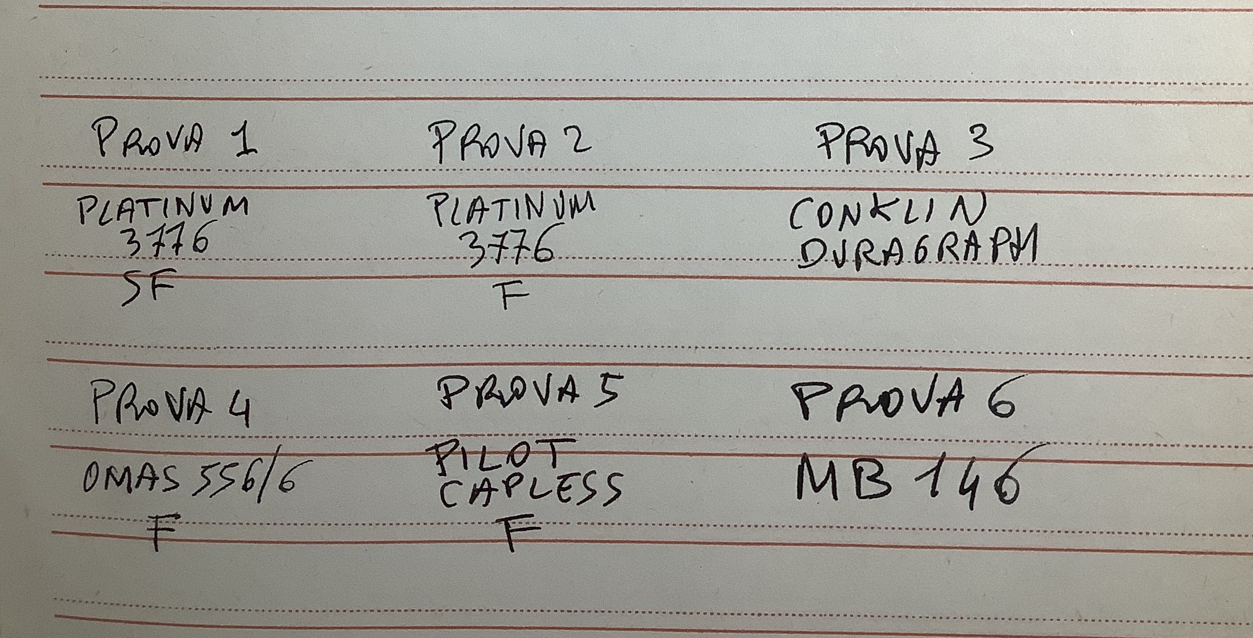Se la funzione di una penna è quella di scrivere, fra quelle che ho attualmente inchiostrate preferisco usare nell’ordine: 2,3,1,4,5,6.