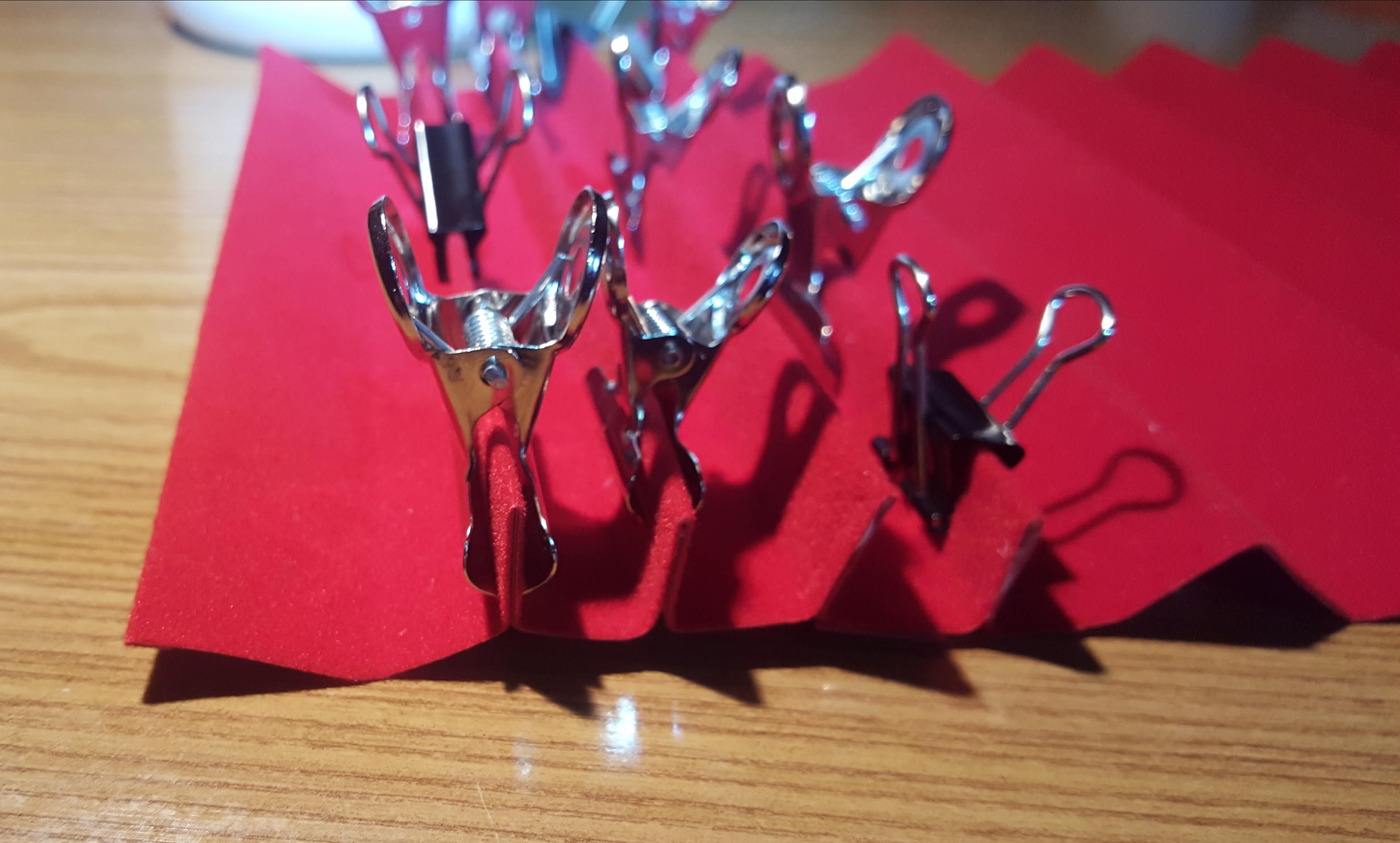 continuare fino a raggiungere il numero di "spazi" che entreranno per lunghezza nel cassetto, tenendo conto che ogni "spazio" misura circa 1,7 cm A questo punto fissare su un piano con delle puntine o in altro modo il velluto, con la parte adesiva verso l'alto e dopo aver tolto la carta protettiva, applicare il cartoncino, dopo averlo ben steso e averne "allargato" le piegature, facendolo perfettamente aderire, premendo con la pieghetta o con un qualsiasi oggetto liscio e tondeggiante (cucchiaio, etc.) o facendoci rotolare una bottiglia. Vedete voi. Ora, bisogna dare di nuovo la forma al cartoncino (su cui appunto è stato applicato il velluto) seguendo le piegature fatte in precedenza e quindi incollare l'interno delle "V" con il vinavil, serrando poi con le mollette Dopo aver fatto asciugare per bene la colla, inserire nel cassetto (rifilando eventualmente con il taglierino dove necessario) e alloggiare le penne. Volendo si può incollare sotto un altro pezzo di bristol della misura del cassetto, a mo' di base, per dare ulteriore rigidità Il risultato è una serie di divisori abbastanza rigidi ma altrettanto flessibili idonei ad accogliere le penne, senza creare danni o graffi.
