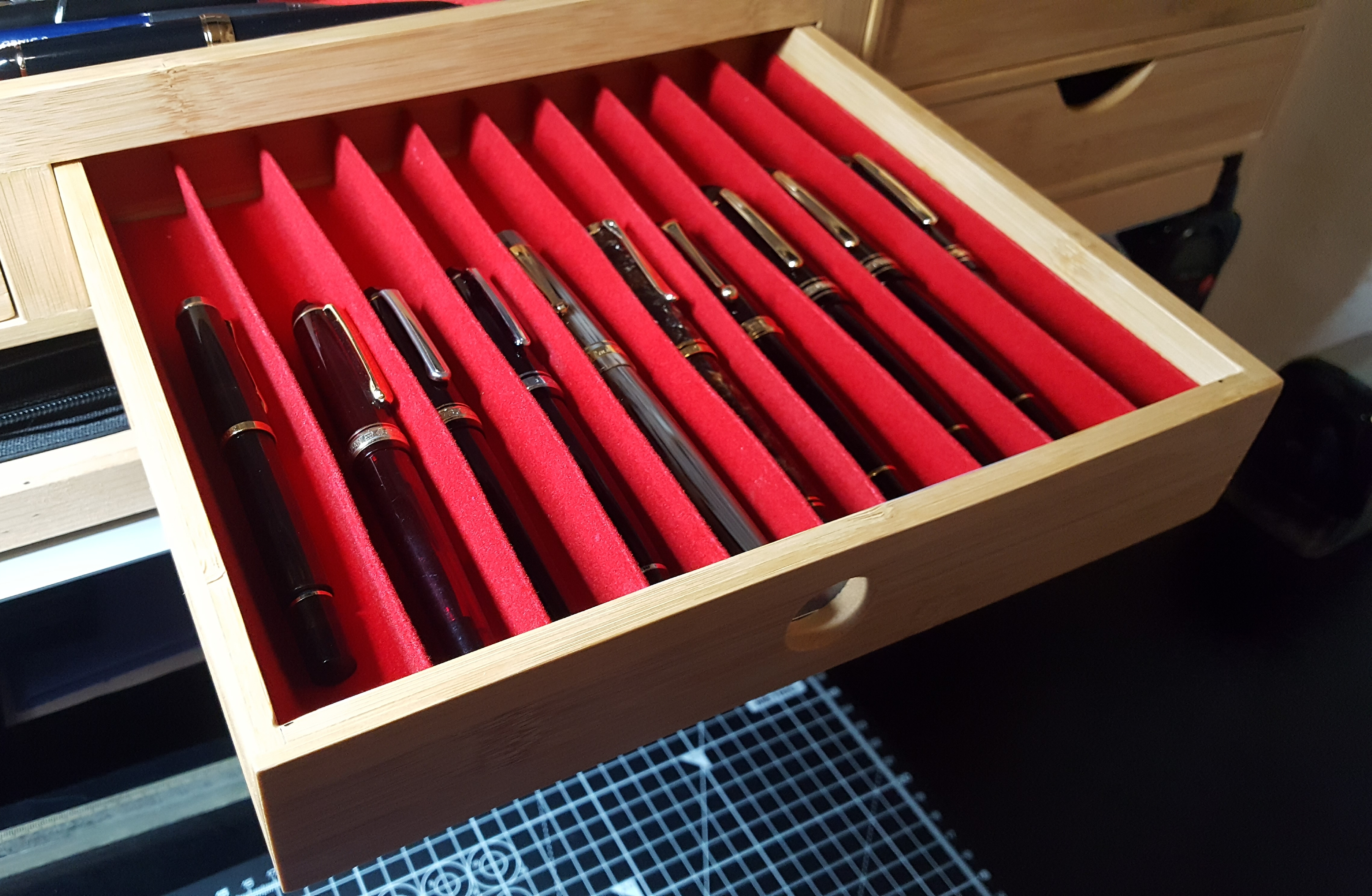 Ottimo lavoro, sono entrato oggi per caso in questo post e devo dire che mi sembra una bellissima idea. Stavo giusto pensando a come organizzare le mie penne (è da poco che ho dedicato più tempo a questa passione) e direi che la tua proposta permette di creare una struttura applicabile a qualunque spazio disponibile. Nel mio caso sto pensando di applicare un cassetto sottile sotto al piano della scrivania (se ne trovano di quasi già pronti, molto facili da installare - quello che una volta si chiamava "tiretto") e immagino che sarebbe molto bello organizzarlo con il tuo sistema.