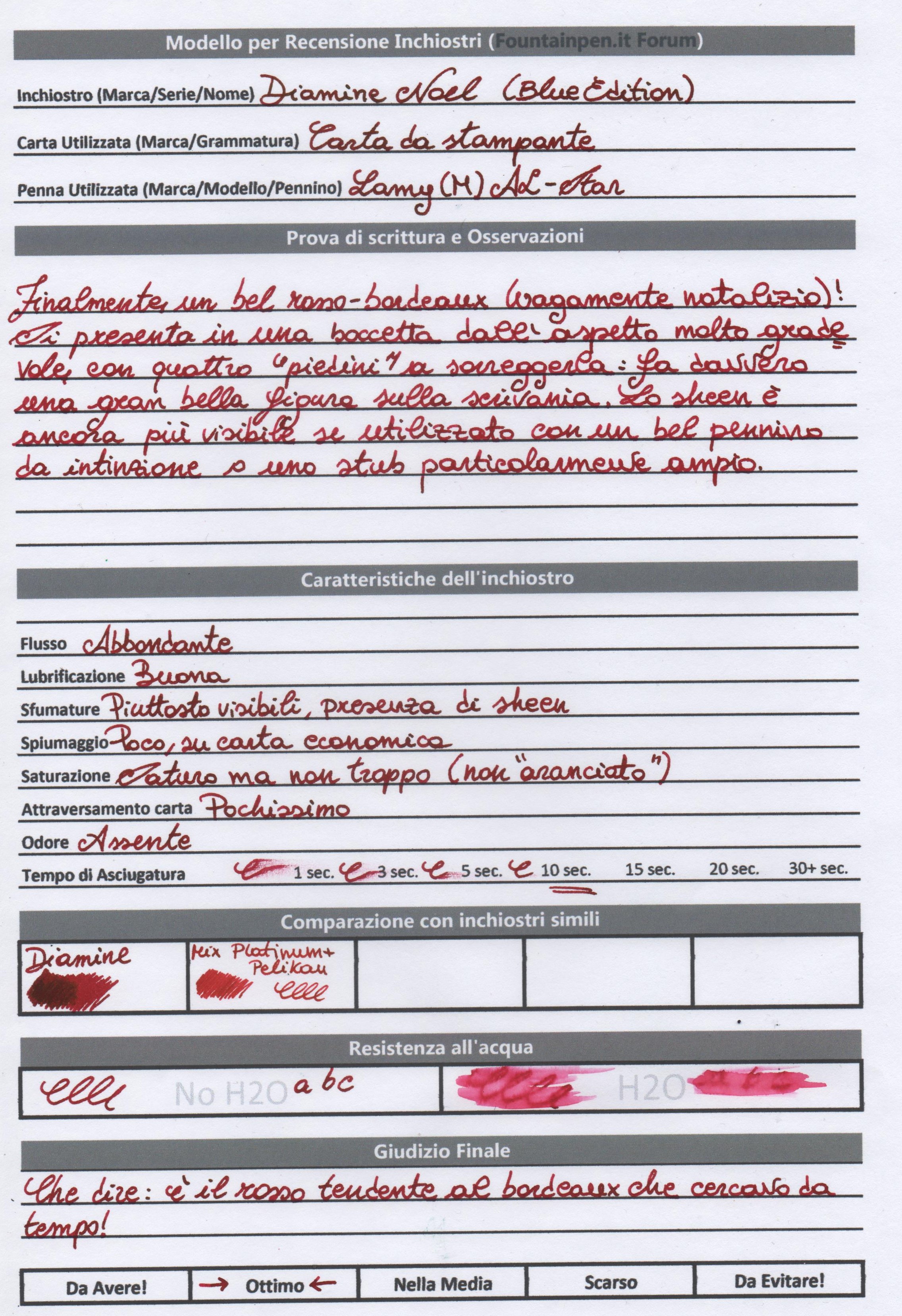 Dopo averlo utilizzato per un mese, ho deciso finalmente di recensire un inchiostro che ha finalmente soddisfatto le mie aspettative personali del "Rosso Perfetto": è il caso del Diamine Noel, un bel rosso scuro sheen (quasi tendente al bordeaux) che comprai prima di Natale, attratta anche dalla boccetta. Spero che la recensione vi piaccia, chiedendo in anticipo venia per qualsivoglia refuso di tipo tecnico e non. Allego anche uno sbadato tentativo di calligrafia per mostrare lo sheen tipico di questo inchiostro, poco visibile nella scheda.