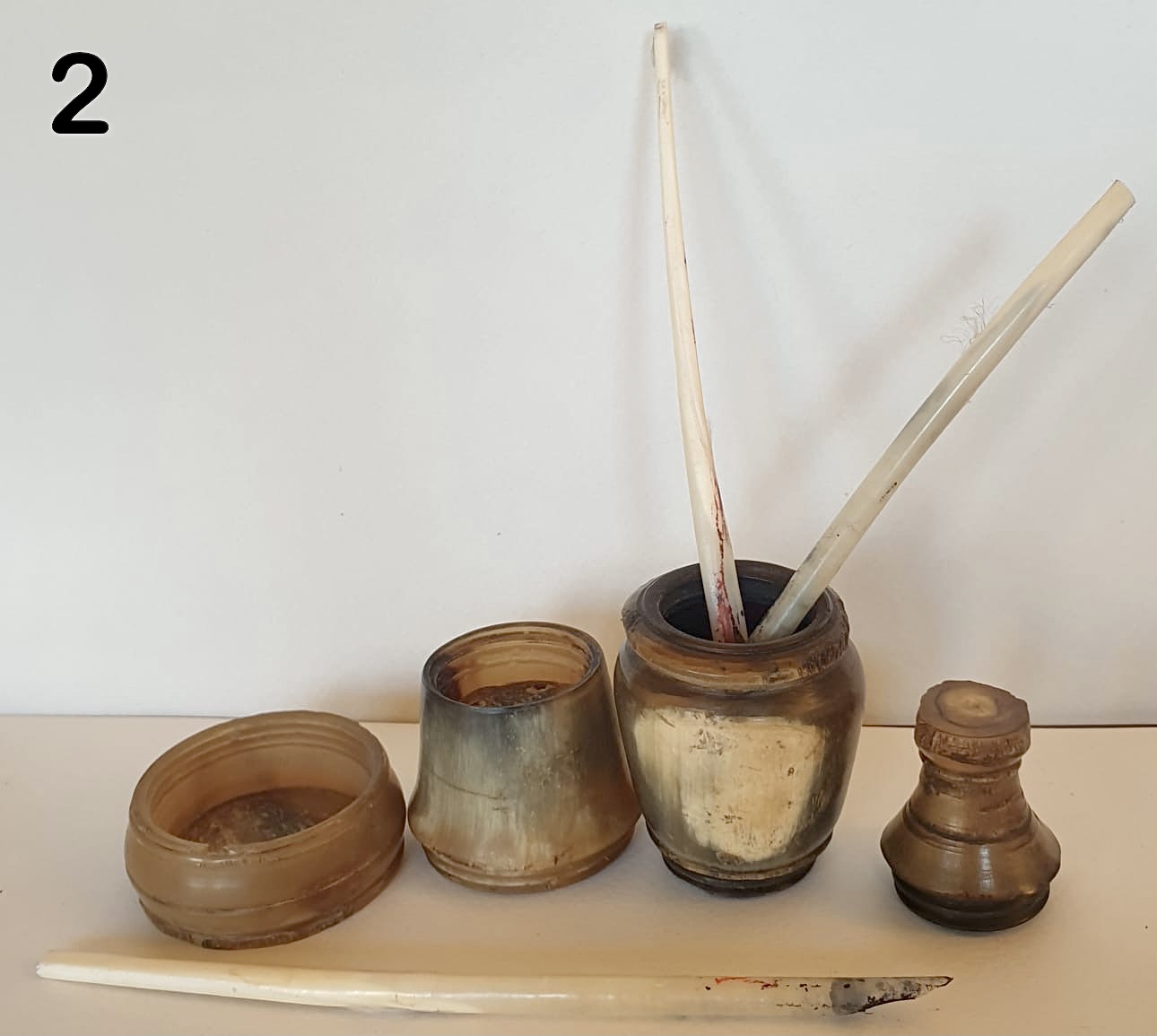 Un'altra delle mie "star" uniche! Foto 1: cinque/seicentesco penner in corno, da cintura. Foto 2: nel dettaglio, da sinistra: porta pennini d'oca (vedi foto 7), sandracchiera, calamaio, coperchio. Foto 3: sandracchiera. Foto 4: sandracchiera e calamaio. Foto 5: dettaglio del coperchio con la gola sede del mancante laccio per cintura. Foto 6: una confezione originale di penne d'oca. Foto 7: confezione di pennini d’oca. Foto 8: stupendo cinquecentesco, coltellino in avorio, argento ed acciaio, proveniente da casa dei nonni, a Montagnana.