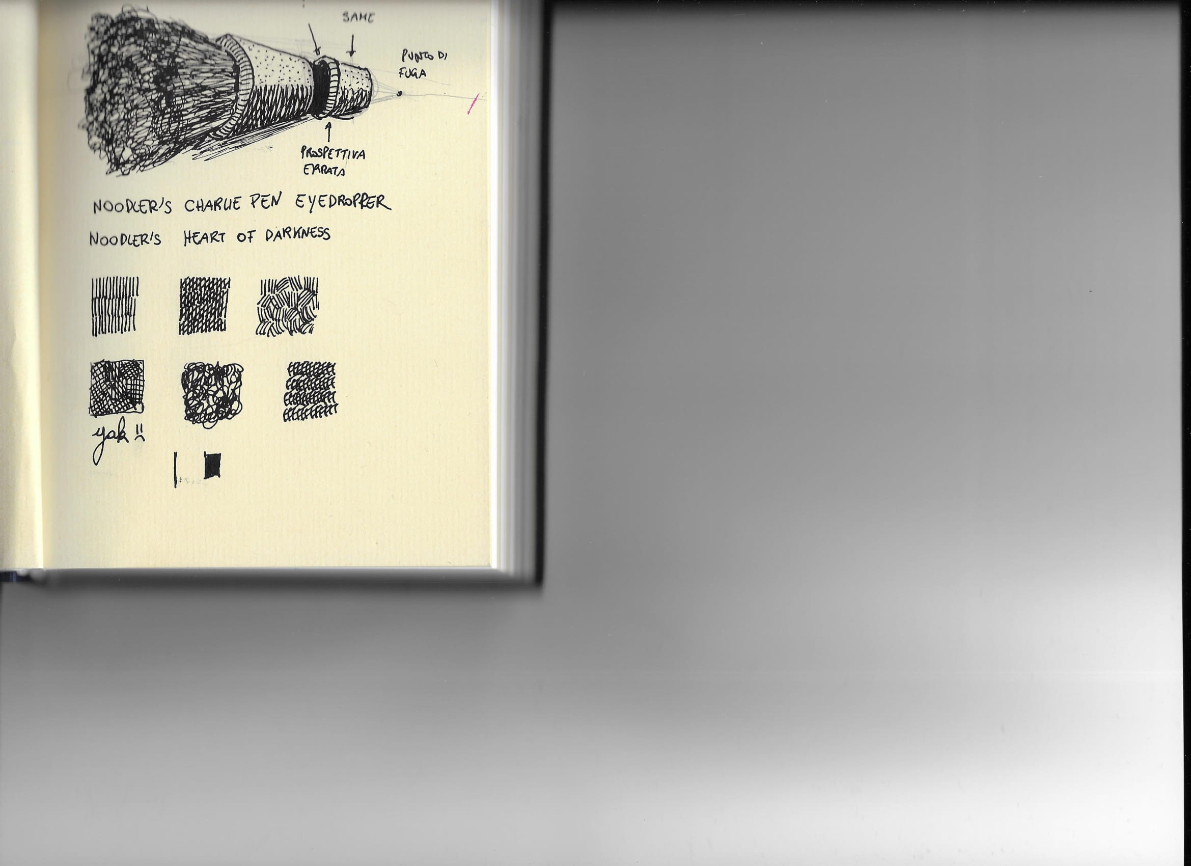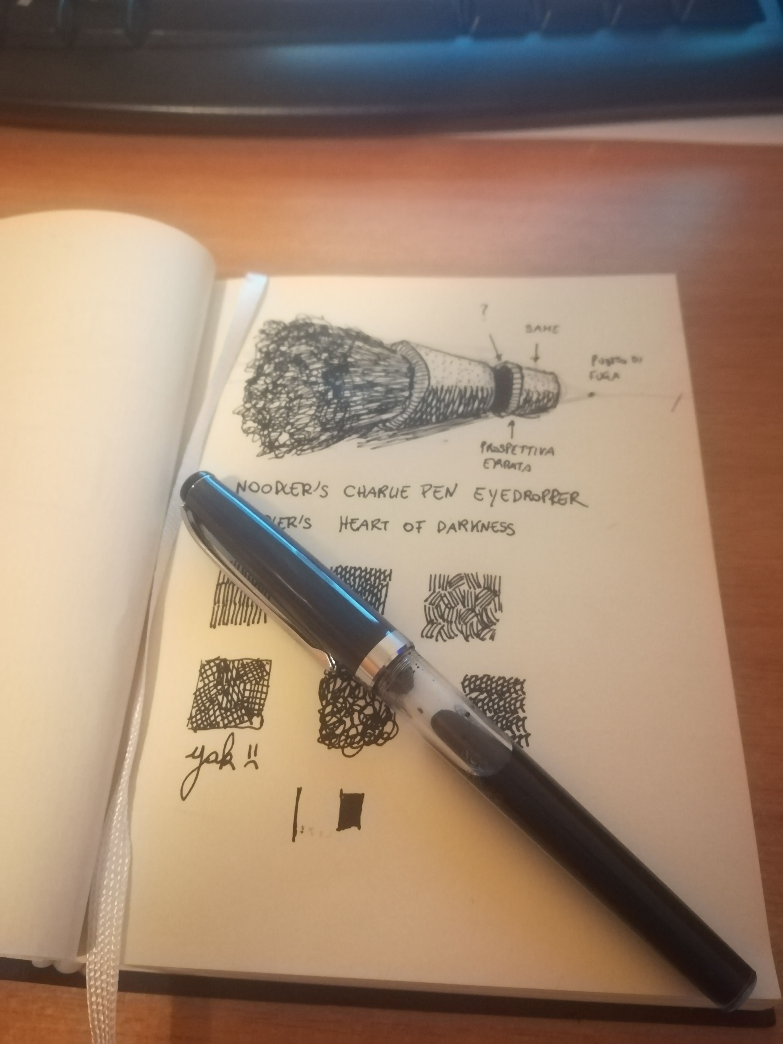 Vorrei semplicemente condividere una prova di "scrittura" fatta con il Noodler's Heart of Darkness e con la Charlie pen, la penna che viene omaggiata insieme a questo inchiostro. L'inchiostro mi piace molto e la penna fa il suo dovere e non gocciola finché la si mantiene carica per almeno un terzo della sua capienza massima. Mi intendo più di sequenze di 1 e 0 che di arte, nonostante ciò ogni tanto mi piace sporcare i fogli :lol: Purtroppo, per via del formato dello sketchbook (Fabriano Artist Journal piccolo e voluminoso), non sono riuscito a mettere a fuoco l'intera pagina con lo scanner.