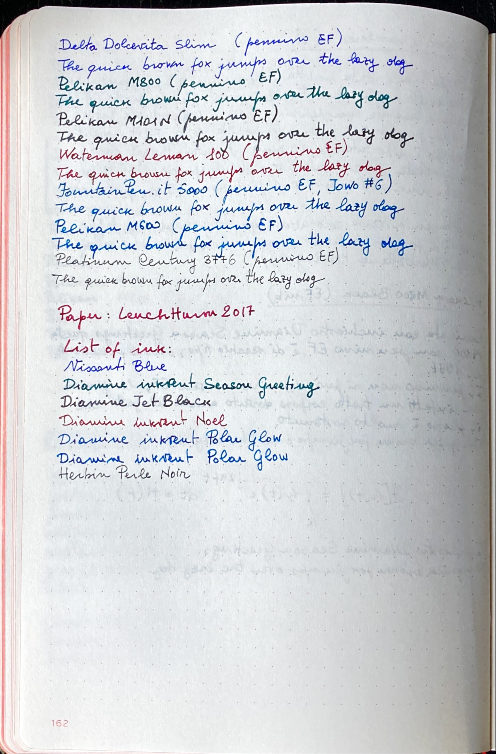 Il bloc notes in effetti è un Leuchtturm. Per quanto riguarda i confronti, oltre a Platinum, anche Delta, e Waterman scrivono sufficientemente sottile (diciamo un EF europeo), inoltre le uniche penne un po' penalizzate dall'espansione dell'inchiostro sono le due caricate a Polar Glow.