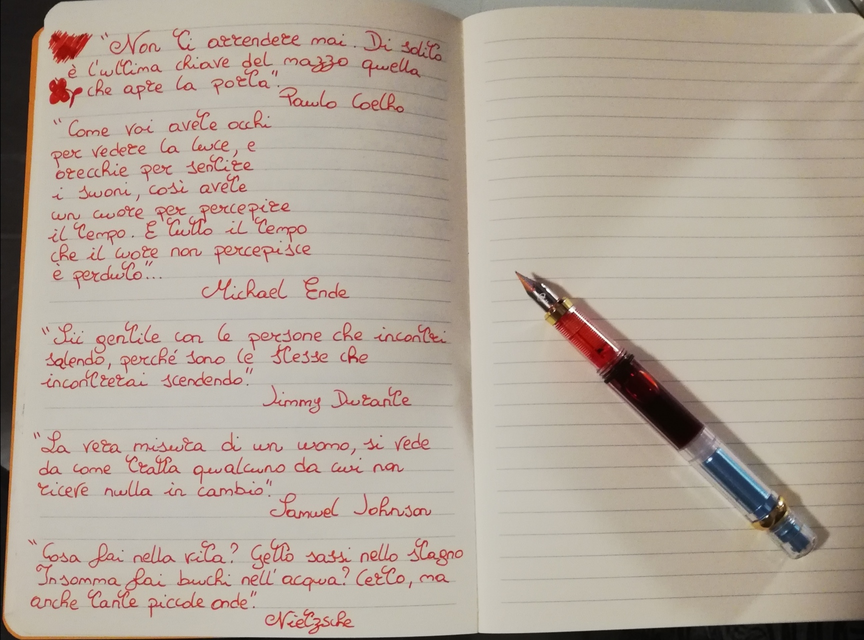 È un bel rosso brillante che resta tale anche su un foglio non bianco, l'asciugatura è rapida, non spiuma e anche se ho utilizzato una stilografica con un tratto fine, ho notato leggerissime sfumature.