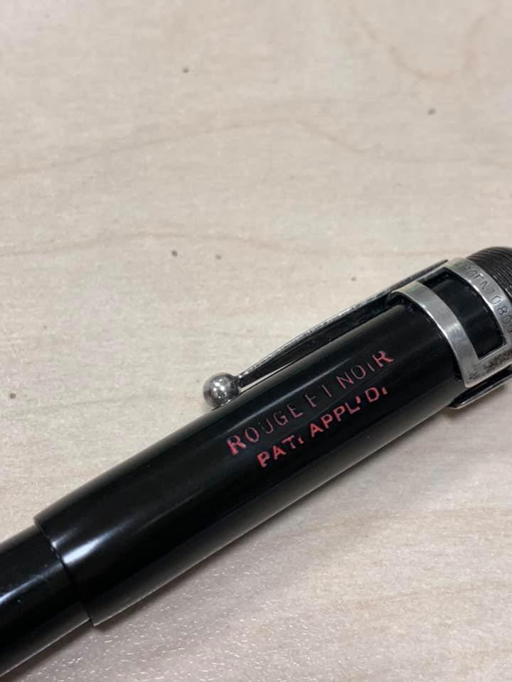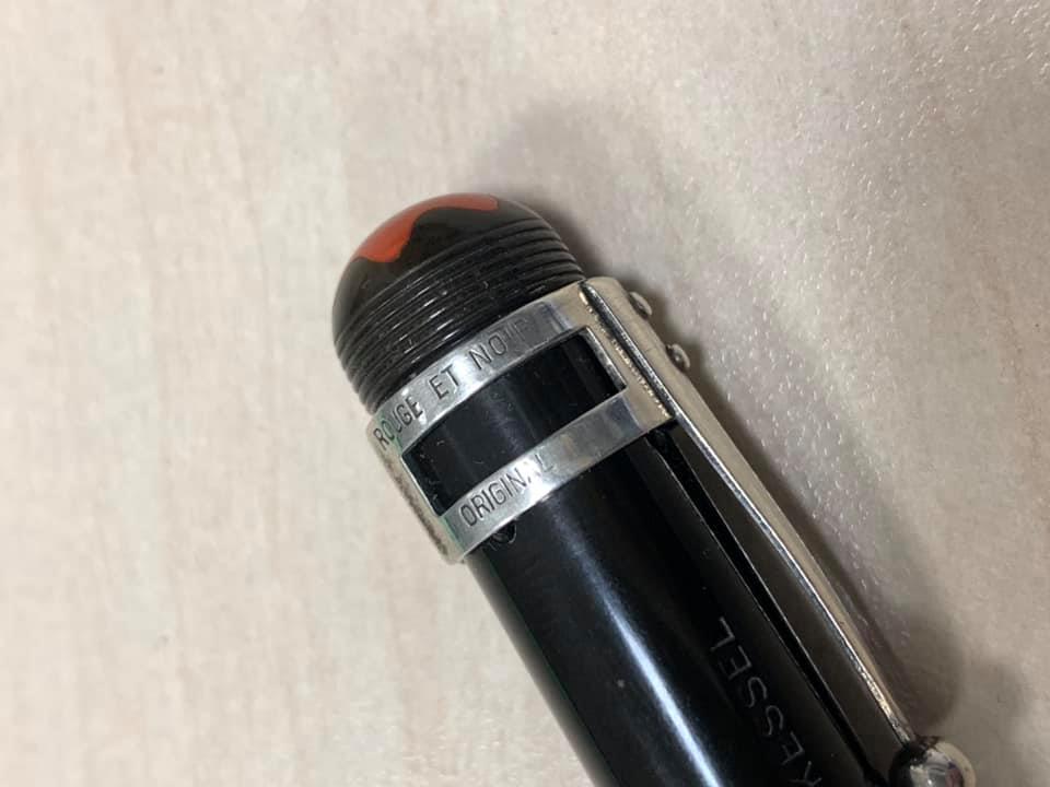 Da un lato, il cappuccio ha la scritta su due righe Rouge et Noir e sotto "patent applied". Non so a cosa si possa riferire il brevetto... forse lo spillo dentro il cappuccio per non far rovinare il pennino...