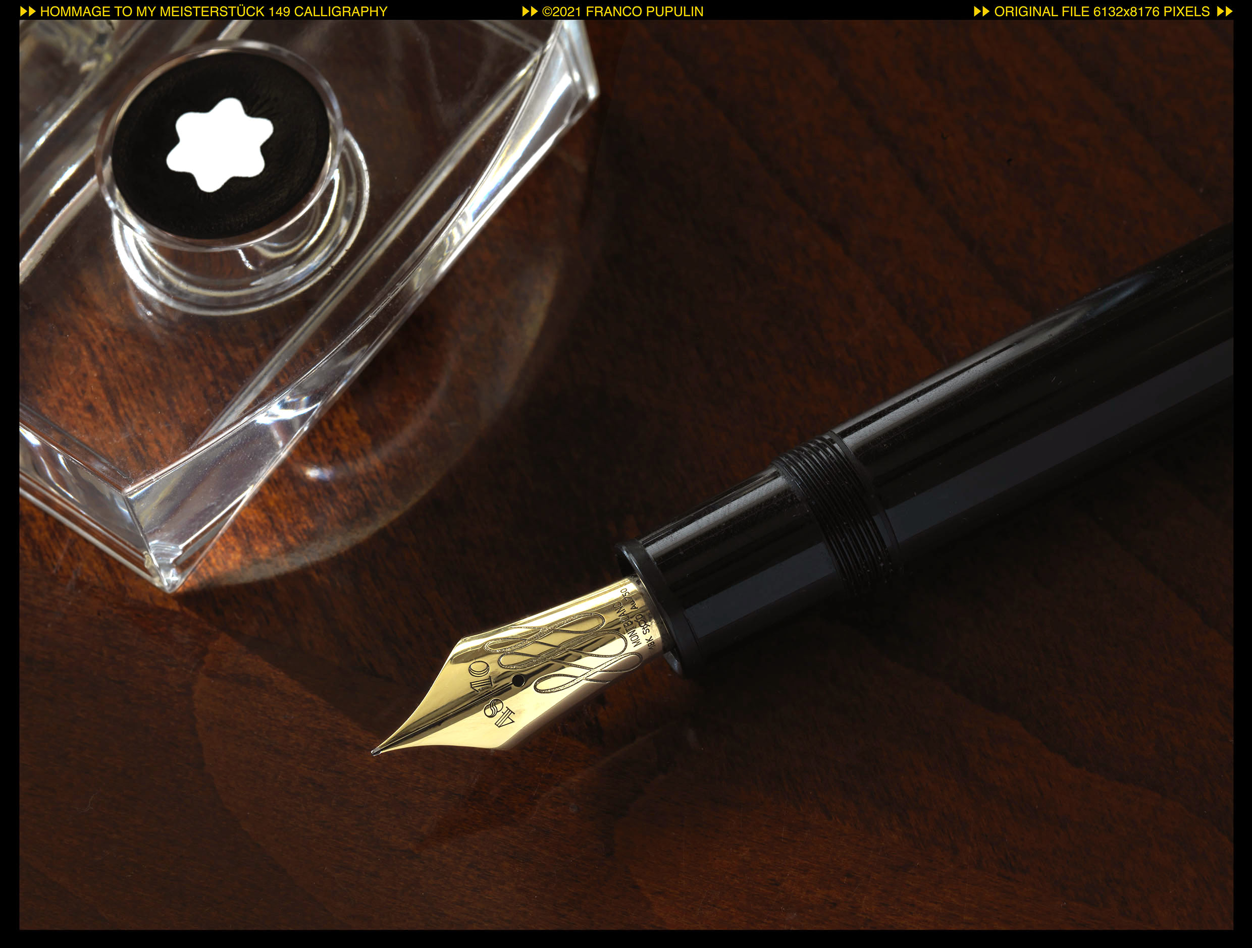 Sulla sinistra c'é una sola luce, data da un flash da 200W, dotato di una barndoor (é come una finestra con quattro alette che possono essere chiuse, come persiane, in forma indipendente, per limitare la diffusione della luce in una direzione specifica), anch'esso su un cavalletto. Sulla destra della penna, appena fuori dall'inquadratura, c'é un piccolo foglio di carta bianca piegato a "L" che serve da mini-riflettore per rinviare luce bianca verso il pennino.