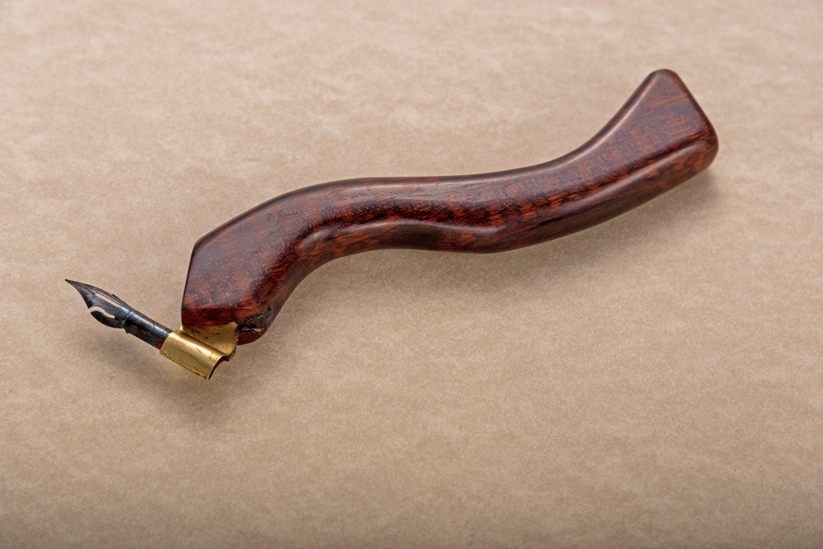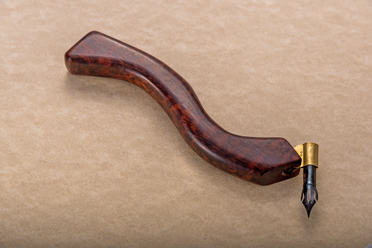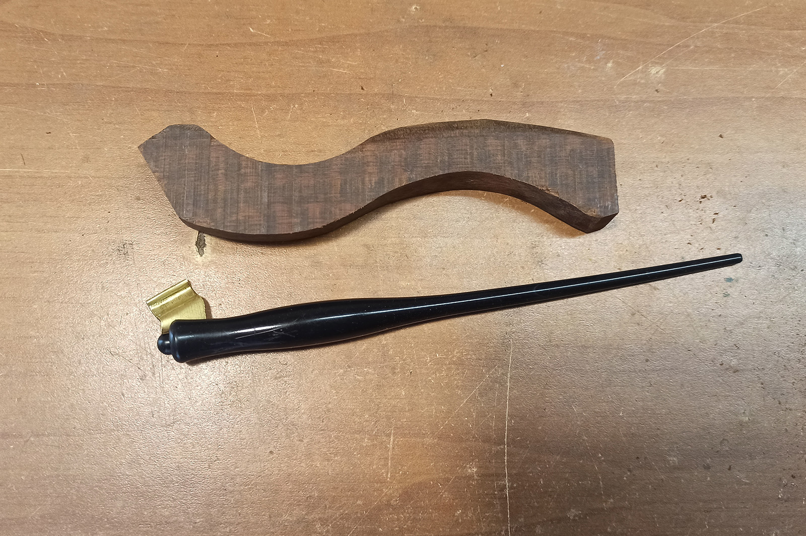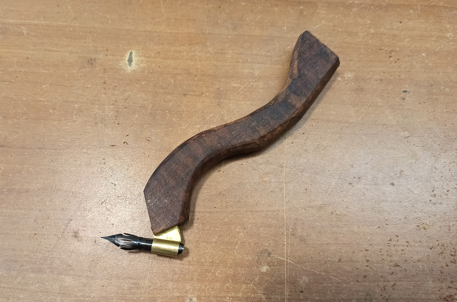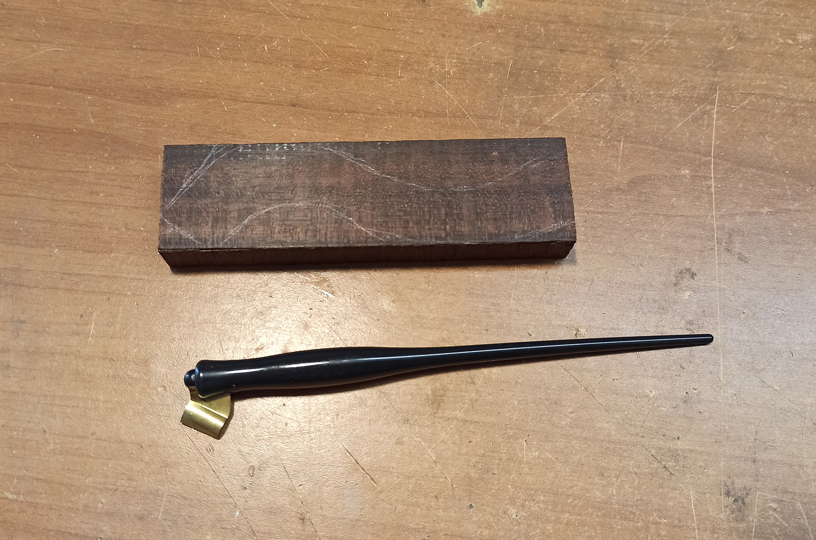 Per recuperare il porta pennino in ottone, ho cannibalizzato una cannuccia in plastica; come legno ho usato un pezzo di amoretto, conosciuto anche come legno serpente, un legno duro che non presenta porosità e che, una volta lucidato, sembra una radica.