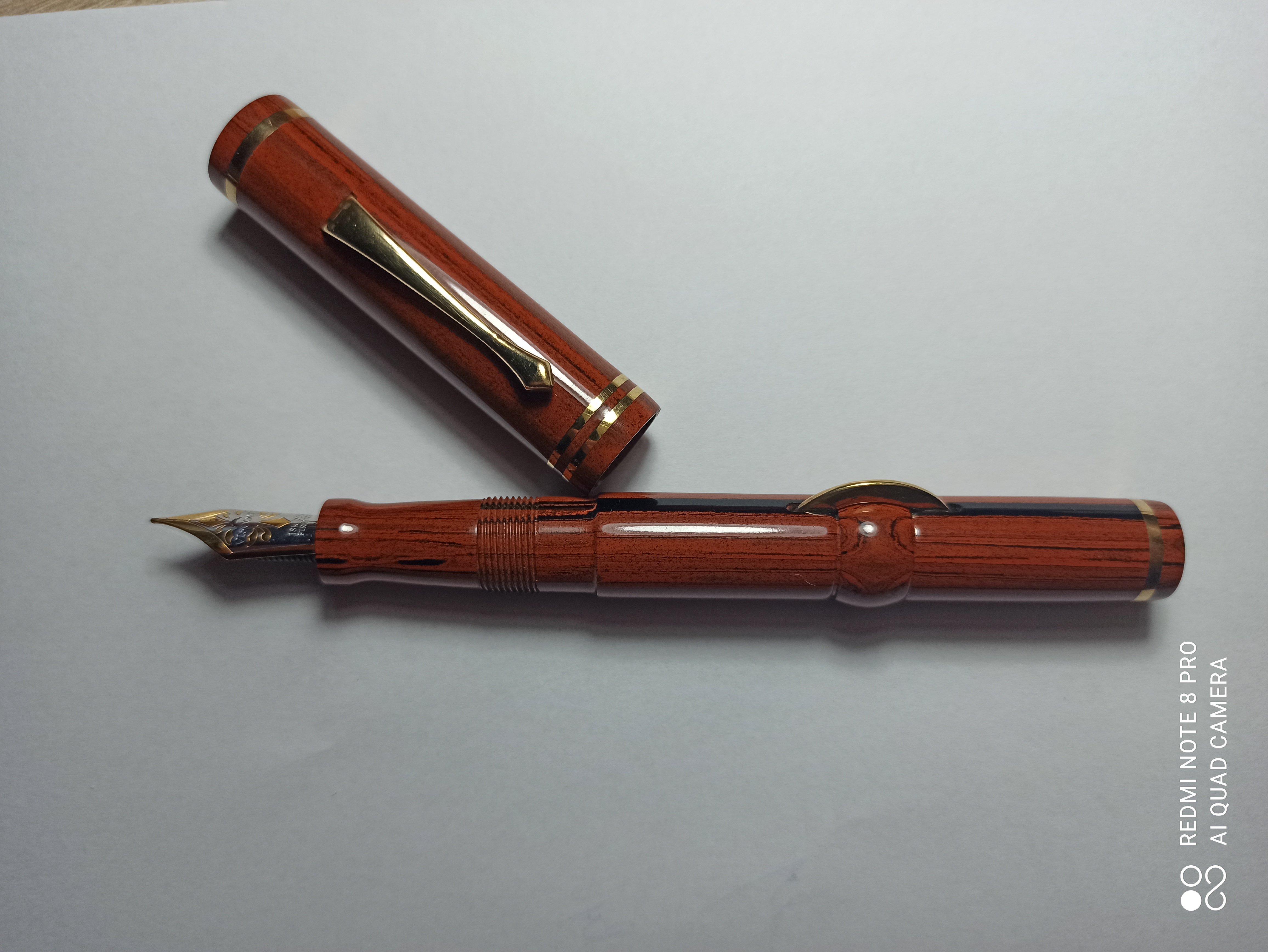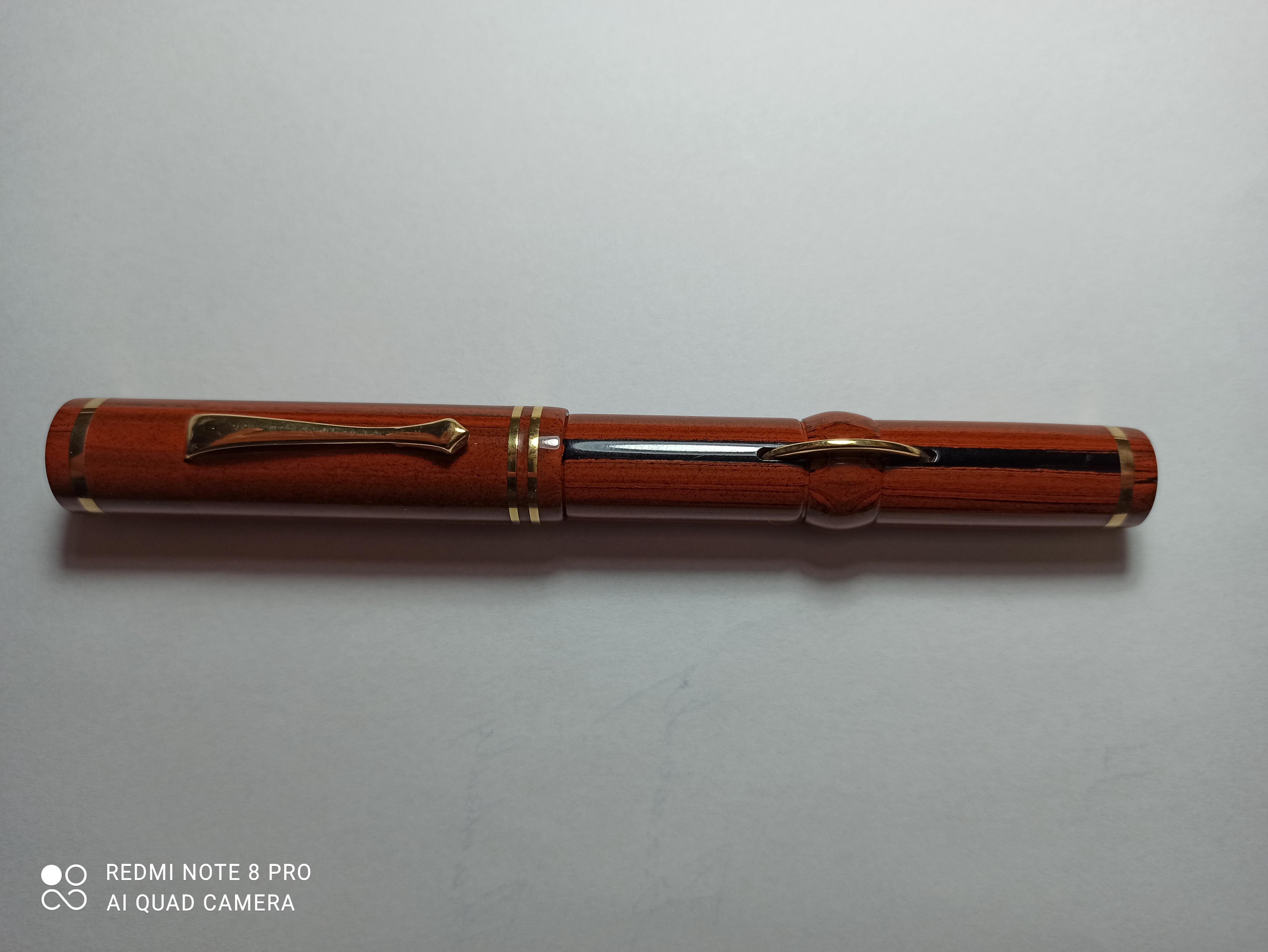 Mi fa tanto piacere l"interesse di tutti e vi ringrazi.Allora il crescent filler (mezzaluna in italiano)e invetato dalla Conklin all inizio dello secolo scorso e Visconti l"ha riprodotto sulla Copernicus (per chi forse non lo conosce) io l"ho fatto sopratutto(opinone personale) per la bellezza che ha e non la praticita .Se qualquno desidera una posso farla pero ho bisogno di un po di tempo ed il motivo e il mio lavoro (dentista so che a nessuno non piace ha ha)ultimo non so se e permesso dal forum di dare il mio email .La penna puo essere fatta con qualsiasi materiale ebonite oppure acrylico e se non piace il crescent filler con altri sistemi di caricamento
