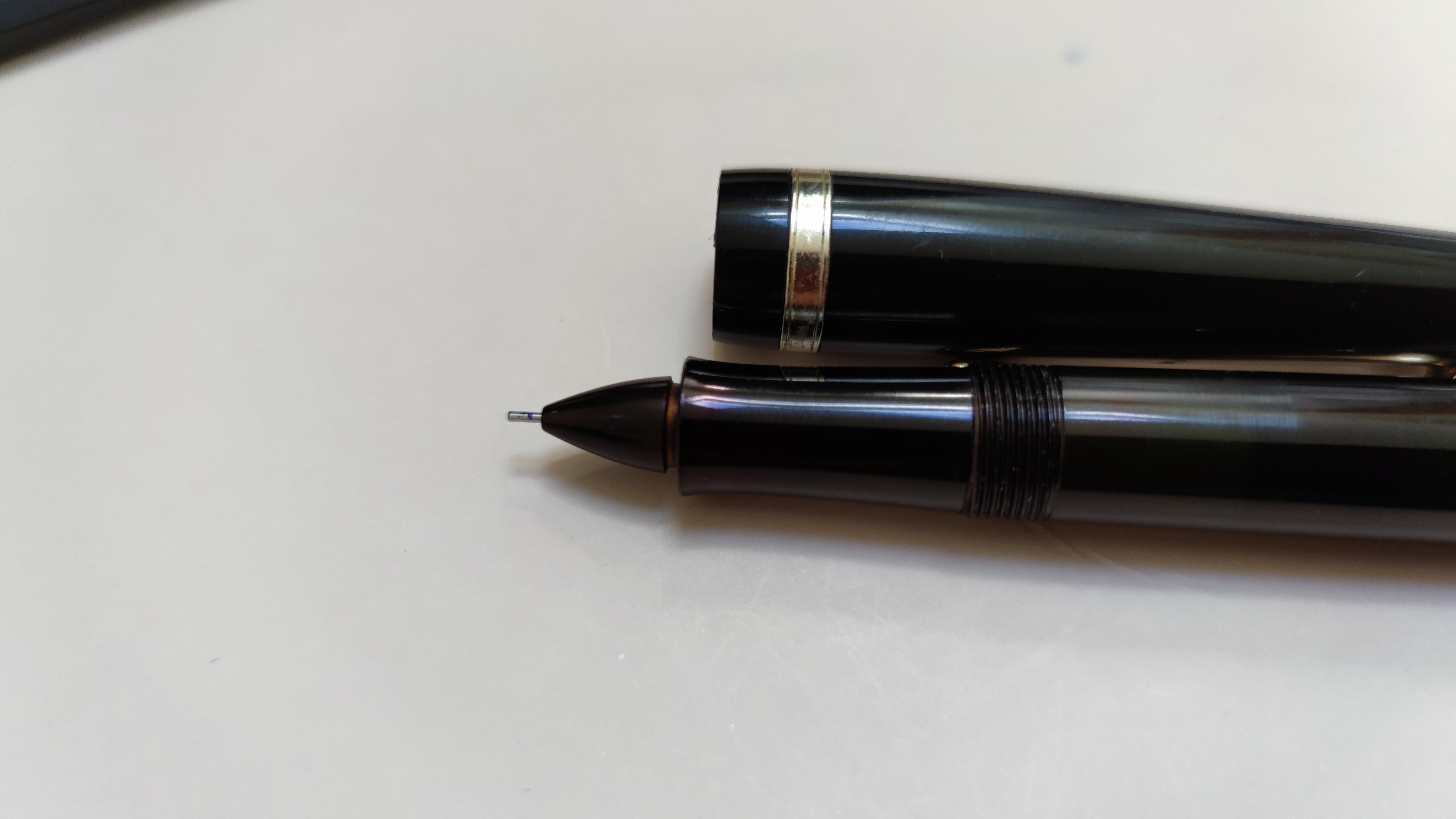 2) il pennino ha all'interno uno piccolo stantuffo flottante (l'ungo l'asse della penna) con inserito un filo di acciaio che si inserisce nel condotto del pennino (se agiti la penna si dovrebbe sentire il rumore dello stantuffo che urta contro la parte superiore e inferiore del pennino). Se il filo manca al pennino giunge più inchiostro.