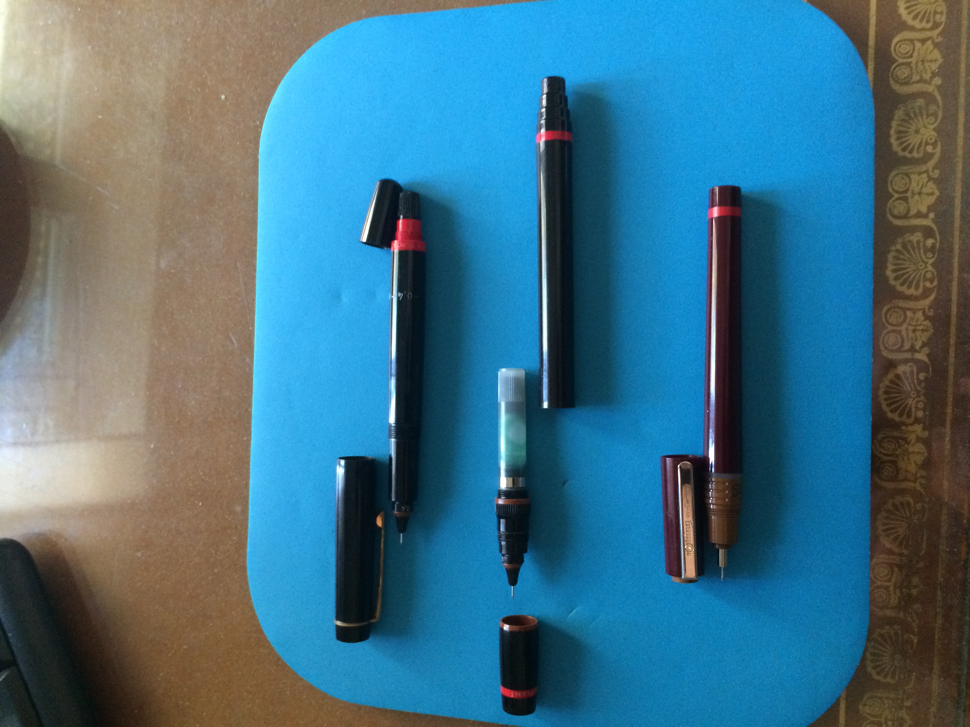 Il terzo un rapidograph più moderno (forse l'ultima variante) con cartuccia più articolata e sicura (si avvita e non si calza):