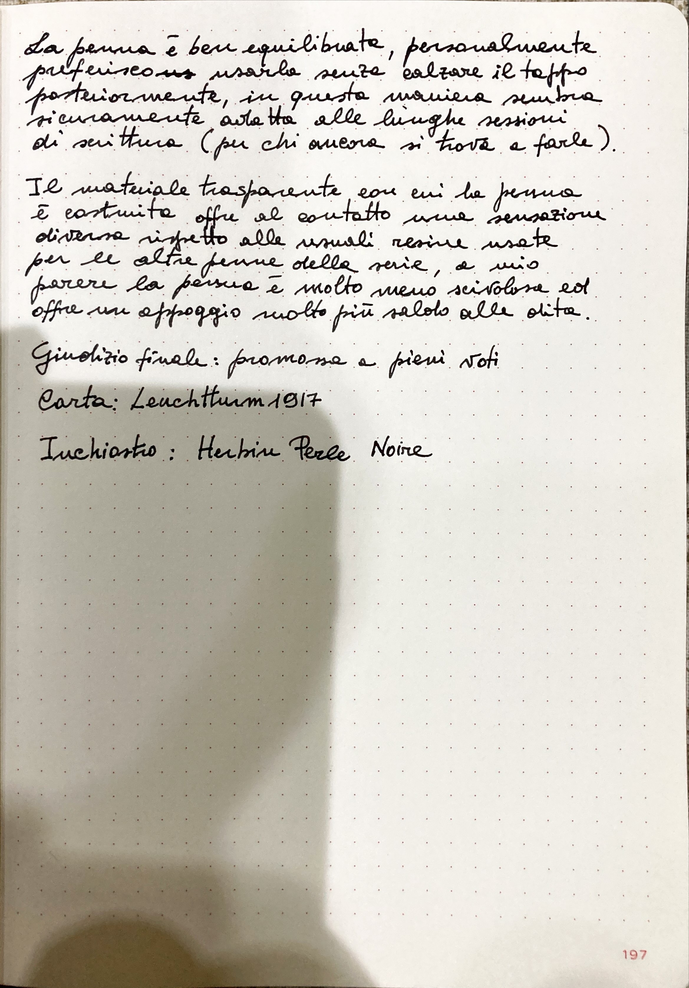 Ottima recensione. Riguardo alla penna, credo di preferire quelle con resine più fantasiose, ma anche quelle più semplici ma opache. Tutto questo in foto e in osservazioni in vetrina, non le ho mai provate quindi il mio parere è poco circostanziato. Ma in genere preferisco le penne opache a quelle trasparenti o traslucide, sono un po' di parte