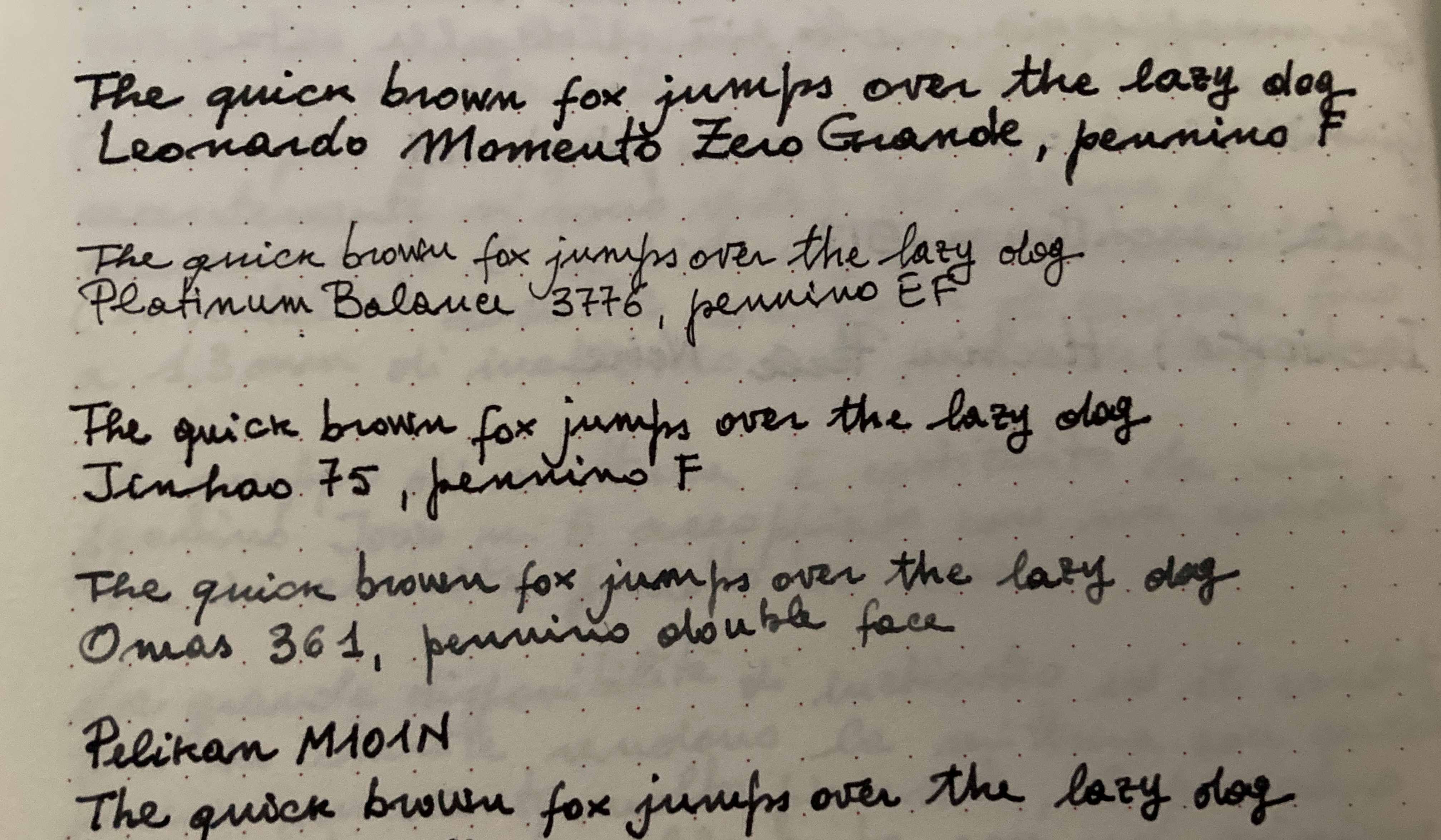 Ecco un confronto tra il tratto della MZG con quello di altri pennini (il pennino della M101N è un EF).