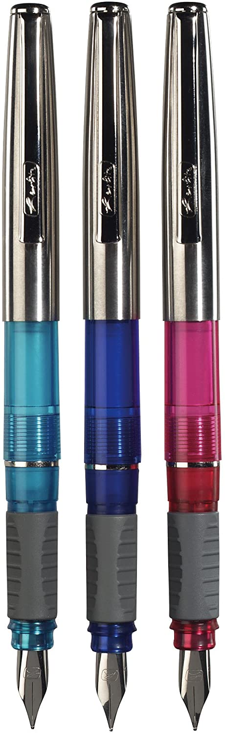 Penna stilografica con pennino in acciaio rinforzato M ed elegante decorazione del fusto. Cartucce d'inchiostro standard blu reale cancellabile. Adatta sia per mancini che per destrorsi. Spessore del tratto M.