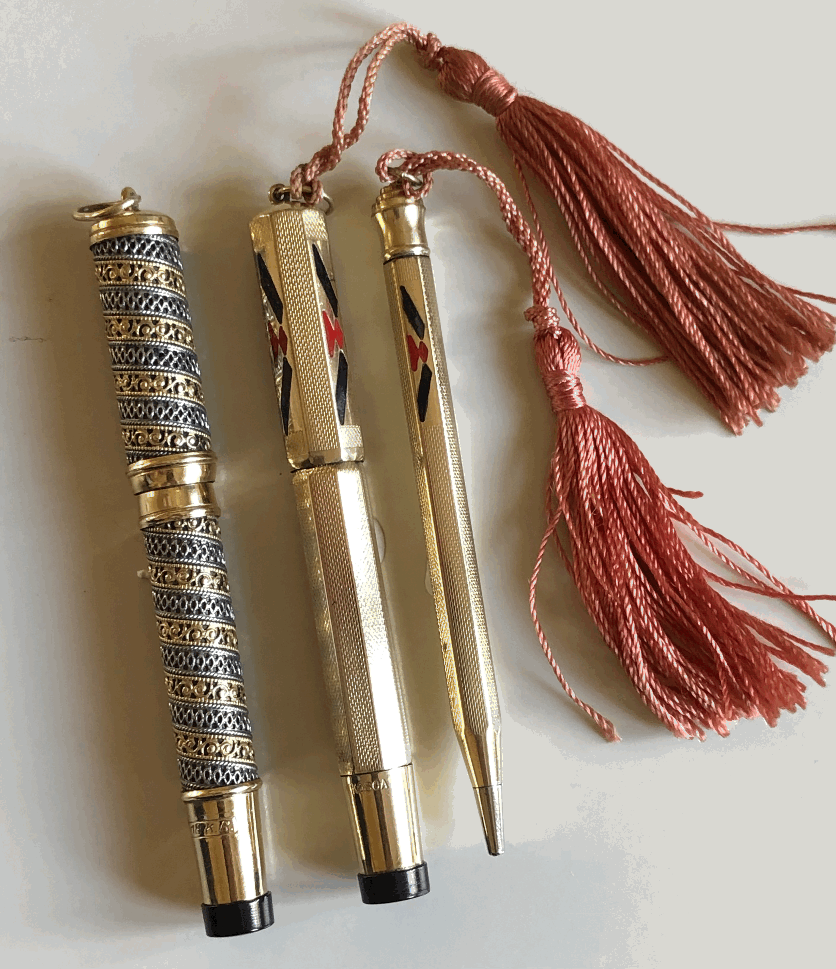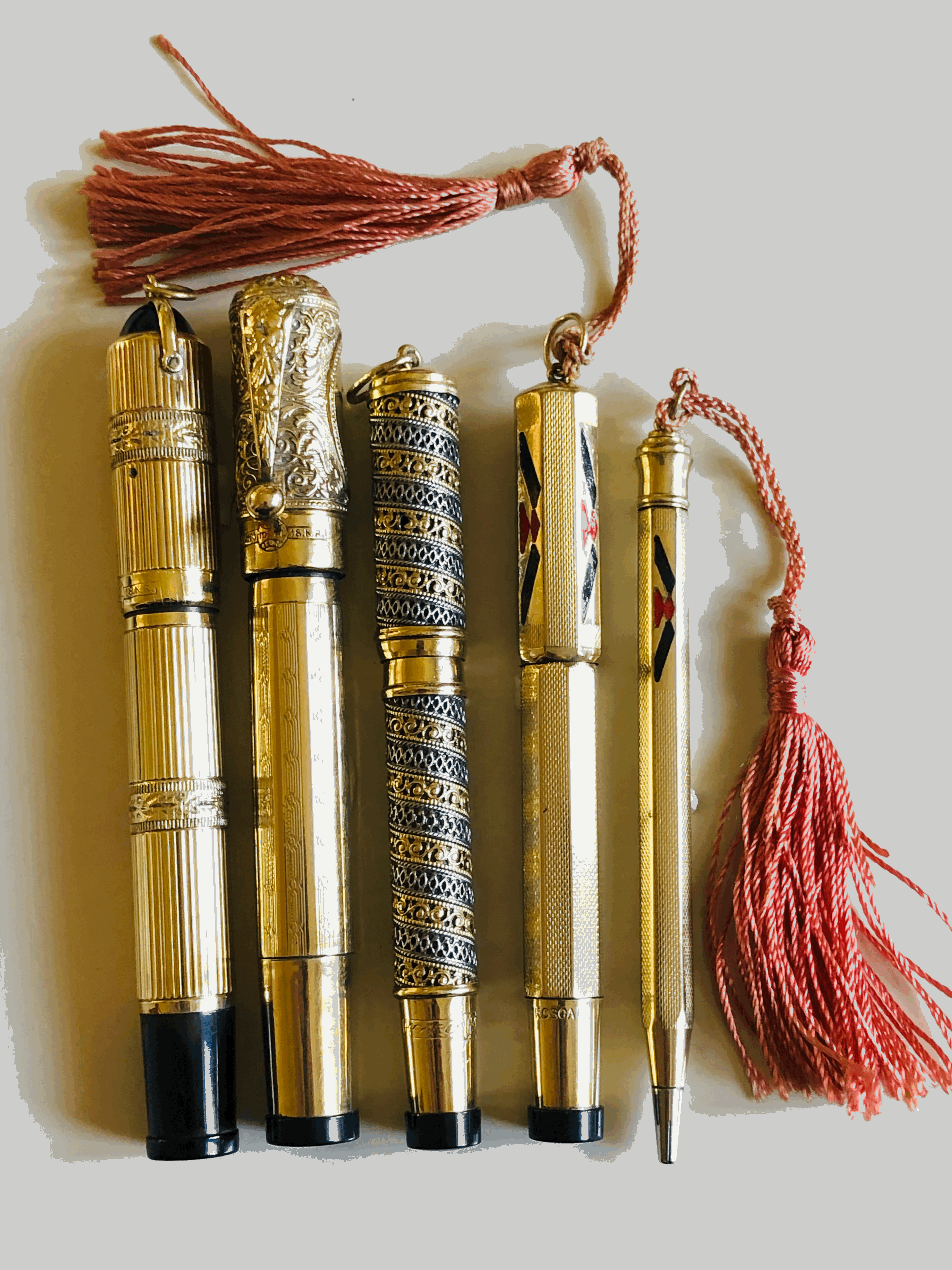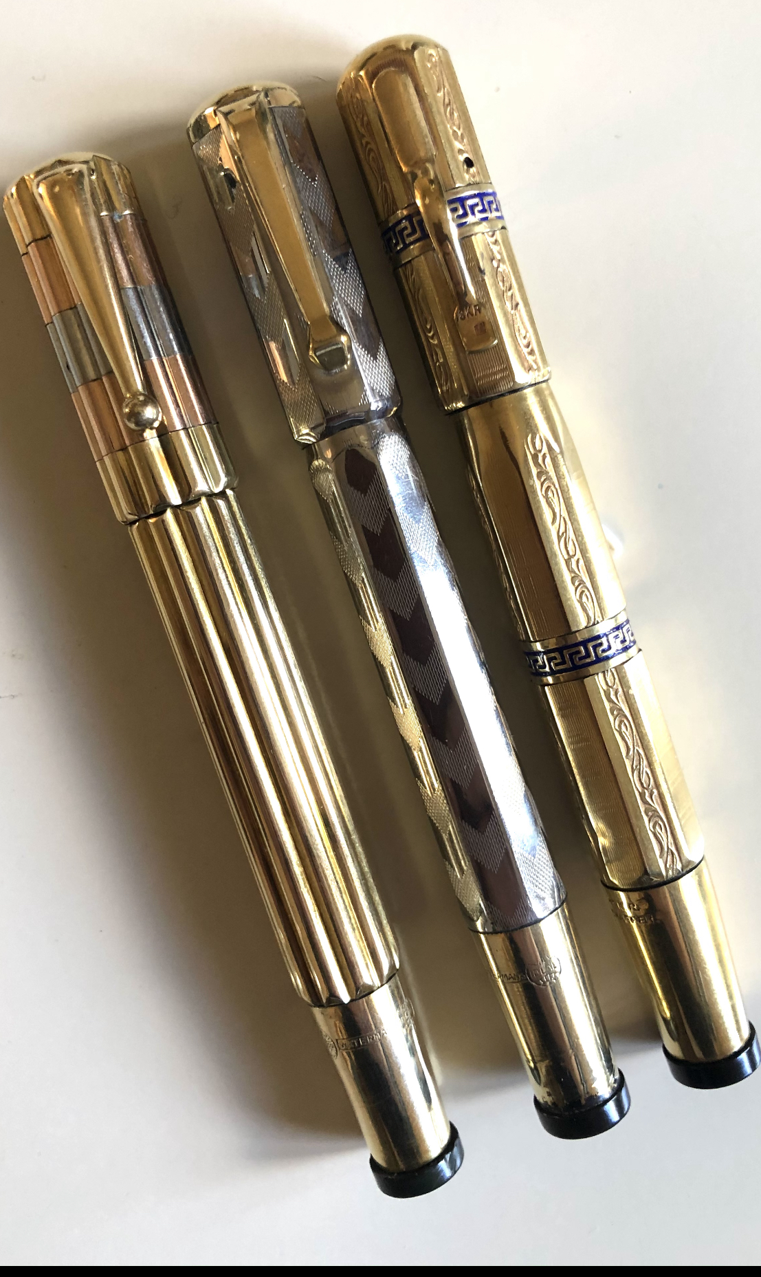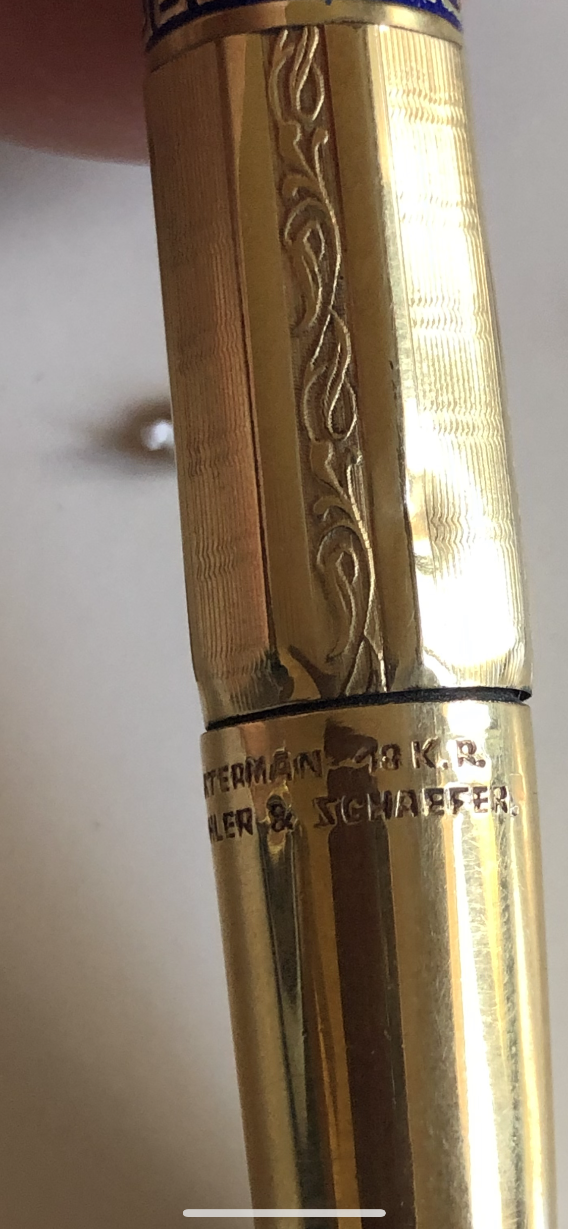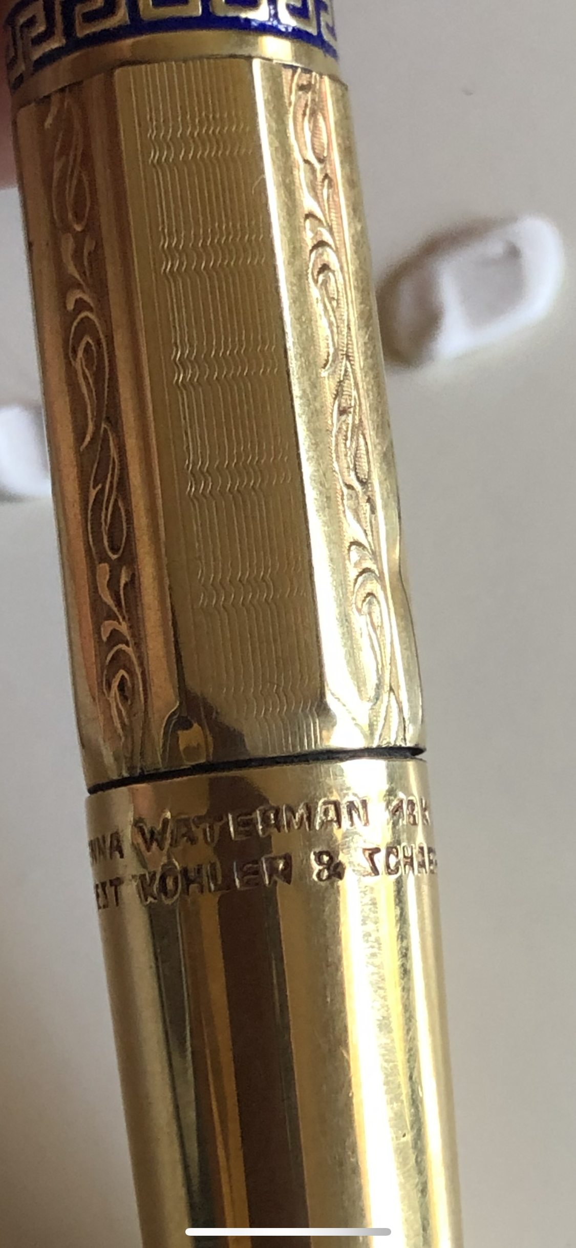 La terza penna con le greche in smalto blu però, pur essendo una Waterman 42, ha inciso sul fondello la specifica che il rivestimento è stato effettuato da Koska, ossia si rimarca questo particolare ufficialmente.