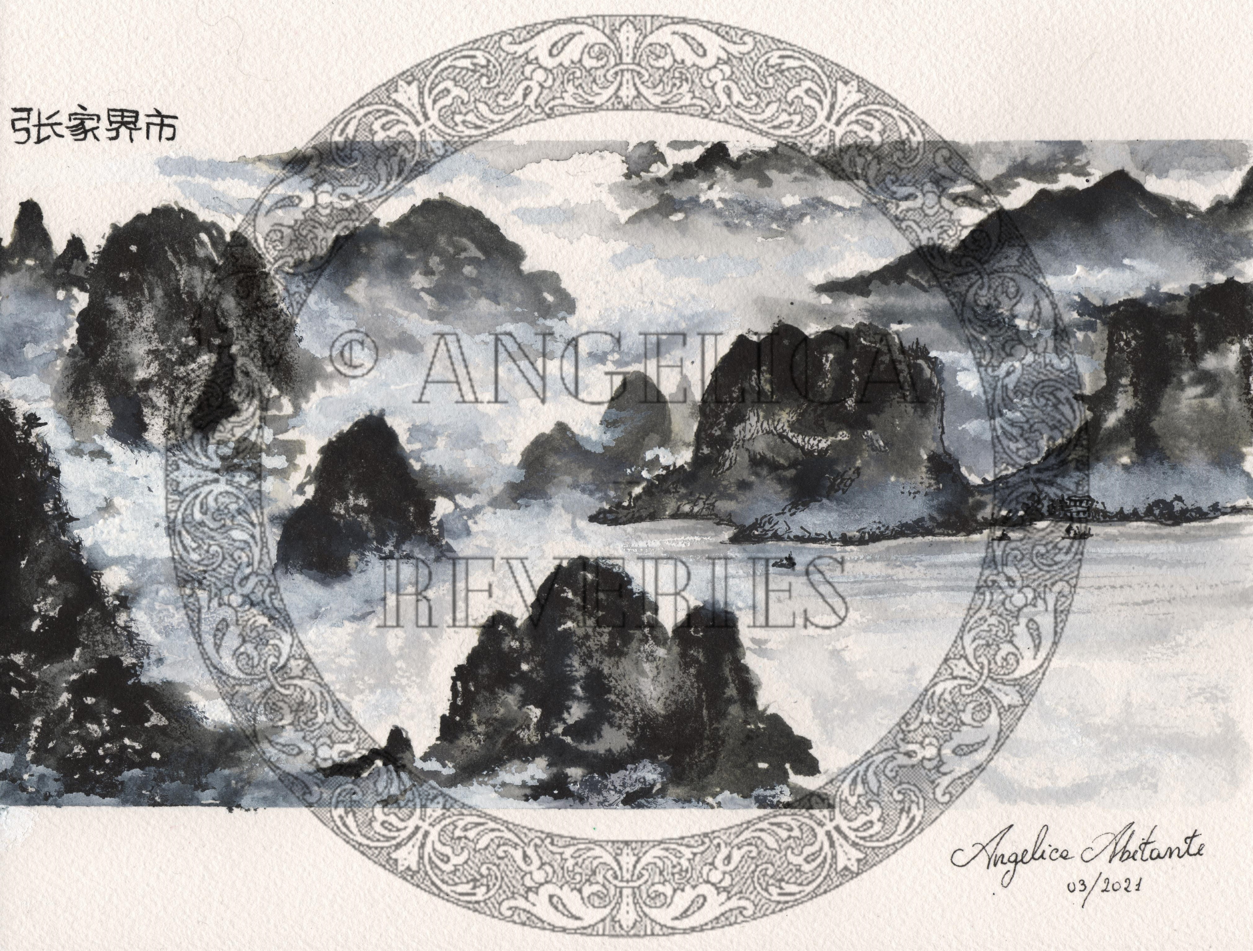 Ritrae il meraviglioso parco nazionale cinese di Zhangjiajie, sul cui sito ho trovato il dipinto al quale mi sono ispirata.