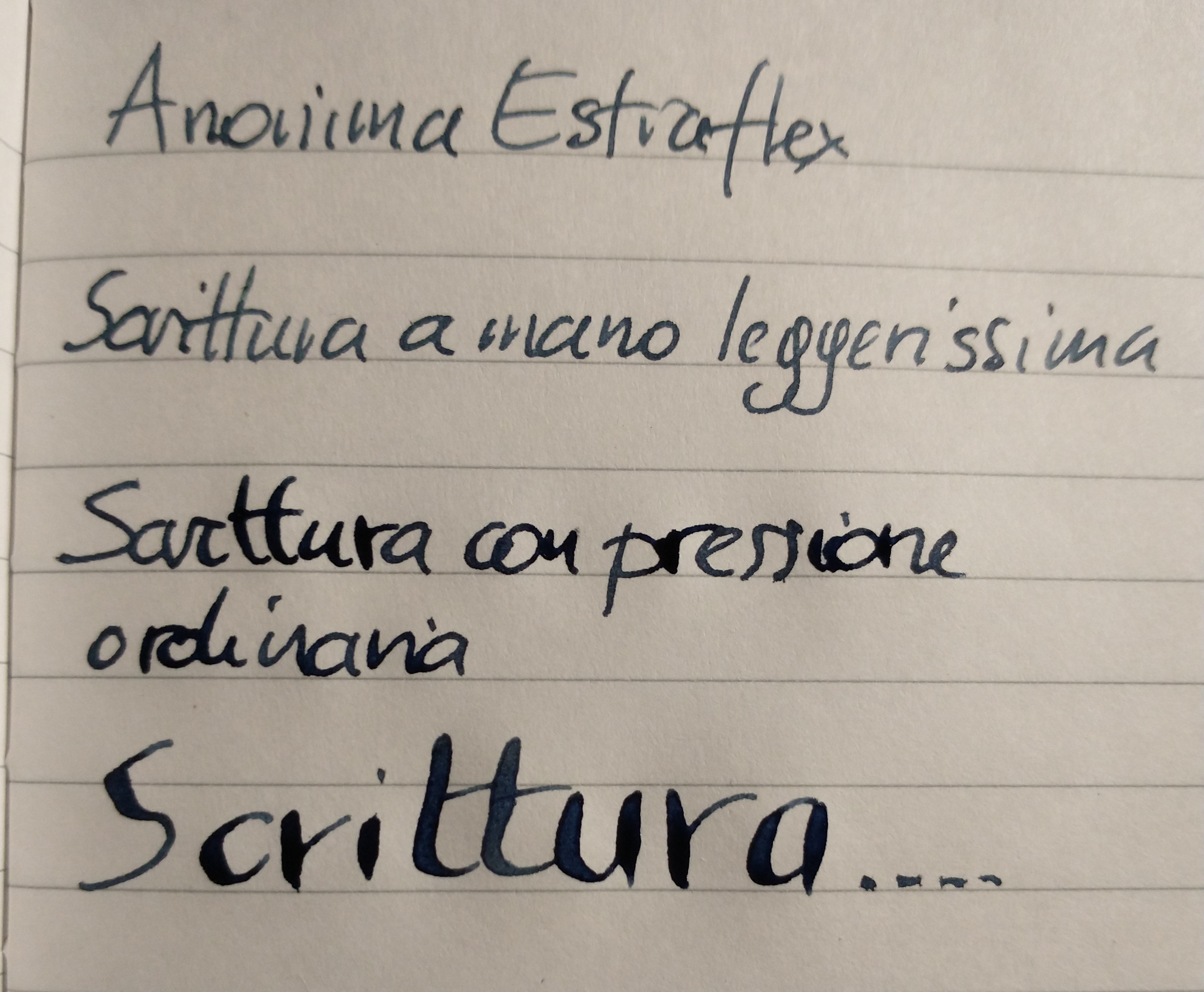 Quella che mi piace di più è l'anonima, mentre il tratto spesso della Wahl non mi piace per nulla, noto parecchio e fastidioso spiumaggio (sarà colpa della carta o dell'ichiostro immagino)piccardi ha scritto: ↑domenica 4 aprile 2021, 23:27 Aggiungo qualche esempio (premetto che ho la mano molto leggera, quando dico pressione ordinaria, è la mia pressione ordinaria, che non è molta). Prima una Justus 95, al massimo di morbidezza: